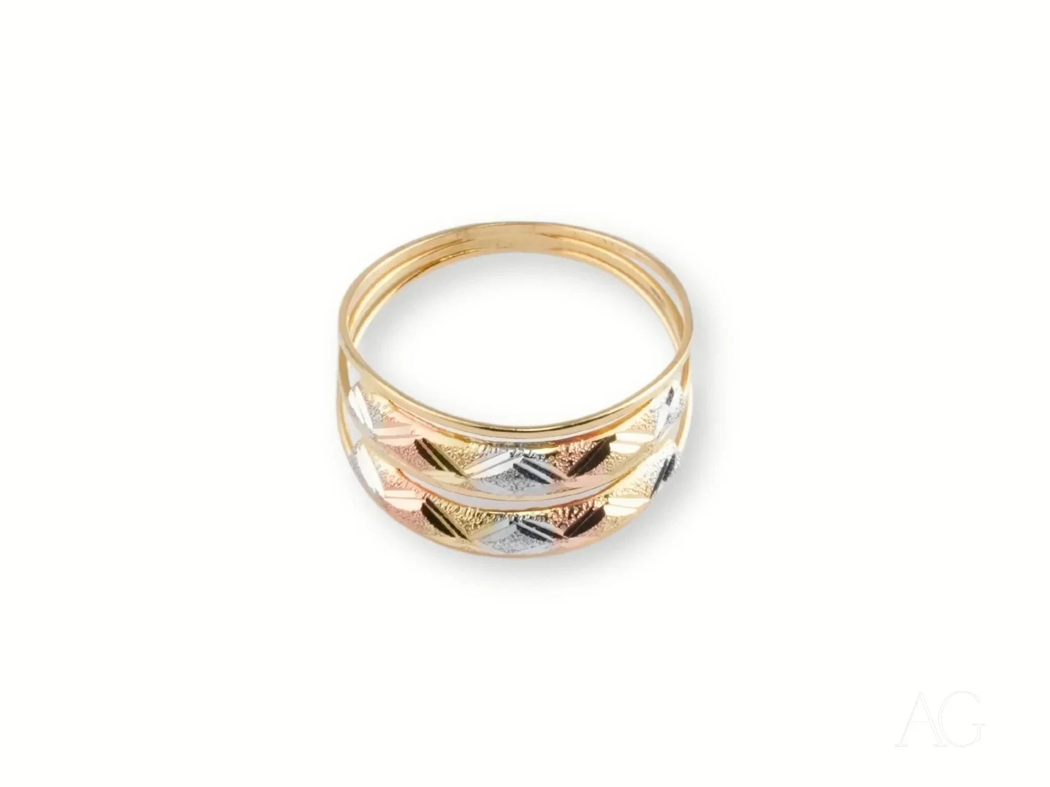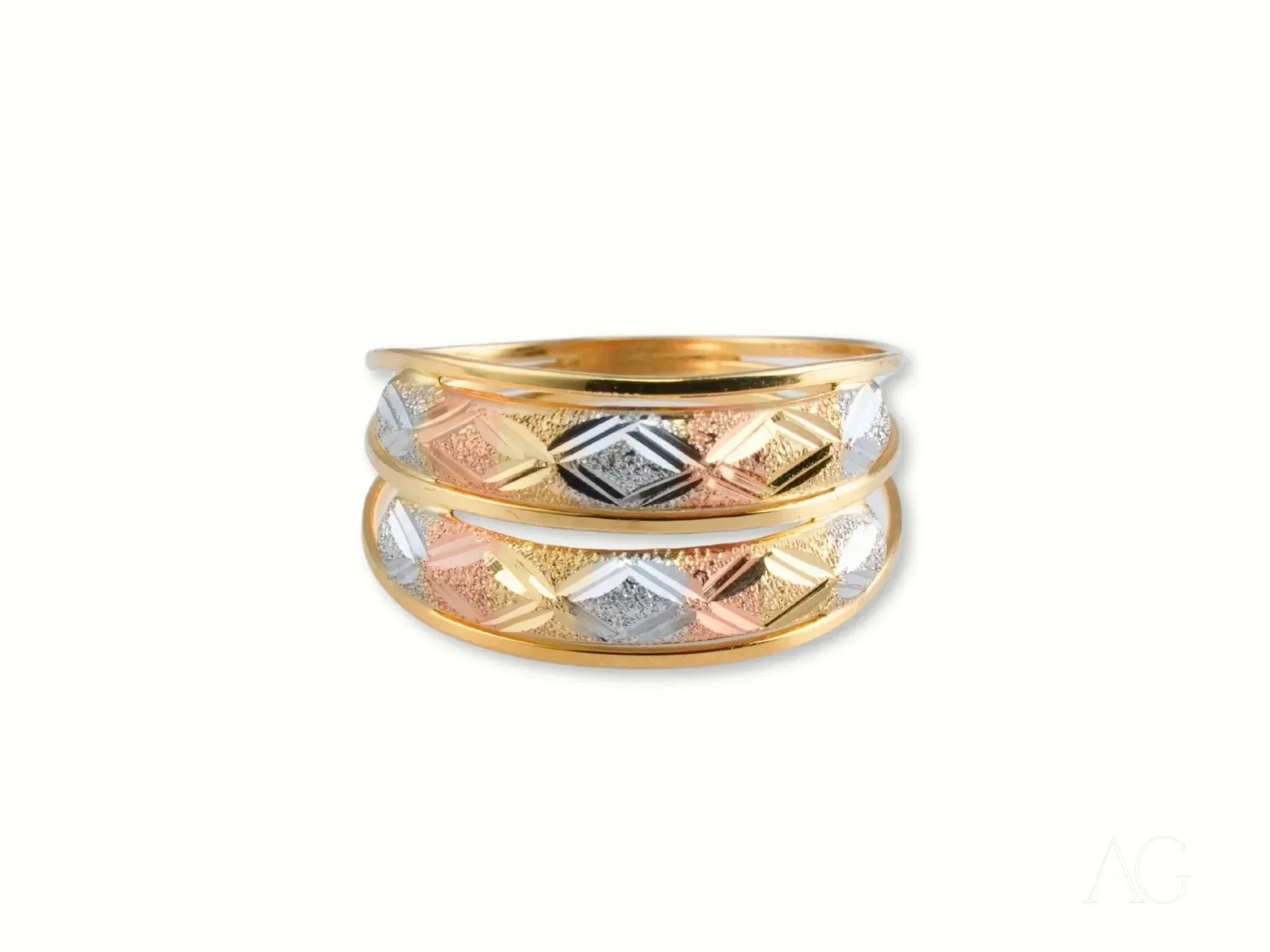 The tri-tone design of this 18k 3-tone ring offers unparalleled versatility. It complements any gold jewelry in your collection, creating a harmonious and captivating interplay of colors.