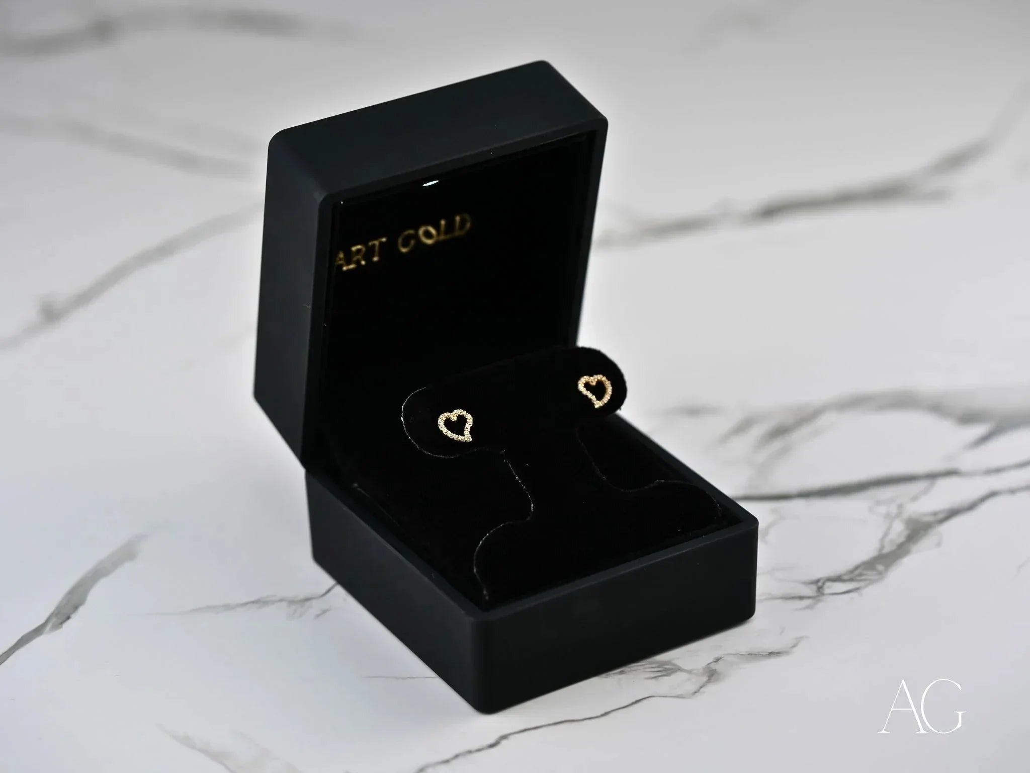 Ignite a spark of romance and add dazzling brilliance to your jewelry collection with the Sparkling Heart: 18k Gold CZ Heart Earrings. These exquisitely delicate earrings showcase a beautifully crafted open-heart design, each facet adorned with dazzling, hand-set cubic zirconia stones that capture and reflect light with breathtaking intensity. Crafted from luminous 18k gold, these luxurious yet lightweight earrings (just 0.7 grams!) offer unparalleled comfort and elegance, perfect for illuminating everyday moments or adding a touch of magic to special occasions. Experience the allure of art gold jewelry with these captivating heart earrings.