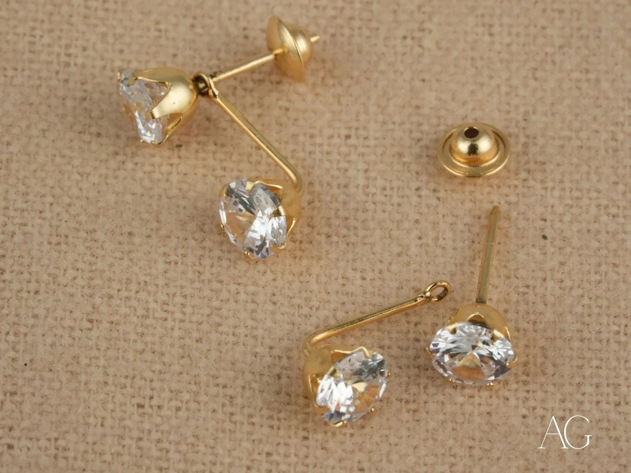 18K Gold Craftsmanship – Luxurious 18K gold ensures durability, a radiant shine, and hypoallergenic comfort for all-day wear. This art gold piece is an investment in timeless elegance.Double CZ Brilliance – Two dazzling cubic zirconia stones per earring create a captivating layered sparkle, maximizing light reflection for an unparalleled dazzle duo effect.Detachable Design – Enjoy versatile styling options. Wear both CZ stones for maximum impact, or detach the bottom stone for a more understated single stud look. This 18k gold double design adapts to your every mood.Secure Screw-Back Closure – A secure screw-back closure ensures a snug and worry-free fit, keeping your precious art gold jewelry safely in place all day and night.Versatile & Timeless – These 18k gold double CZ earrings are a true jewelry box essential, effortlessly transitioning from everyday elegance to special occasion glamour.