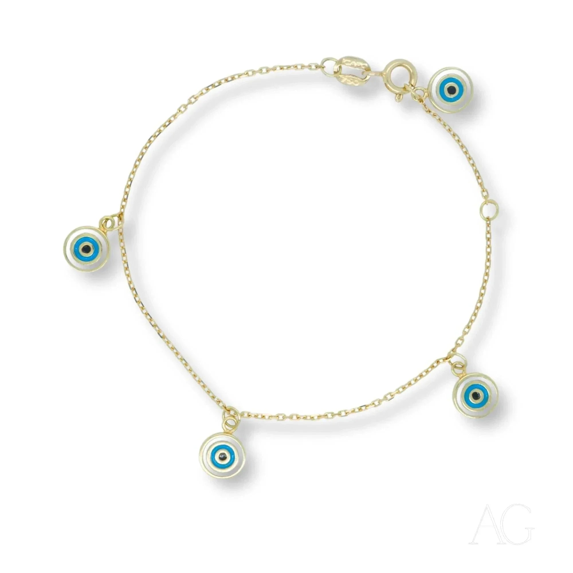Radiant Evil Eye Charm: The centerpiece of this bracelet is a meticulously crafted evil eye charm, believed to deflect negativity and usher in good fortune. Its vibrant design adds a touch of mystique and wonder to this precious piece of art gold.Gentle Embrace for Delicate Wrists: Designed with comfort in mind, this gold evil eye bracelet sits gently on small wrists, allowing for unrestricted play and movement. Contact us for adjustments to ensure a perfect fit as they grow.Enduring Quality, Heirloom Potential: Crafted from premium 18k gold, this bracelet is built to withstand the tests of time and childhood adventures. Its durability ensures it can become a cherished keepsake, passed down through generations, carrying with it the enduring power of love and protection.