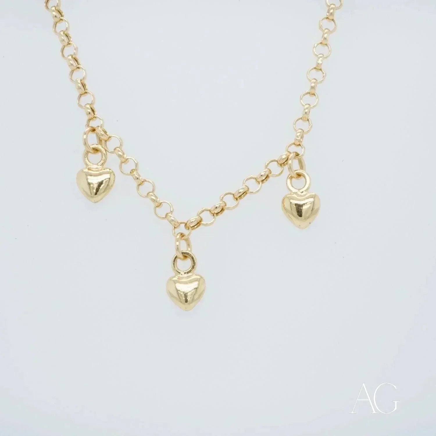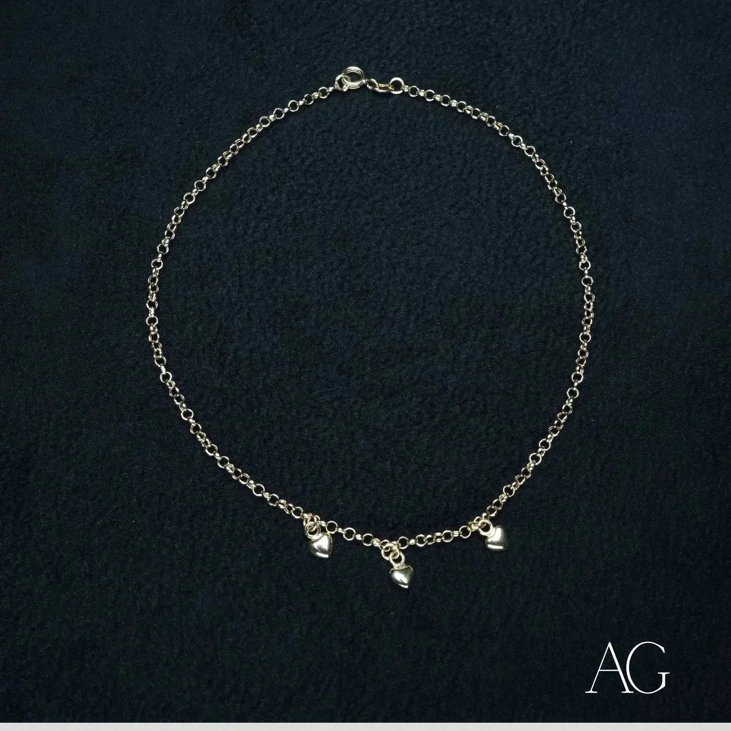 A Trio of Love and Luxury Prepare to be mesmerized! Unveiling a captivating creation, a true testament to love's elegance – our 18k Gold Anklet, adorned with three exquisite heart charms. More than just an accessory, this 18k gold anklet is a wearable celebration of affection and sophisticated style. Designed for those who express their love boldly yet gracefully, it allows you to wear your heart not just on your sleeve, but also with a delicate shimmer around your ankle. Each meticulously crafted 18k gold heart charm whispers a tale of enduring love and the timeless allure of art gold jewelry. Imagine the warm caress of gold against your skin, a subtle reminder of life's precious moments.