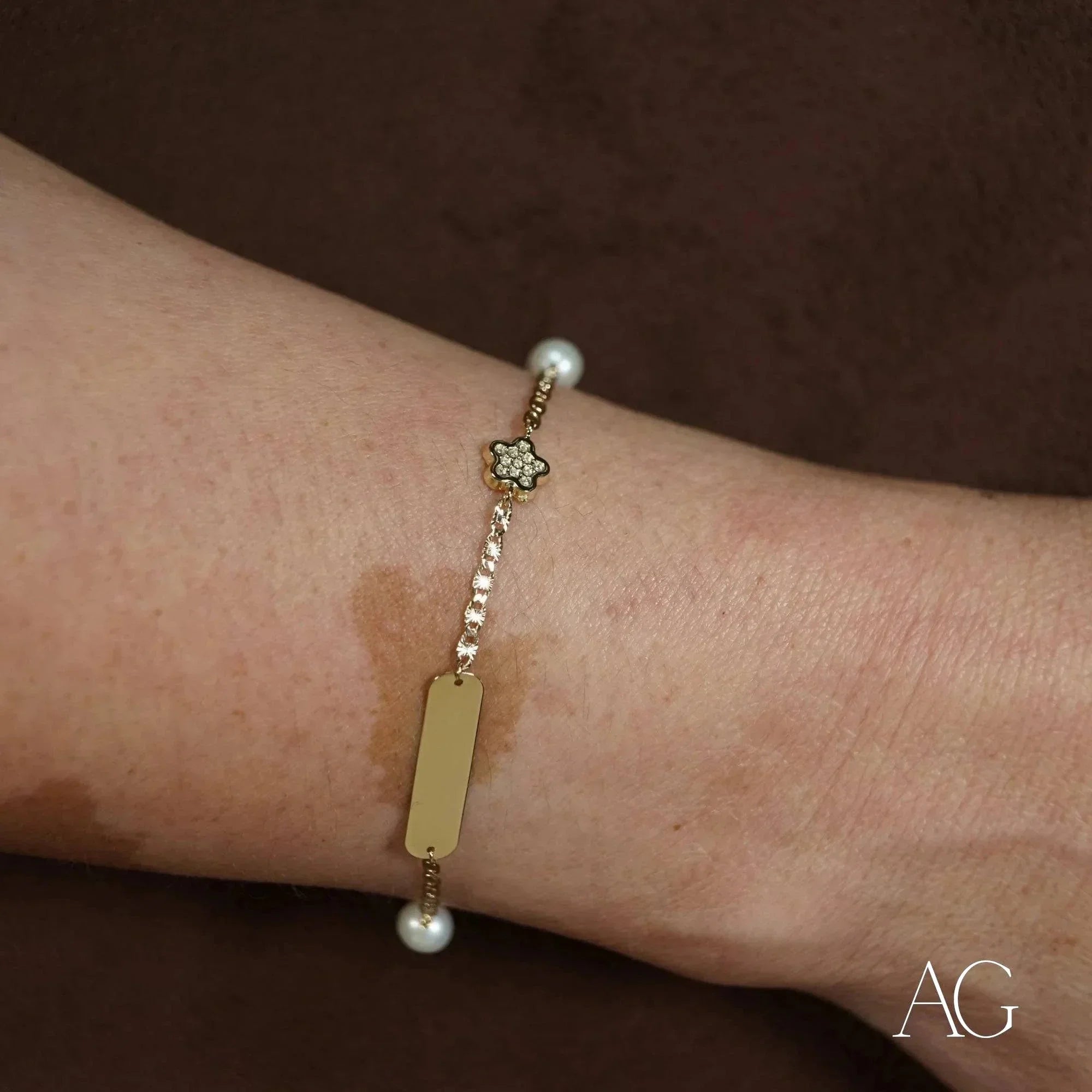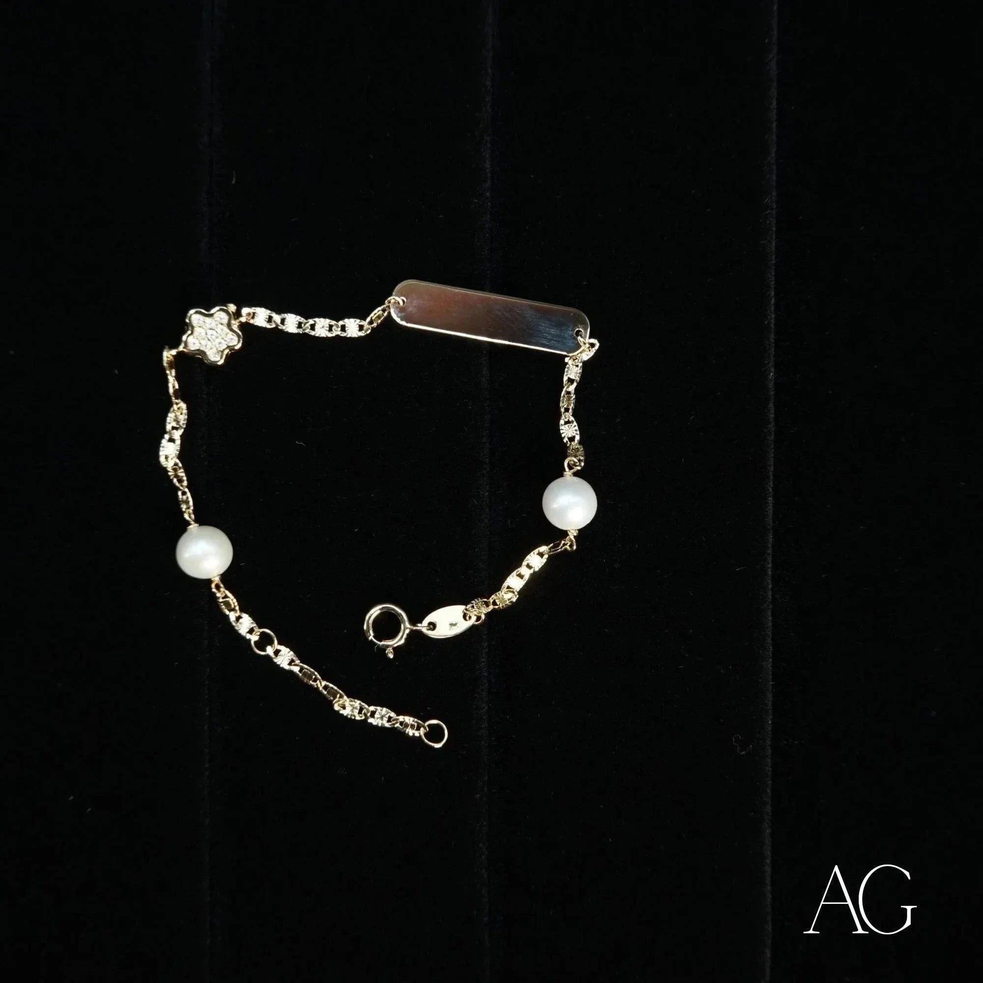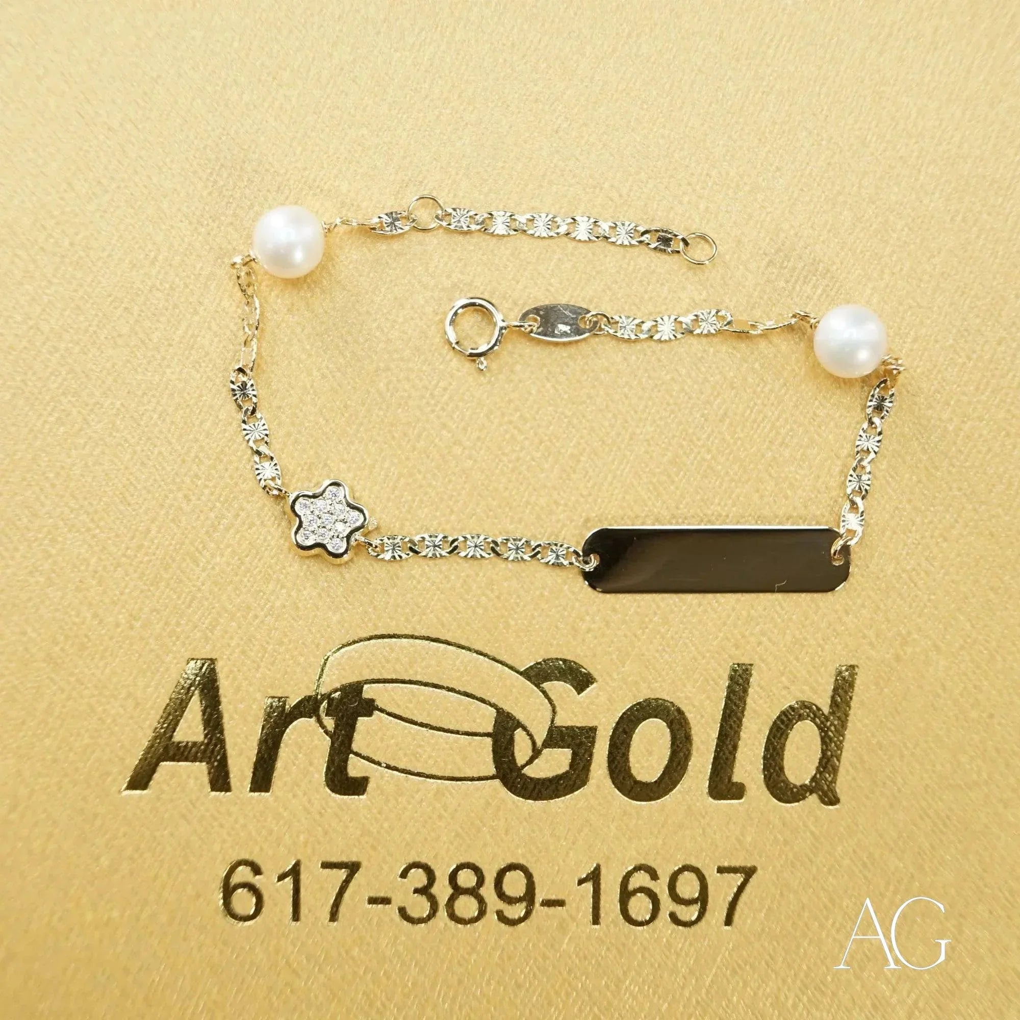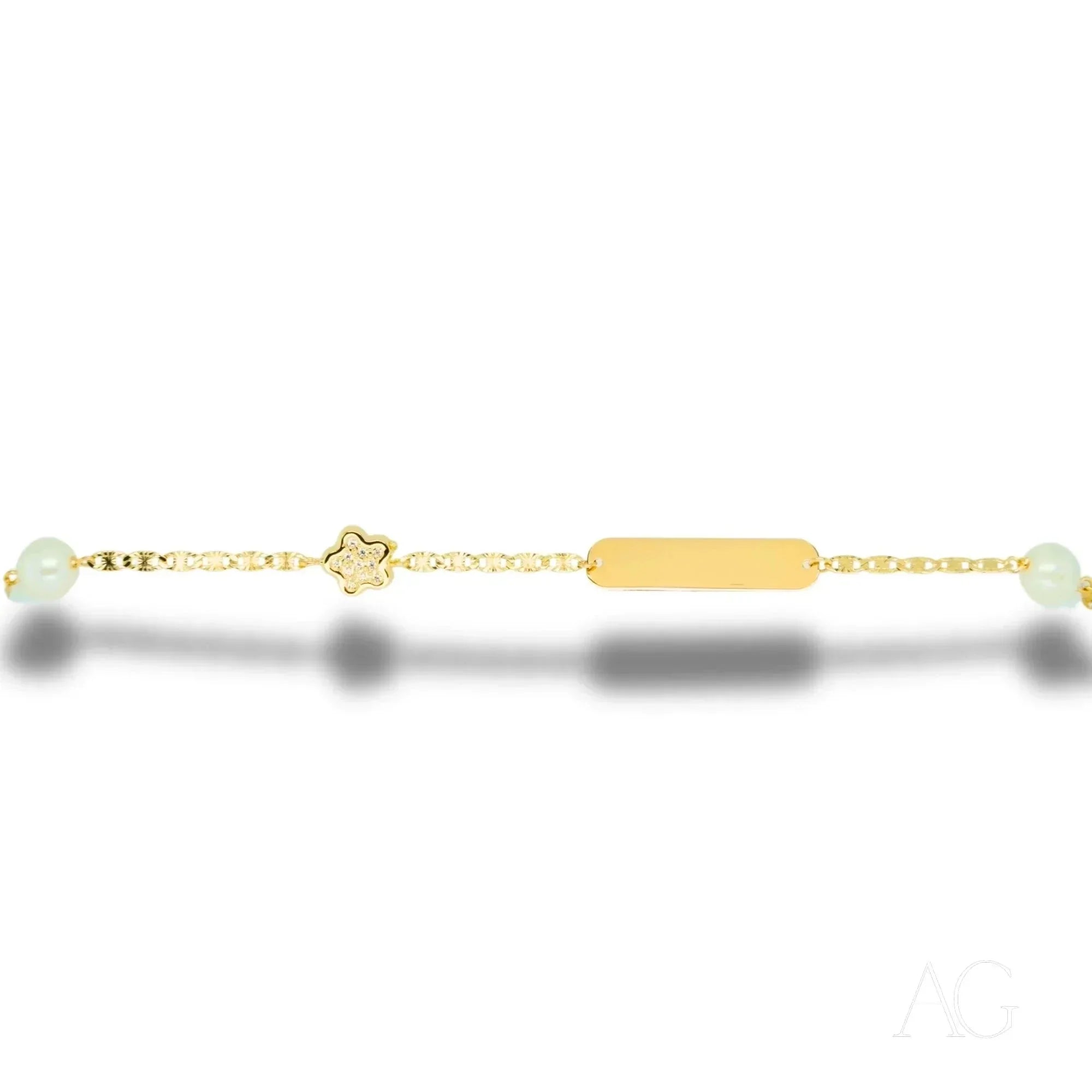 Enchanting Embellishments: Two lustrous pearls, symbols of purity and innocence, embrace the ID tag, while the dazzling cubic zirconia adds a touch of playful brilliance, catching the light with every movement.Lightweight and Comfortable: Crafted with the delicate skin of children in mind, this 18k gold bracelet ensures comfortable, all-day wear. Your little one can explore, play, and dream without feeling restrained by their jewelry.Customizable ID Tag: The heart of this bracelet, the ID tag, awaits your personal touch. Engrave it with a name, a special date, or a loving message, transforming this beautiful accessory into a meaningful keepsake, a tangible reminder of a precious moment.