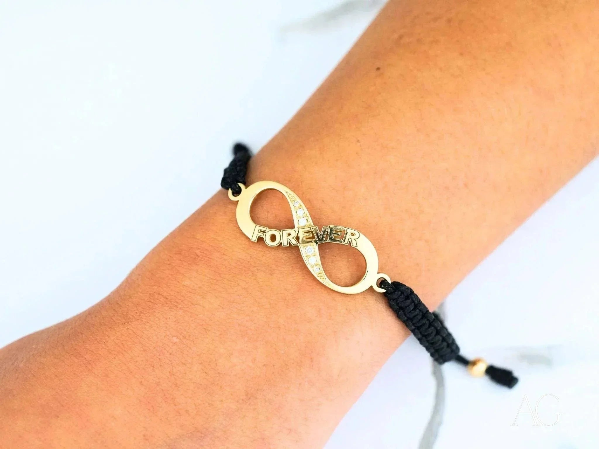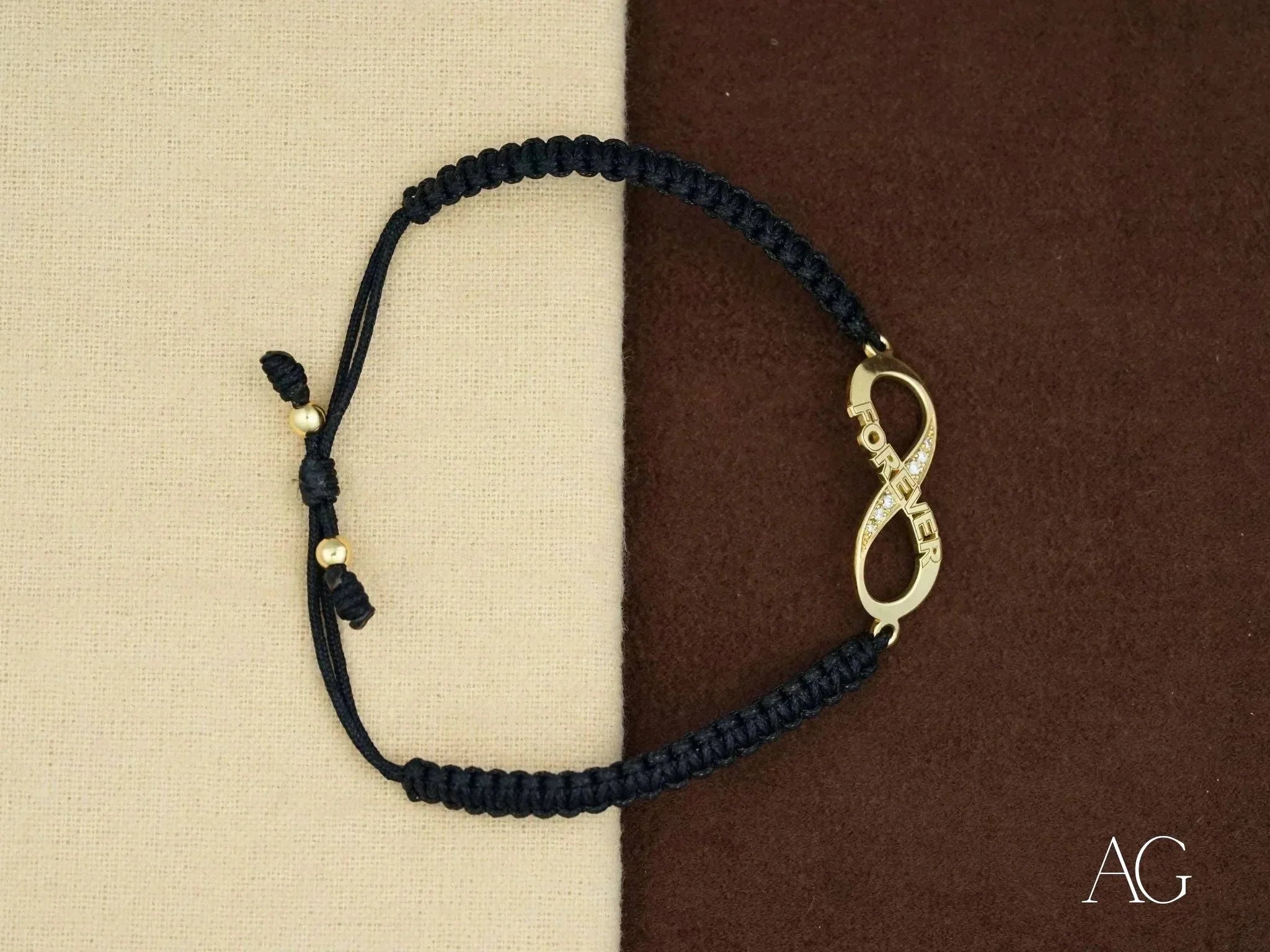 Material: 18k Solid Gold and resilient NylonLength: 9 inches (22.86 cm) – perfectly sized for most wristsWeight: 4.2 grams – light and comfortable for all-day wearDesign: A graceful infinity symbol, meticulously crafted from 18k gold, with the word "FOREVER" delicately inscribed, adding a touch of personal sentiment.Clasp: Adjustable nylon band ensuring a secure and personalized fit.