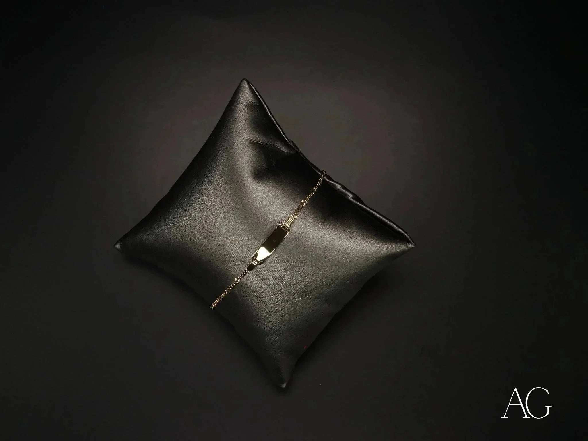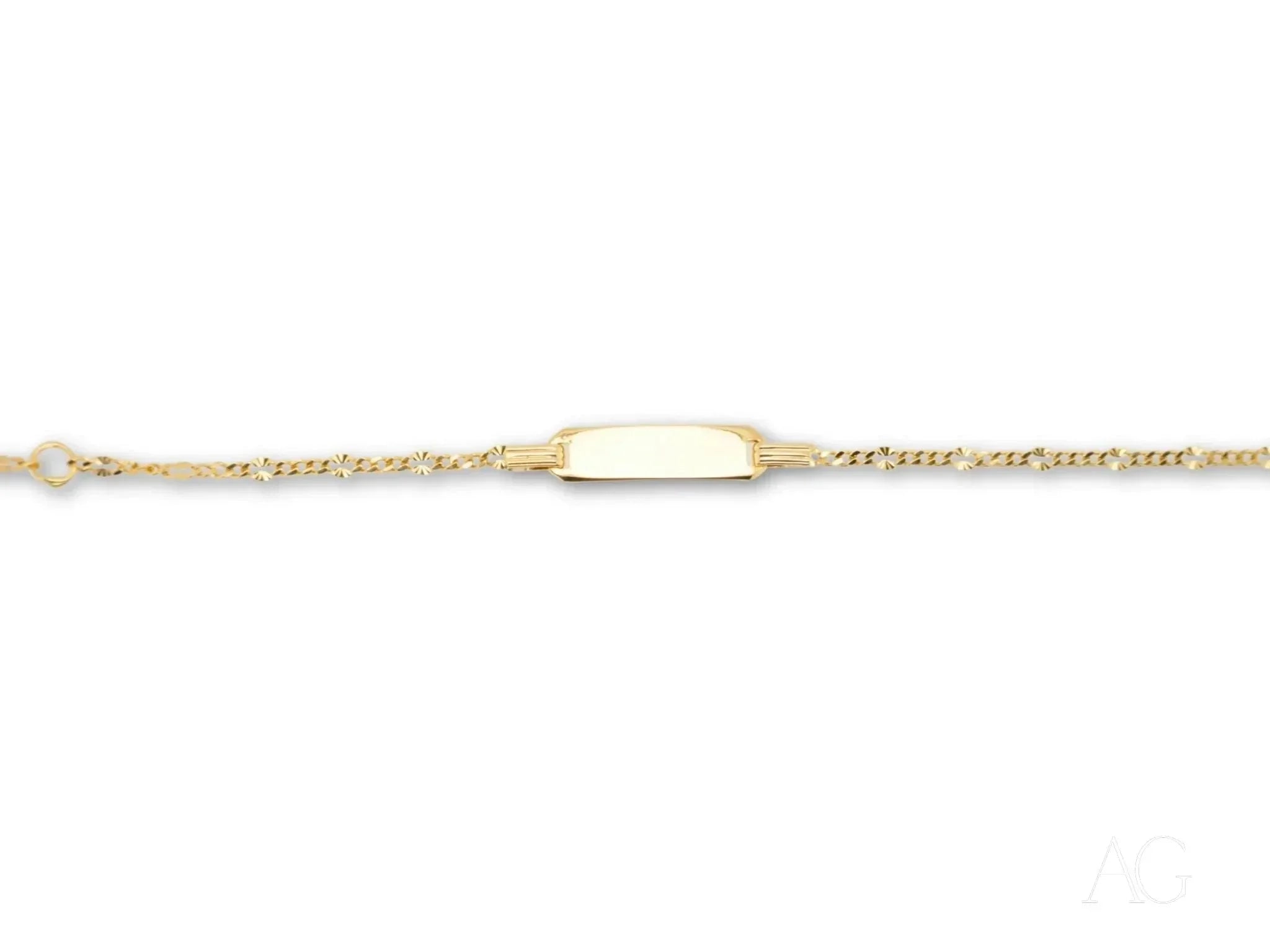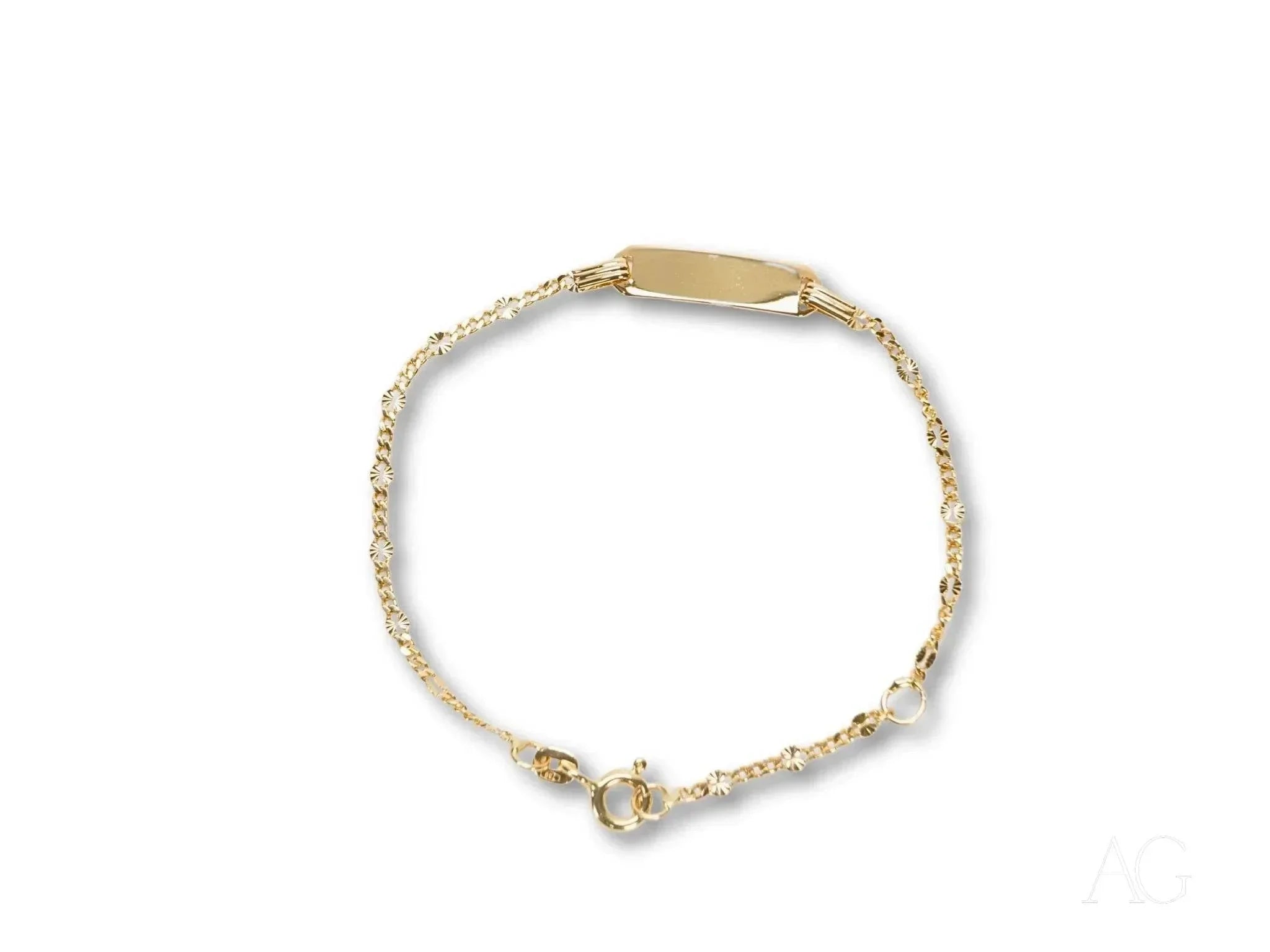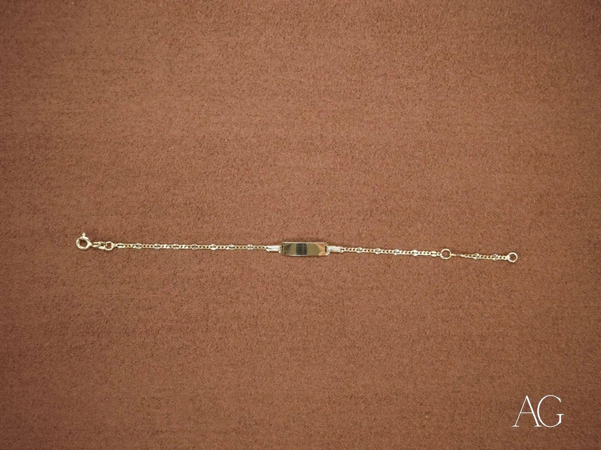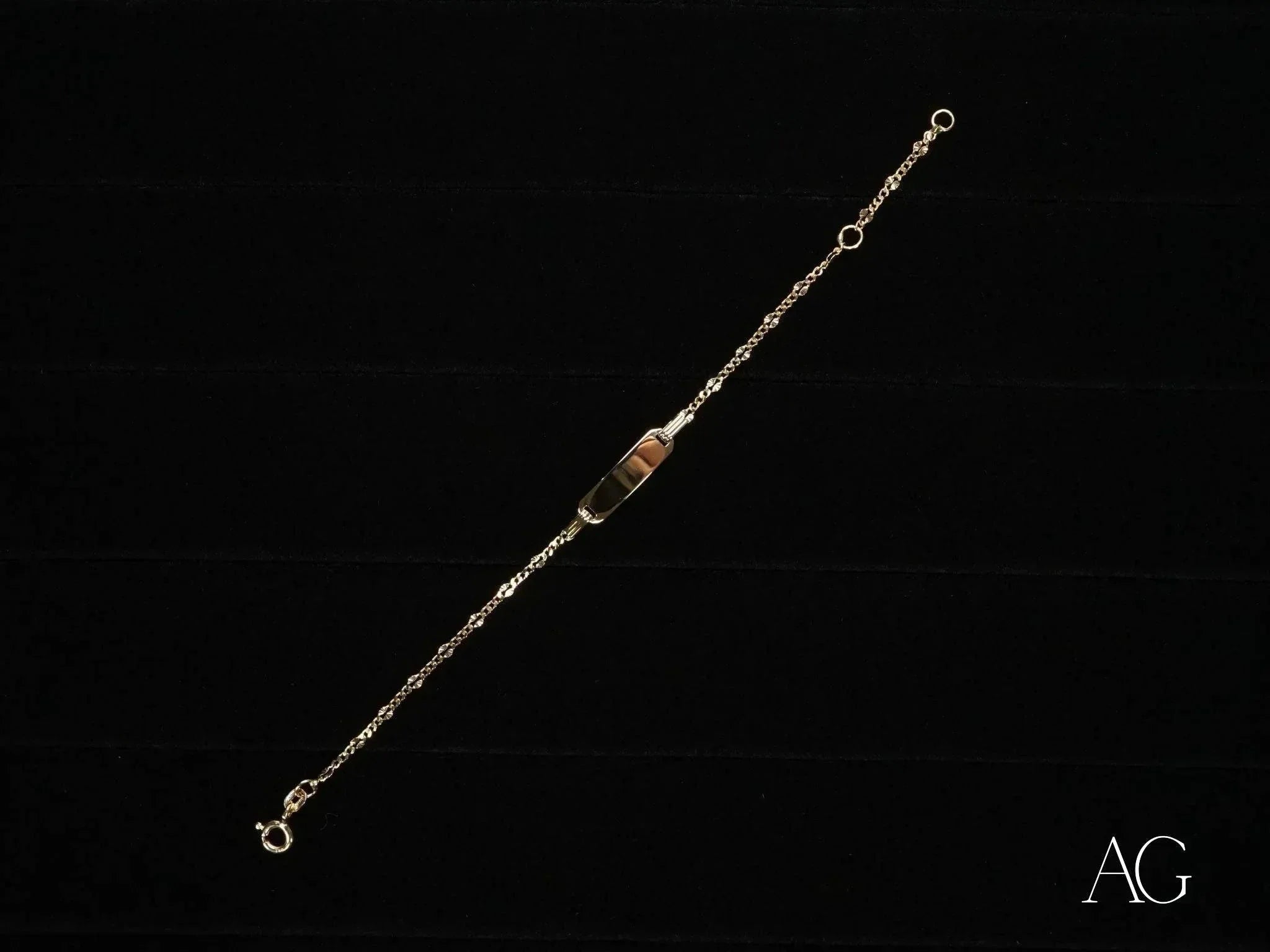Customizable ID Plate: Engrave a name, initials, a special date, or even a sweet message onto the gleaming ID plate, transforming this 18k gold personalized kid's id bracelet into a unique and cherished keepsake. Imagine the joy of seeing your child's face light up when they wear a piece of jewelry as individual as they are.Elegant Design: The intricate design adds a touch of sophistication, making this bracelet suitable for everyday playdates, birthday parties, or even elegant family gatherings. This isn’t just an ID bracelet; it's a beautiful piece of jewelry they'll be proud to wear.Adjustable Fit: Two adjustable settings ensure the bracelet can grow with your child, providing a comfortable and secure fit for years to come. This thoughtful feature offers exceptional value and longevity.Secure Spring Ring Lock: The robust spring ring lock ensures the bracelet stays securely in place, offering peace of mind for active children and safeguarding this precious keepsake. You can rest assured knowing this bracelet is designed to stay put.Lightweight and Comfortable: Designed for everyday wear, the bracelet's incredibly light 1.6-gram weight ensures it won't hinder your child's playtime, sports, or any of their favorite activities.