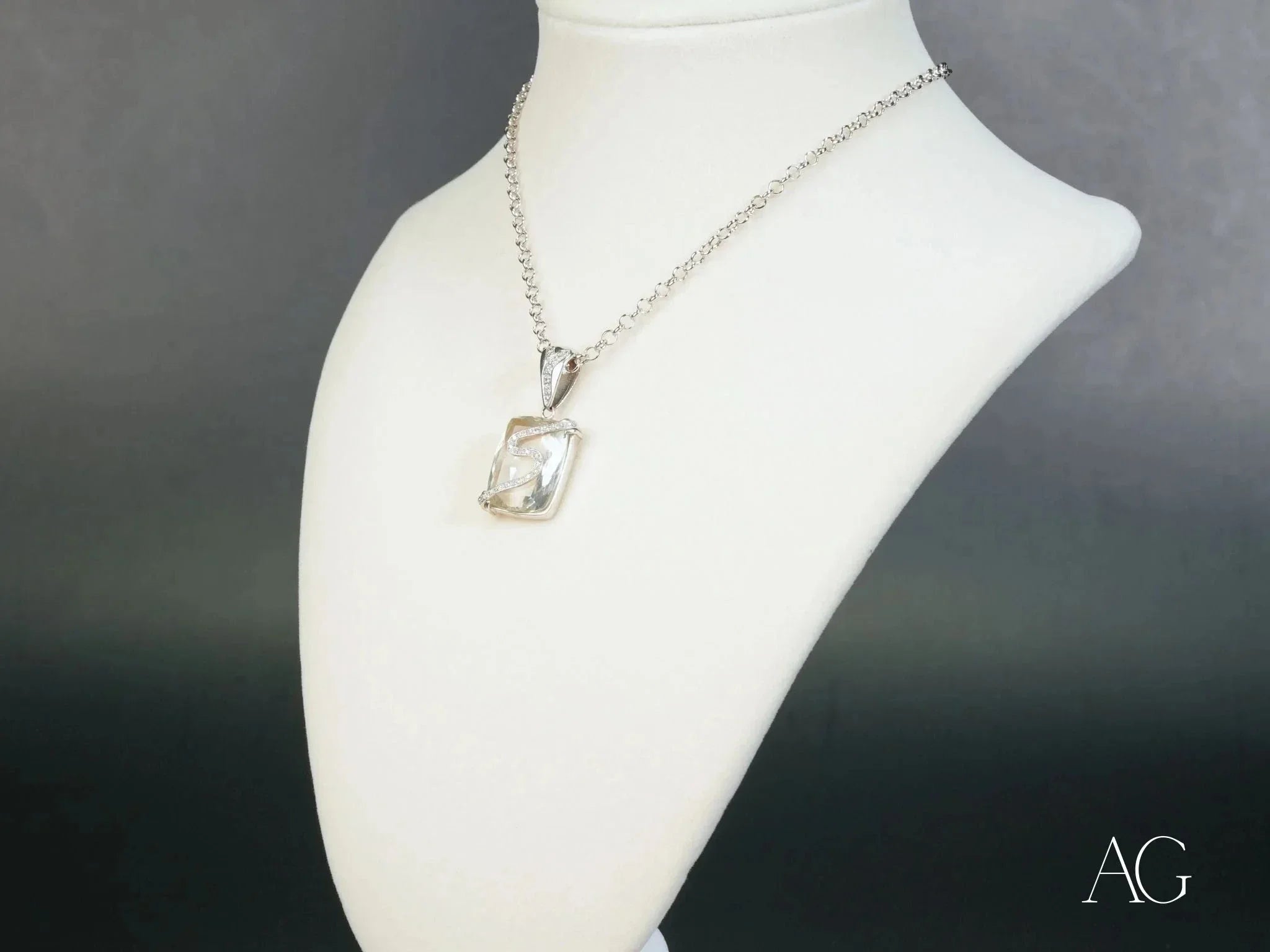 Premium 18k White Gold Craftsmanship: Meticulously sculpted from radiant 18k white gold, ensuring a lifetime of luminous beauty and enduring value.Brilliant Crystal Centerpiece: The heart of the Eternal Frost Pendant, a captivating crystal of exceptional clarity, captures and reflects light with breathtaking intensity, evoking a sense of wonder and enchantment.Dazzling Diamond Accents: A halo of exquisitely cut diamonds dances around the crystal centerpiece, amplifying its brilliance and adding a touch of sophisticated sparkle. These ethically sourced diamonds symbolize enduring strength and everlasting beauty.Substantial Weight (9.13 grams): The Eternal Frost Pendant possesses a reassuring weight that speaks to its quality and craftsmanship, creating a luxurious presence without compromising comfort.Timeless Design: A harmonious blend of modern allure and classic elegance, the Eternal Frost Pendant transcends fleeting trends, making it a cherished heirloom for generations to come.Symbolic Meaning: The crystal embodies clarity, purity, and inner peace, while the diamonds represent strength, eternal love, and unwavering commitment, making this pendant a truly meaningful gift.