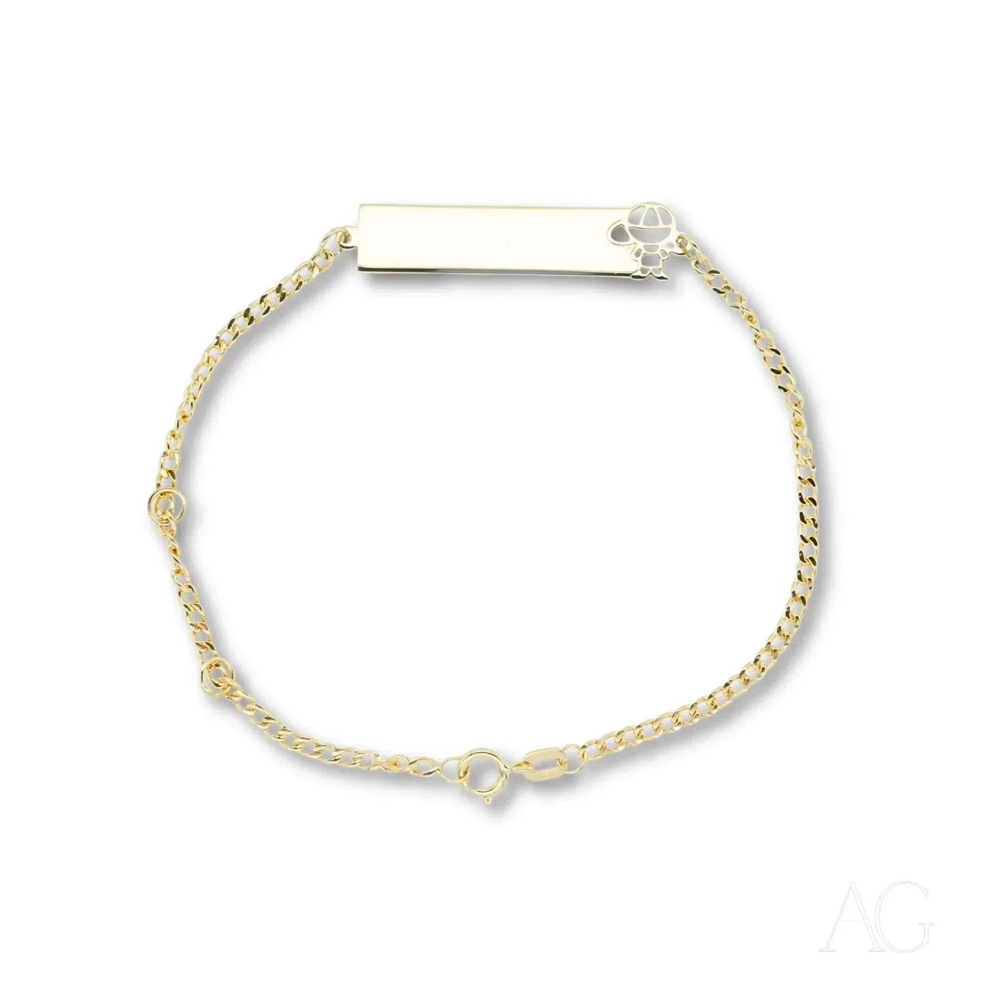 Distinctive Boy Motif: More than just a design, this meticulously crafted little boy figure adds a touch of personality and youthful charm, making this 18k yellow gold ID bracelet more than just jewelry, but a cherished keepsake.Customizable ID Plate: Engrave a name, a special date, or even a heartfelt message onto the ID plate. This personalized touch transforms this gold ID bracelet into a unique treasure, carrying a piece of your family's story. It also offers practical peace of mind, providing essential identification in case of need.Adjustable for Growth: Three thoughtfully placed adjustment clasps allow this bracelet to grow with your child, ensuring a comfortable and perfect fit throughout the years, making it a gift that truly lasts.