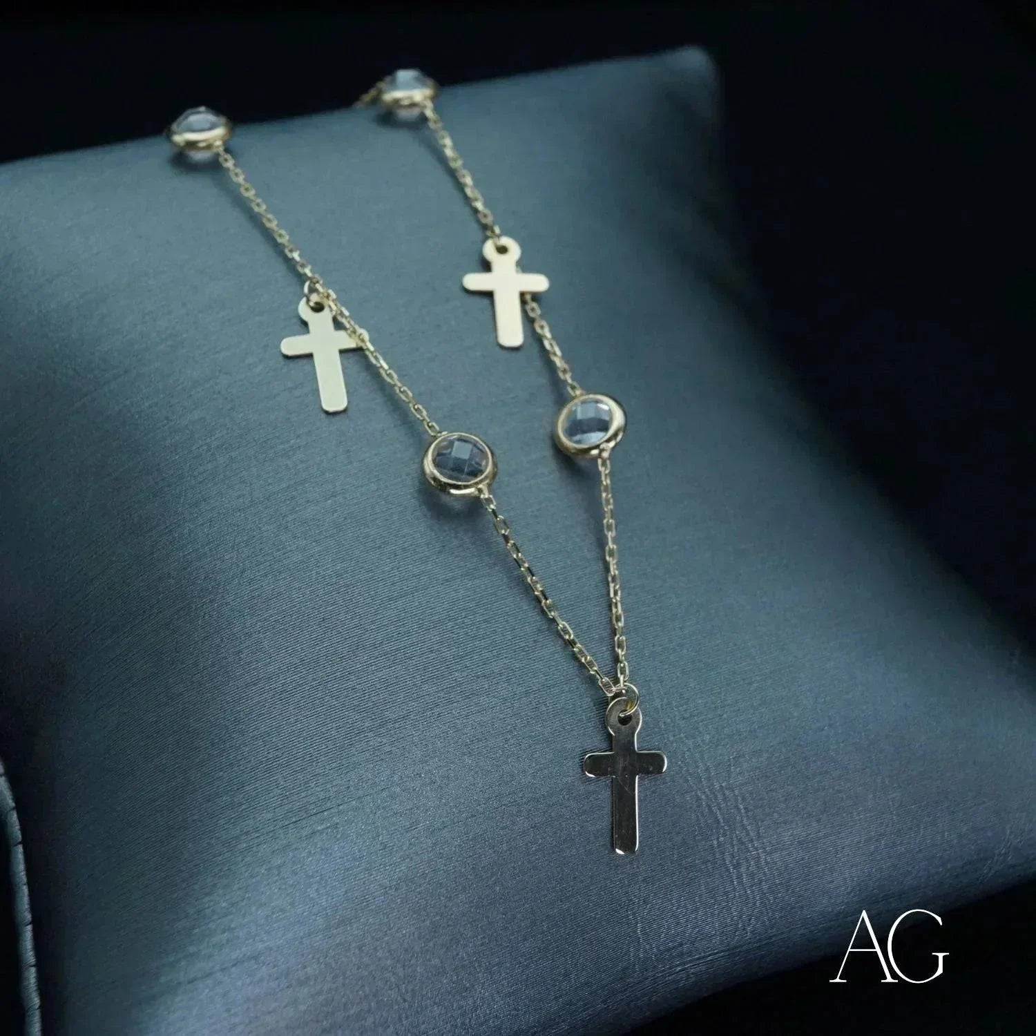 A Symphony of Faith and Fashion In the heart of the Greater Boston Area, Massachusetts, Art Gold Jewelry proudly presents a masterpiece that intertwines spirituality with style – the 18k Charms Anklet adorned with five exquisite crosses. More than a mere accessory, this anklet is a radiant declaration of faith, meticulously handcrafted with the renowned precision and care of Art Gold Jewelry. Each delicate cross charm, shimmering in 18k gold, whispers a story of devotion, resonating with personal meaning and understated elegance. Imagine the gentle sway of these luminous charms, a subtle reminder of your cherished beliefs with every graceful step.