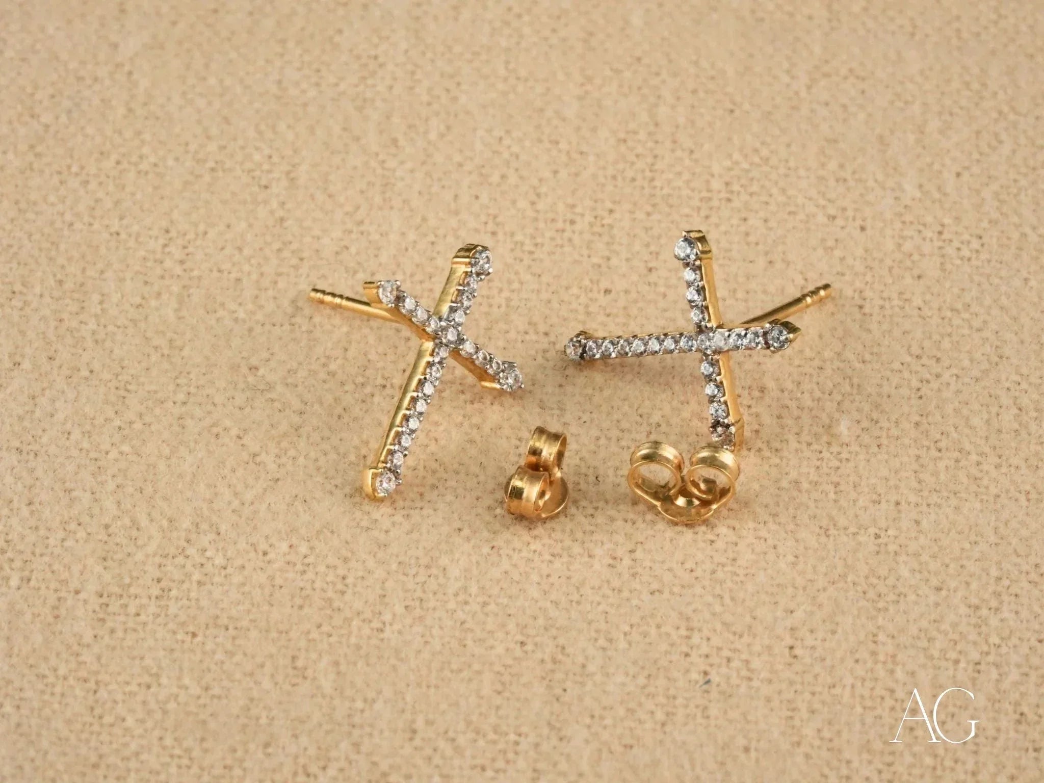 Divine Sparkle: 18k Gold Cross CZ Earrings