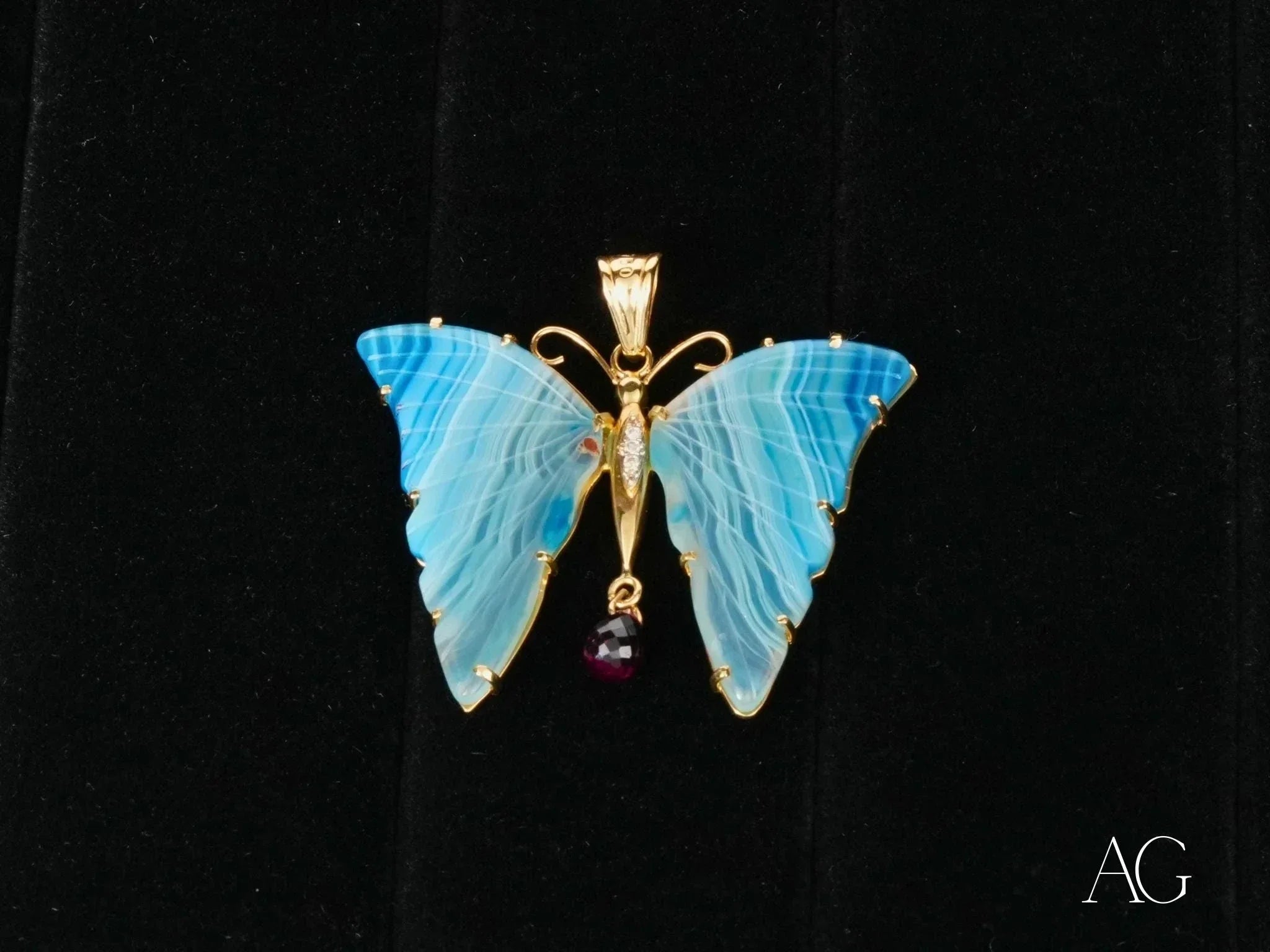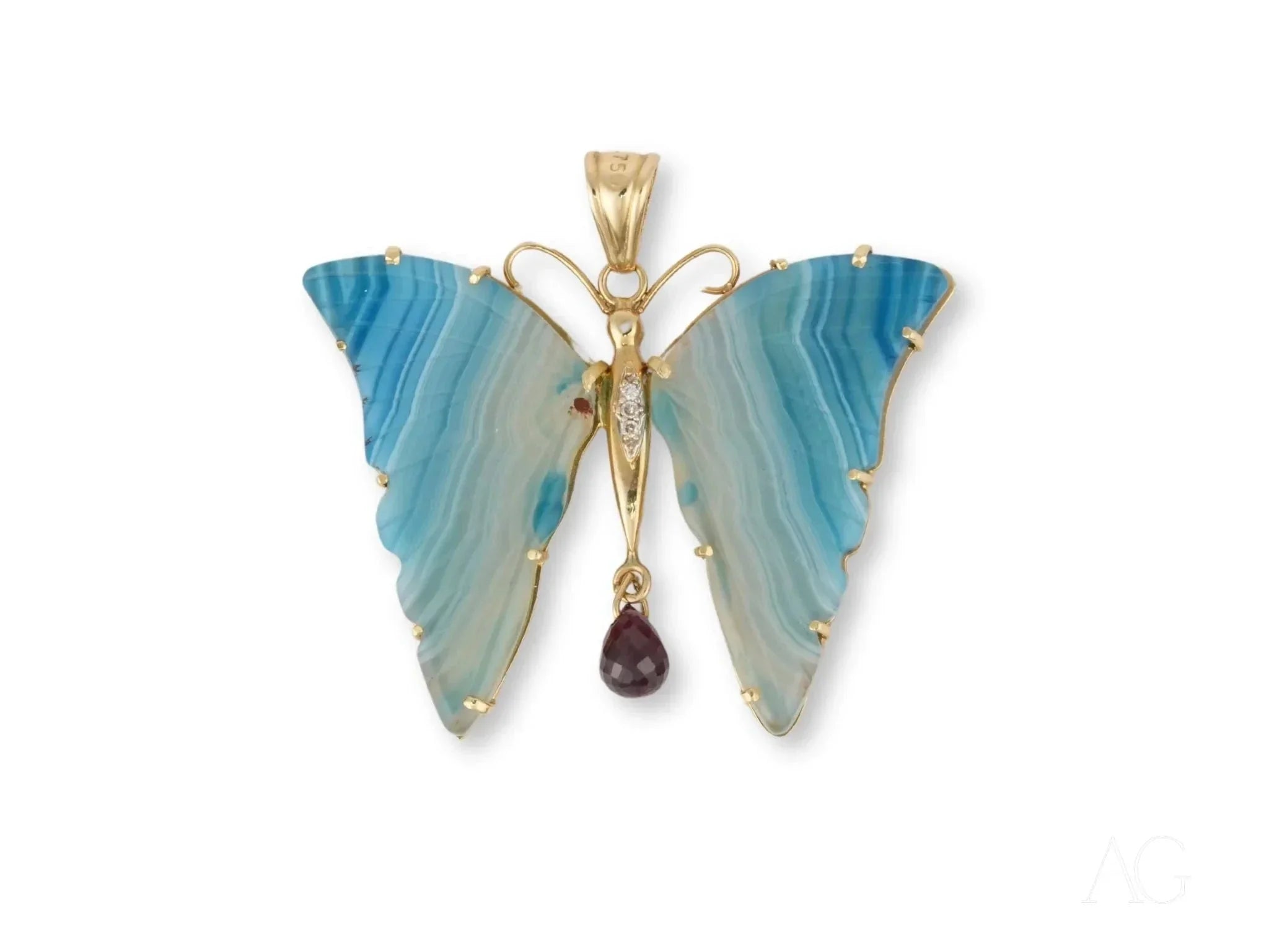18k Yellow Gold Construction – Experience the gold standard of elegance. This 18k solid gold pendant ensures lasting beauty, resisting tarnish and retaining its radiant luster for generations to come.Agate Wings with Unique Patterns – No two are alike. The natural variations in the agate create a truly unique piece of art gold jewelry, as individual as you are.Rhodolite Accents – These vibrant raspberry-hued gemstones add a captivating pop of color, creating a dynamic interplay of light and texture against the warm gold.Brilliant Diamond Detailing – Expertly set diamonds add a touch of ultimate sparkle. These meticulously placed accents catch and reflect light, enhancing the pendant's overall brilliance.Butterfly Motif – The timeless symbol of transformation, freedom, and natural beauty. This meaningful motif elevates the pendant beyond mere adornment, imbuing it with symbolic significance.5.2 Grams of Solid Elegance – A delicate balance of presence and comfort. This lightweight yet substantial design rests comfortably against your skin while making a bold statement.