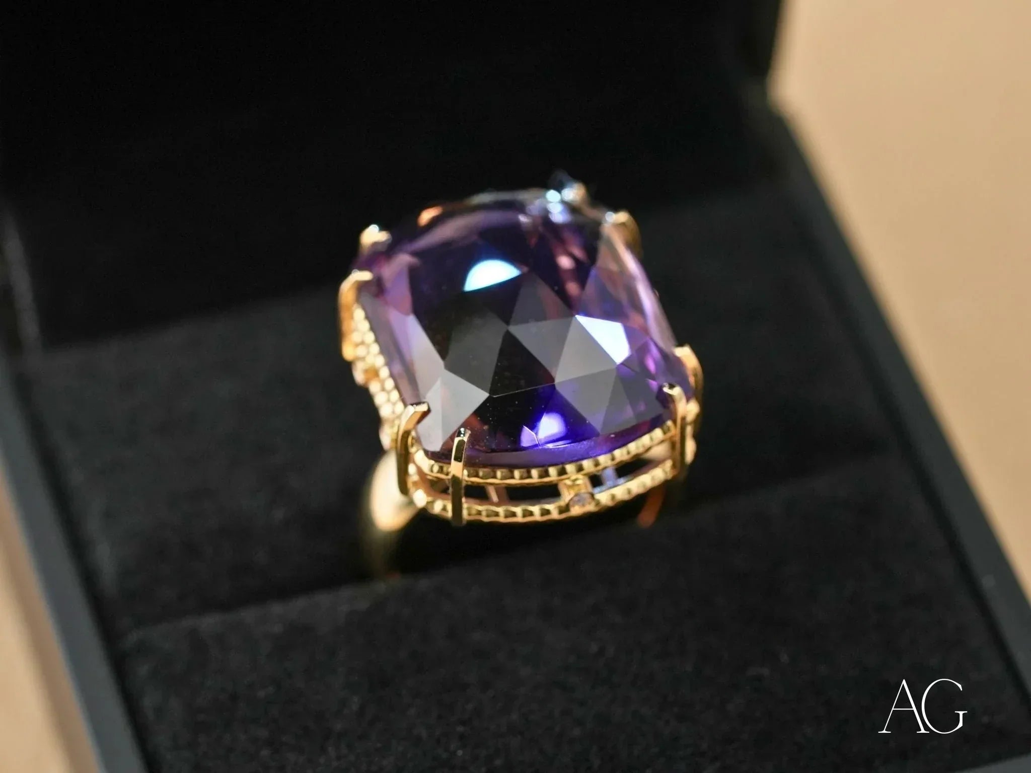 • How should I care for my amethyst and diamond ring? Preserve the Purple Royale's breathtaking brilliance by cleaning it gently with a soft cloth and mild soapy water. Avoid exposing it to harsh chemicals, ultrasonic cleaners, or extreme temperatures to maintain its exquisite beauty for years to come.