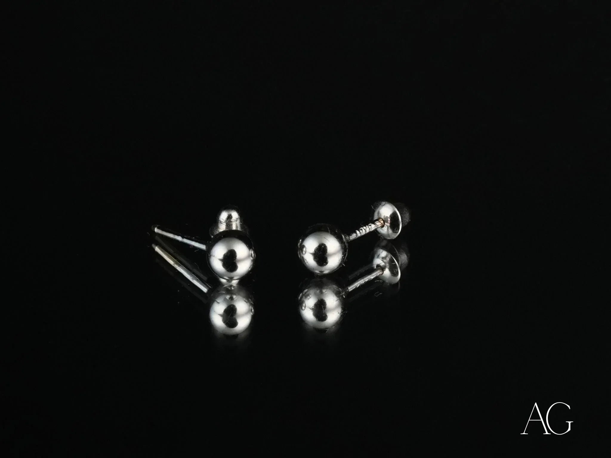 Give your little one the gift of timeless elegance with these delicate 18K White Gold 4mm Ball Earrings. Crafted from luxurious 18k white gold, these shimmering spheres are the perfect first pair of earrings. Designed with tiny ears in mind, their lightweight comfort and secure screw-back closures ensure worry-free wear from playtime to bedtime. These 4mm ball earrings are more than just jewelry; they're a precious keepsake, a sparkling symbol of love, and a beautiful introduction to the world of art gold jewelry.