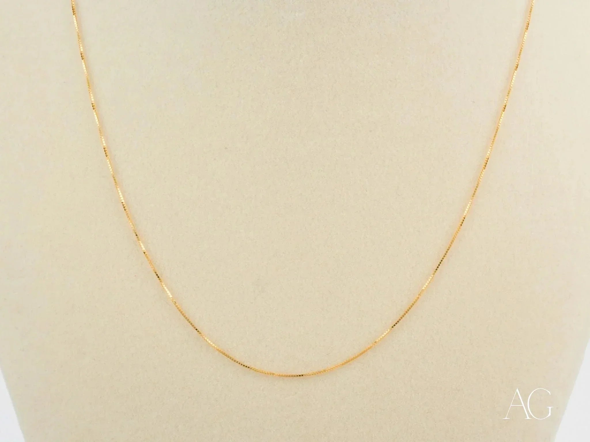 Indulge in the understated luxury of our sleek, minimalist, and brilliantly polished Gold Box Chain—a must-have for every jewelry aficionado. This featherlight 1g chain drapes effortlessly, offering timeless elegance whether layered with other pieces or worn solo as a statement of refined simplicity. Choose from 16 or 18 inches and select from a range of lustrous gold types and tones—including radiant yellow gold and cool white gold—to perfectly complement your personal style and elevate any ensemble. This gold box chain is a true embodiment of versatile sophistication.