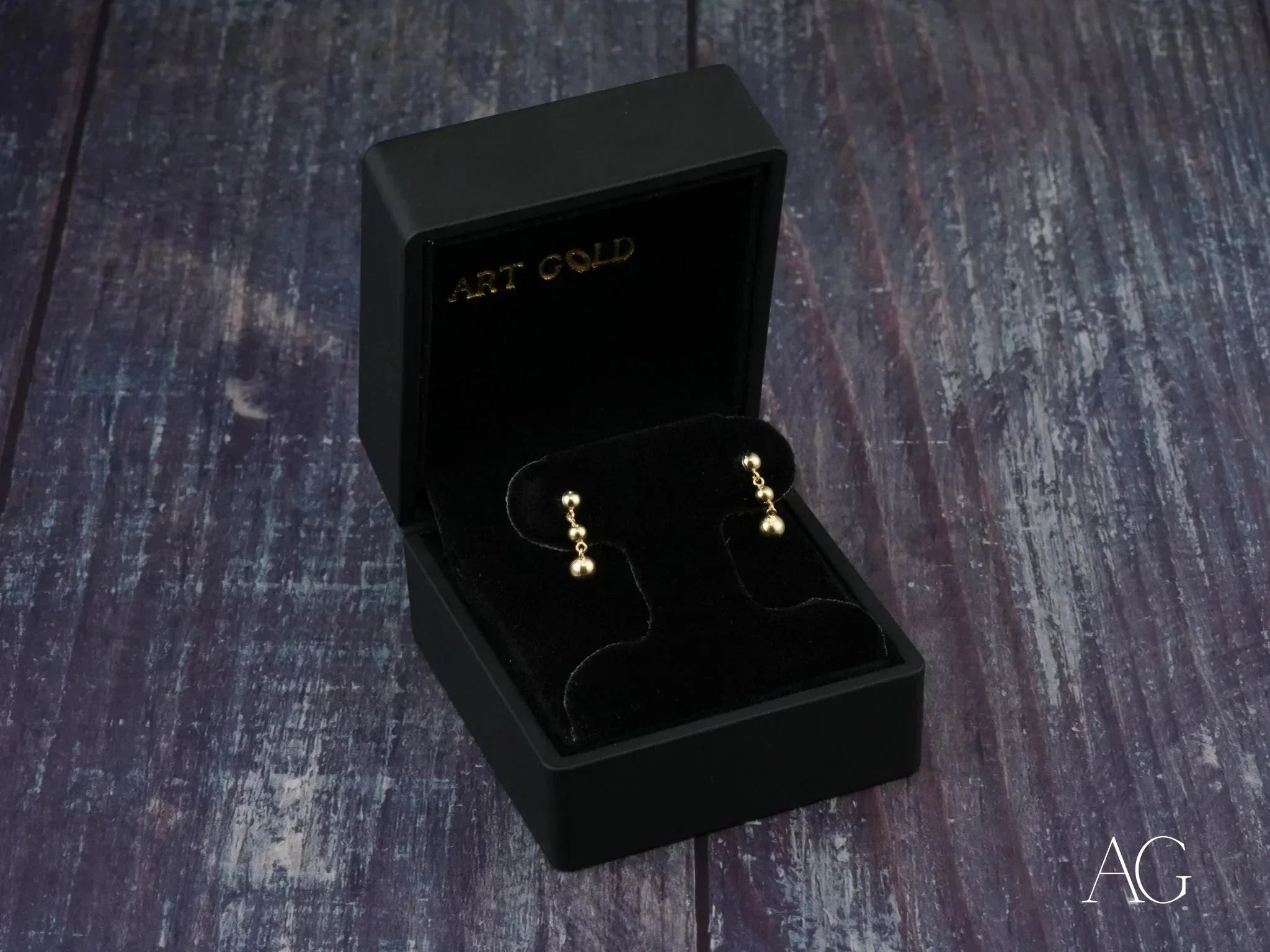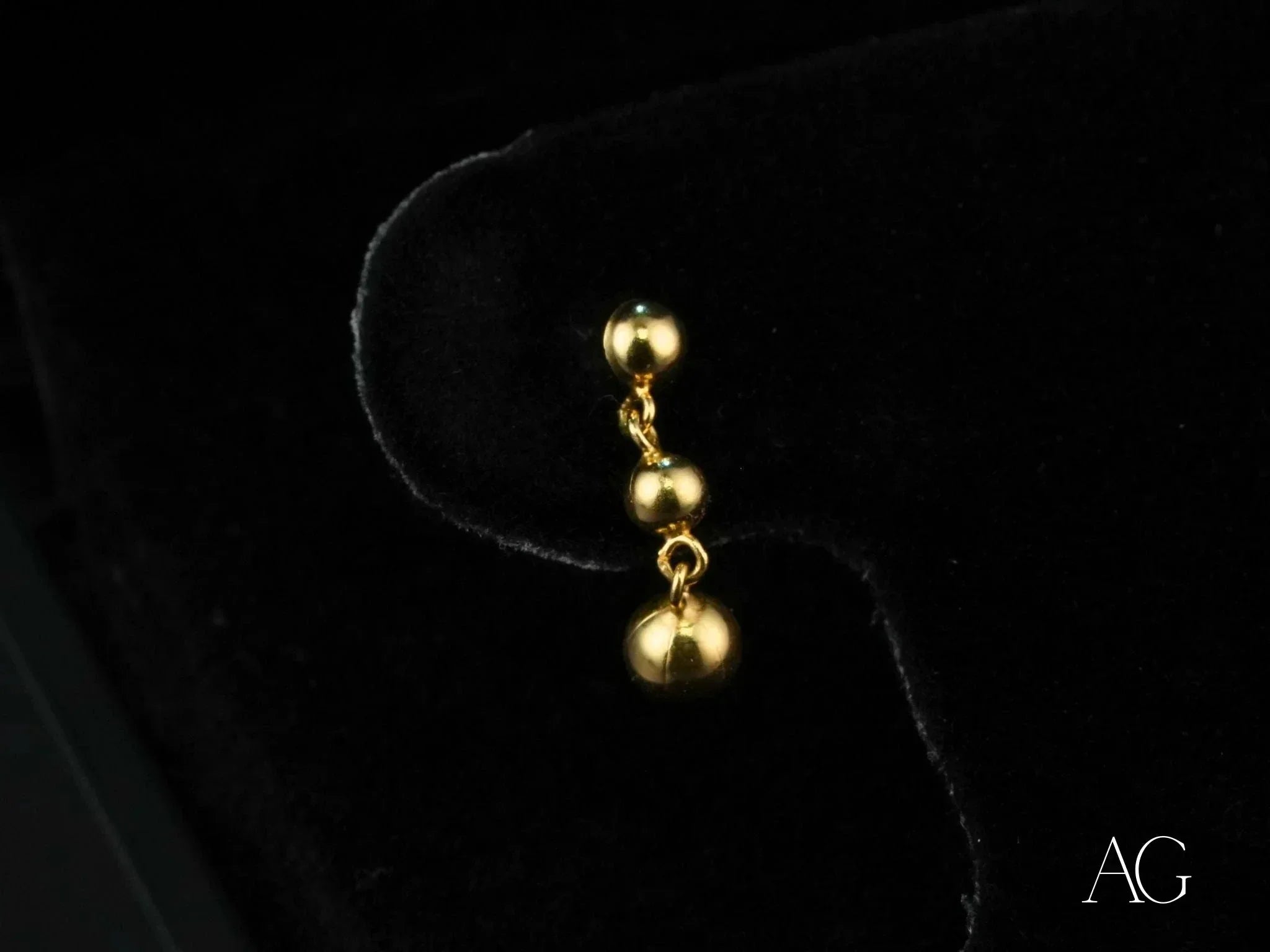Elevate your everyday elegance with these stunning 18K Gold 3 Beads Earrings. Crafted from certified 18k solid gold, three delicately linked beads create a mesmerizing, sophisticated dangle that catches the light with every move. Weighing a feather-light 0.5g, you'll forget you're even wearing them! The secure bullet back closure ensures all-day comfort, making these earrings perfect from dawn till dusk, whether you're conquering the boardroom or turning heads at a special event. Experience the luxurious feel of Art Gold Jewelry.