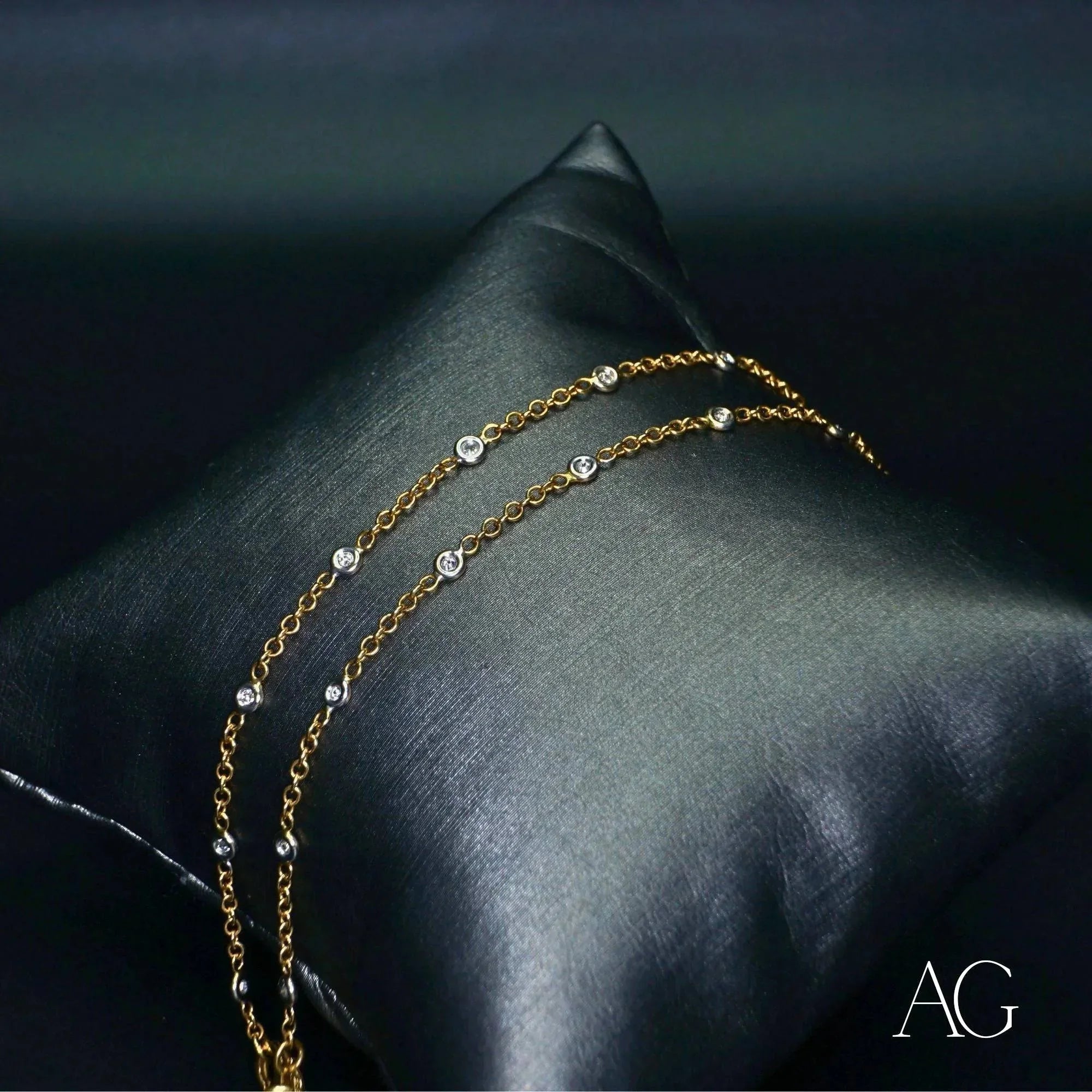 Elevate your style with the mesmerizing shimmer of our 18k Gold Diamond Anklet. This exquisite piece, featuring 19 dazzling diamonds meticulously set in lustrous 18k gold, is the ultimate expression of sophistication and glamour. Prepare to turn heads and add a radiant touch of luxury to any ensemble with this breathtaking piece of art gold jewelry.