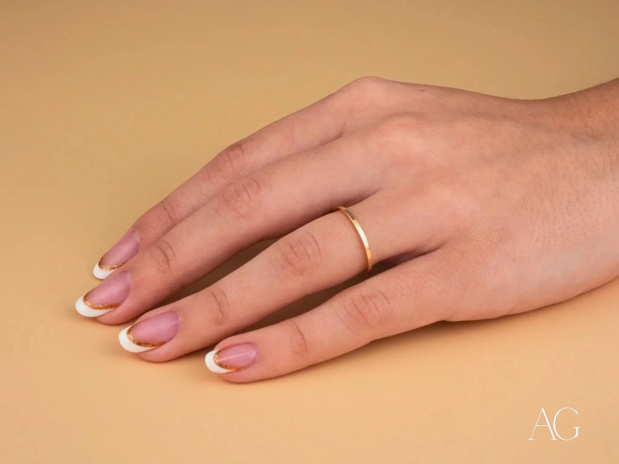 Delicately crafted from radiant 18k art gold, the Essence Linea 1mm Ring is the purest expression of minimalist jewelry. Its ultra-fine silhouette glides onto the finger like a whisper — barely there, yet undeniably present, a subtle shimmer that catches the light with every movement. Designed for the woman who understands that true elegance lies in restraint, this Linea 1mm ring is a graceful companion for any occasion, whether worn solo as a delicate statement or stacked with intention to create a personalized story of art gold. The ethereal 1mm width of this Essence Linea 1mm Ring invites you to begin your own golden narrative — quiet, refined, unforgettable. Imagine the possibilities: layer it with other rings of varying widths and textures for a curated look, or let its singular beauty shine on its own, a testament to your impeccable taste. This art gold jewelry piece is more than just a ring; it's an embodiment of your personal style, a timeless treasure to be cherished for years to come.
