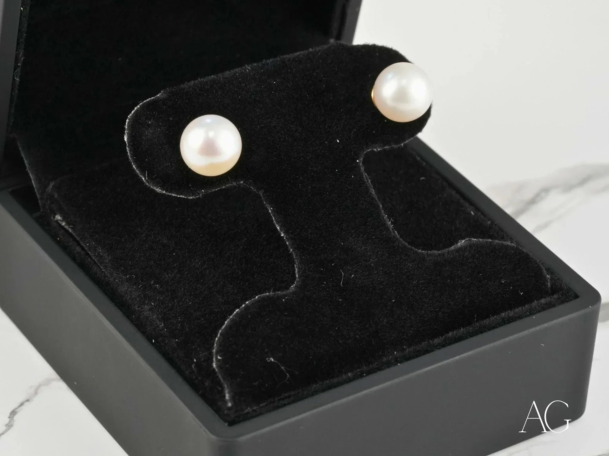 Embrace timeless elegance with the Timeless Allure Freshwater Pearl Stud Earrings, meticulously crafted in solid 18K gold. Featuring luminous 8mm freshwater pearls that shimmer with a captivating natural iridescence, these pearl stud earrings effortlessly elevate any ensemble. From everyday luxury to the most special occasions, these exquisite studs are a symbol of refined style and understated glamour, adding a touch of magic to your look.