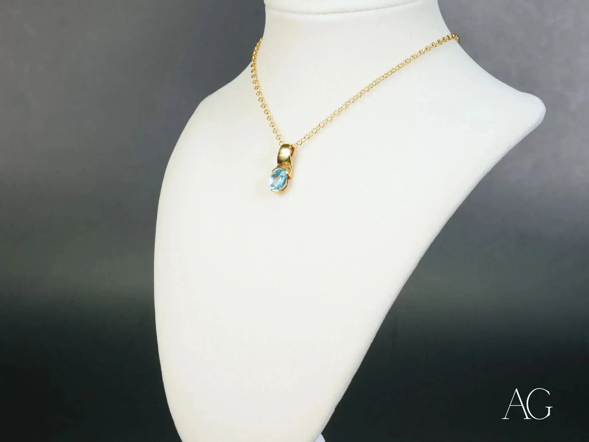 Premium 18k Gold Craftsmanship: Meticulously crafted from solid 18k gold, this art gold jewelry piece promises enduring brilliance and luxurious quality, a testament to enduring elegance.Genuine Blue Topaz Gemstone: The deep, sky-blue topaz, renowned for its calming energy, adds a touch of magic and serenity to this stunning design. Its captivating facets dance with light, creating a mesmerizing display of brilliance.Elegant Weight: At 3.5 grams, the Ocean Breeze Pendant achieves the perfect balance between noticeable presence and comfortable wearability, allowing you to effortlessly showcase its beauty all day long.Versatile Design: This minimalist yet captivating design transcends fleeting trends, making it a cherished piece for both formal occasions and everyday elegance. Its timeless appeal ensures it will remain a treasured part of your jewelry collection for years to come.Symbolic Meaning: Beyond its aesthetic beauty, the blue topaz gemstone carries profound symbolic meaning, representing clarity, calmness, and emotional balance. Gift the Ocean Breeze Pendant as a token of serenity and well-being to a loved one, or cherish it as a personal reminder of inner peace.