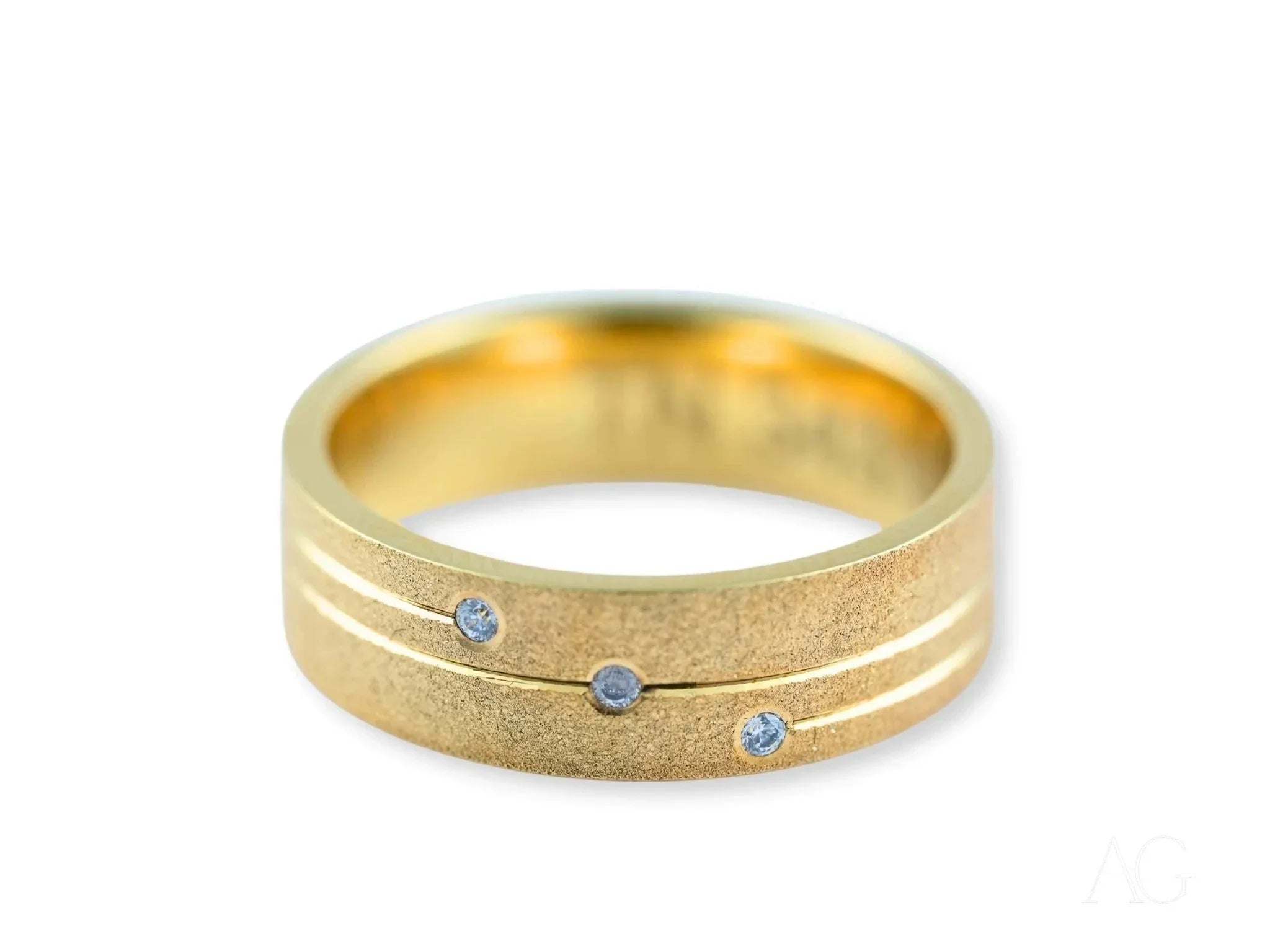 Sleek Gold Lines and Diamond Accents: The flowing lines, inspired by celestial orbits, symbolize the continuous journey of love, while the three dazzling diamonds represent the past, present, and future of your shared life, radiating brilliance and unwavering devotion. This Art Gold Jewelry signature design is a testament to enduring elegance.6.6mm Wide Band: This substantial yet refined width provides a bold statement of commitment without compromising on comfort. The 6.6mm band strikes the perfect balance, offering a sophisticated look that's ideal for everyday wear.Available in 18k or 14k Gold: Select the rich, warm glow of 18k gold for ultimate luxury, or opt for the enduring strength and resilience of 14k gold – a perfect choice for those with an active lifestyle. Both options guarantee the lasting quality you expect from Art Gold Jewelry.Comfort Fit: Experience unparalleled comfort with our signature comfort fit design. The Orbit Lines band is meticulously crafted to glide effortlessly onto your finger and rest seamlessly against your skin, ensuring a secure and comfortable feel, even during daily activities.Timeless Elegance: The Orbit Lines wedding band transcends fleeting trends. Its harmonious blend of sleek design, celestial symbolism, and dazzling diamond accents makes it a timeless treasure, symbolizing a love story as eternal as the stars.