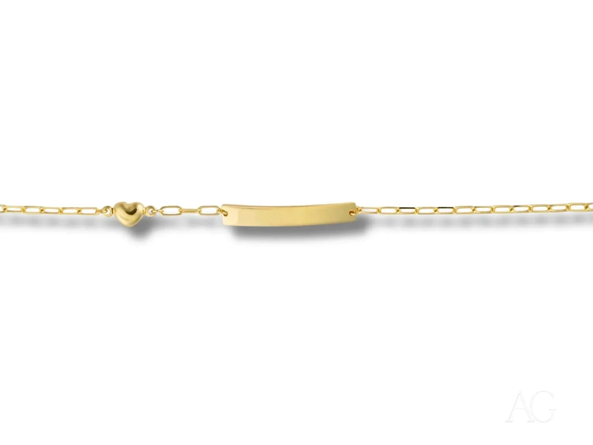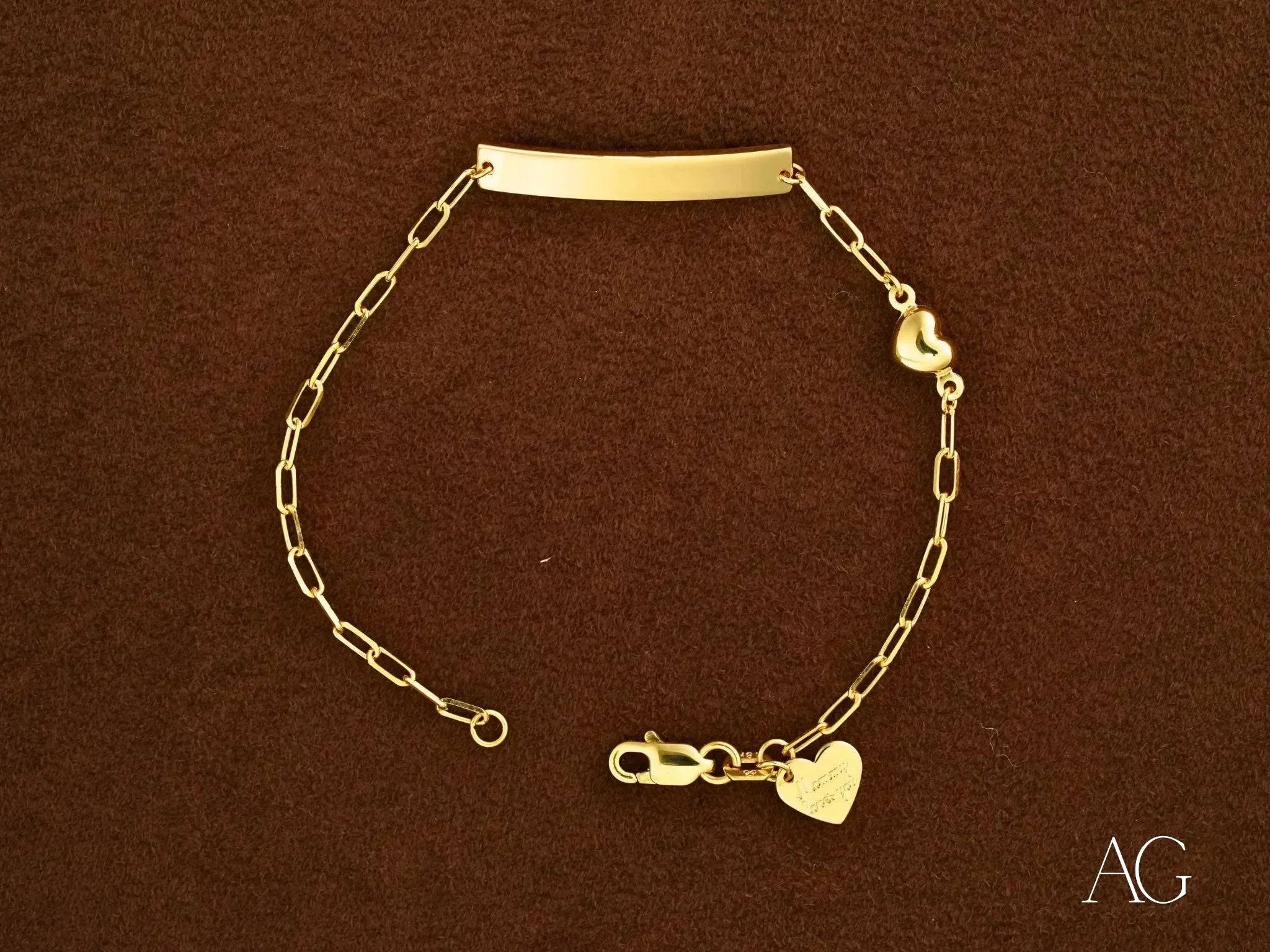 • A Treasured Keepsake, Crafted in Gleaming Gold: Introducing the Solid 18k Gold ID Kid's Customized Bracelet, a radiant piece of art gold jewelry that beautifully marries timeless elegance with the power of personalization. This bracelet, crafted from luxurious solid 18k gold, features a sleek rectangular link chain that catches the light with every movement. Its centerpiece, a customizable ID plate, can be engraved with a name, initials, or a cherished date at no additional cost, transforming this bracelet into a unique and enduring symbol of love. Two captivating heart motifs—one polished to a brilliant shine and the other tenderly engraved with "Mommy loves you"—add a touch of heartfelt sentiment, making it a precious expression of affection.