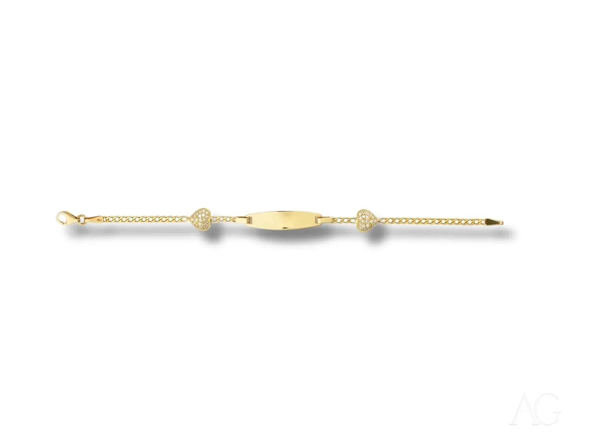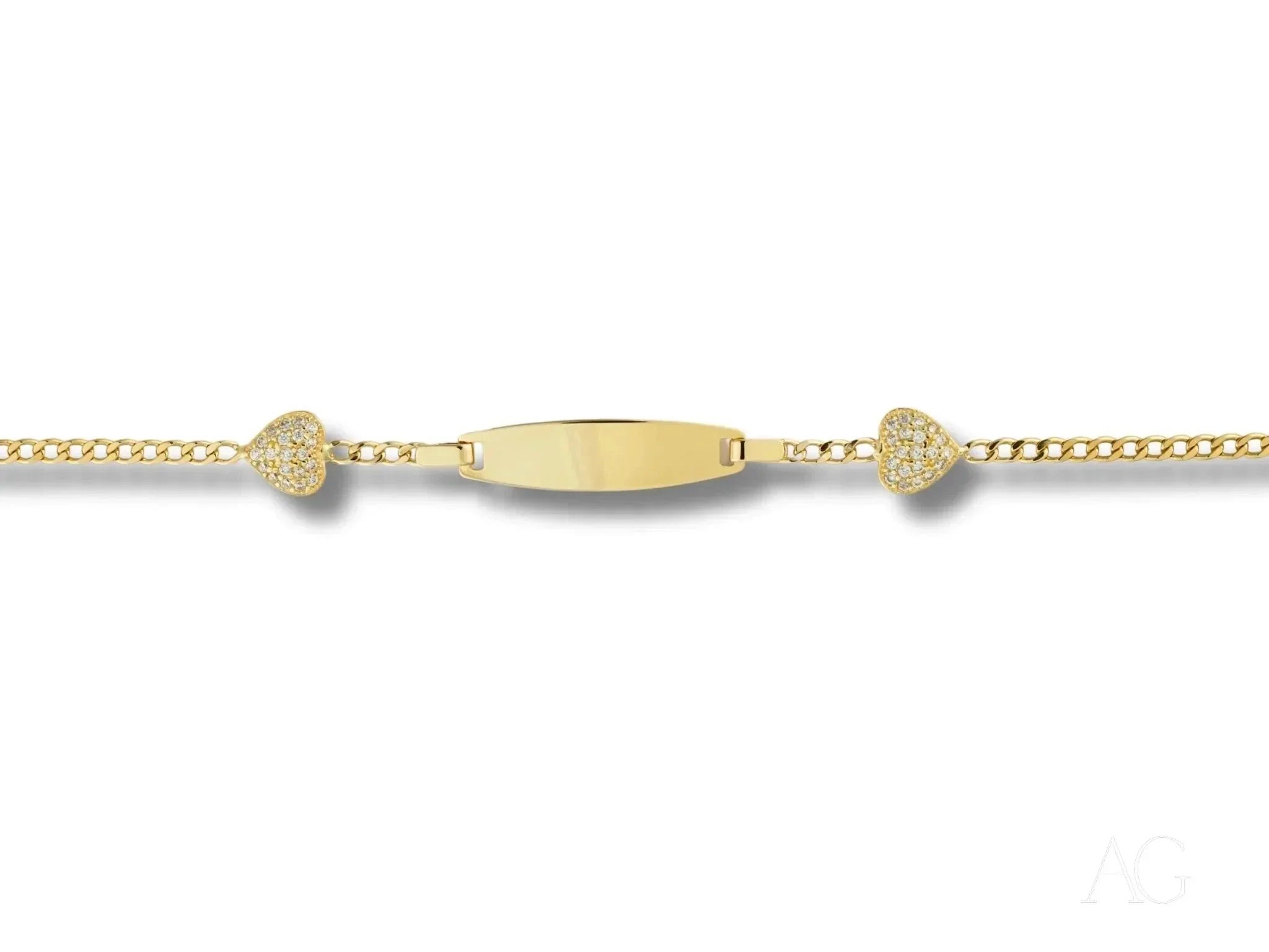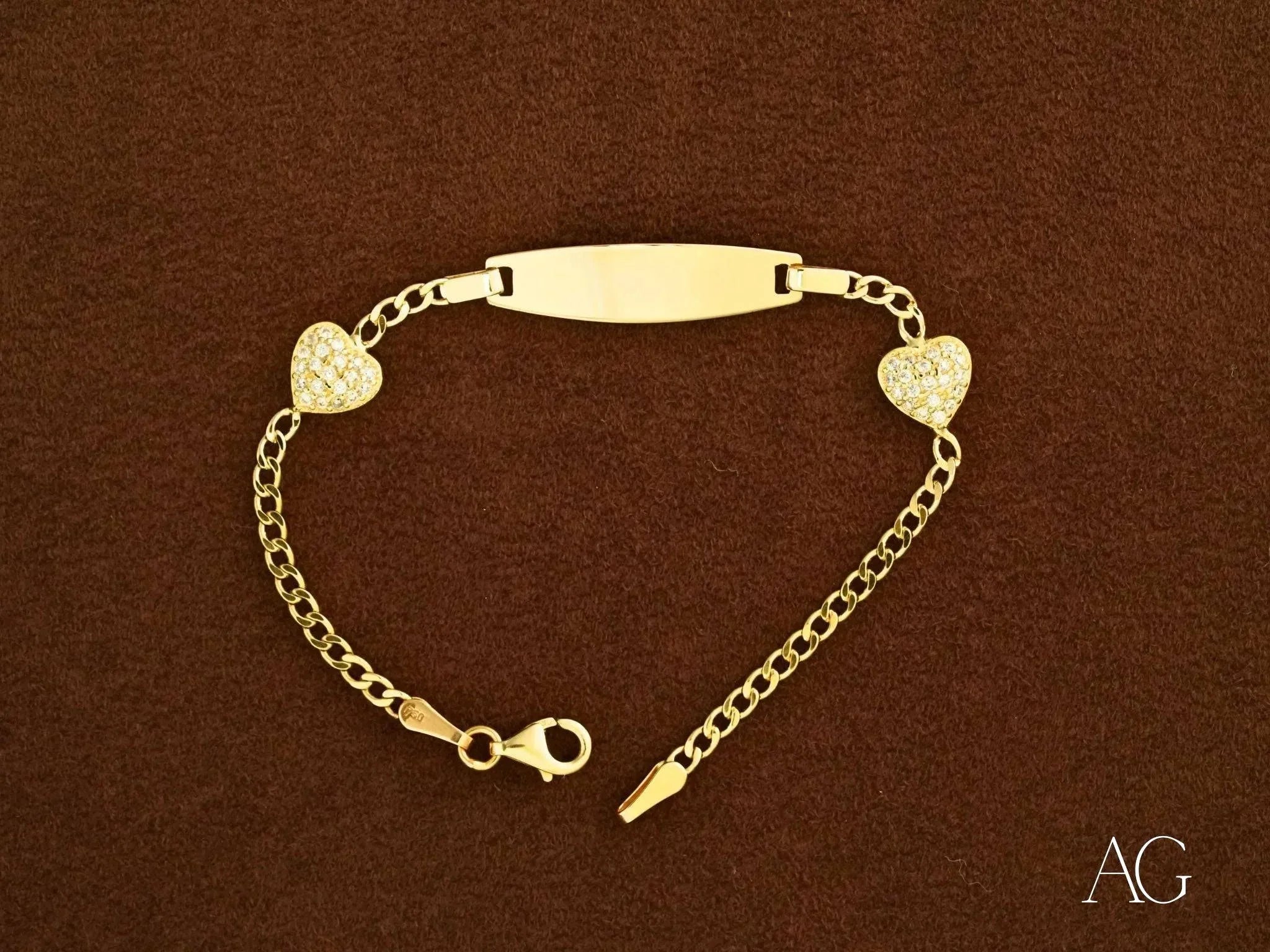 Customizable ID Plate: Engrave a name, initials, a special date, or even a sweet message on the ID plate to create a truly unique and personalized art gold jewelry piece that tells your child's story. This feature transforms the bracelet into a cherished memento, capturing a precious moment in time.Heart Motifs with CZ: The heart motifs, symbols of love and affection, are embellished with brilliant cubic zirconia stones, adding a touch of sparkle and elegance that elevates this personalized ID bracelet beyond the ordinary.Secure Spring Ring Lock: The robust spring ring lock ensures the bracelet stays securely fastened, allowing children to play freely without worry. This reliable closure provides parents with added peace of mind, knowing their child's precious jewelry is safe and sound.Durable and Comfortable: Crafted from luxurious 18k gold, this art gold jewelry piece is designed for both durability and comfort. The high-quality gold ensures long-lasting wear, making it a piece your child can cherish for years to come. Hypoallergenic properties make it suitable for even the most sensitive skin.