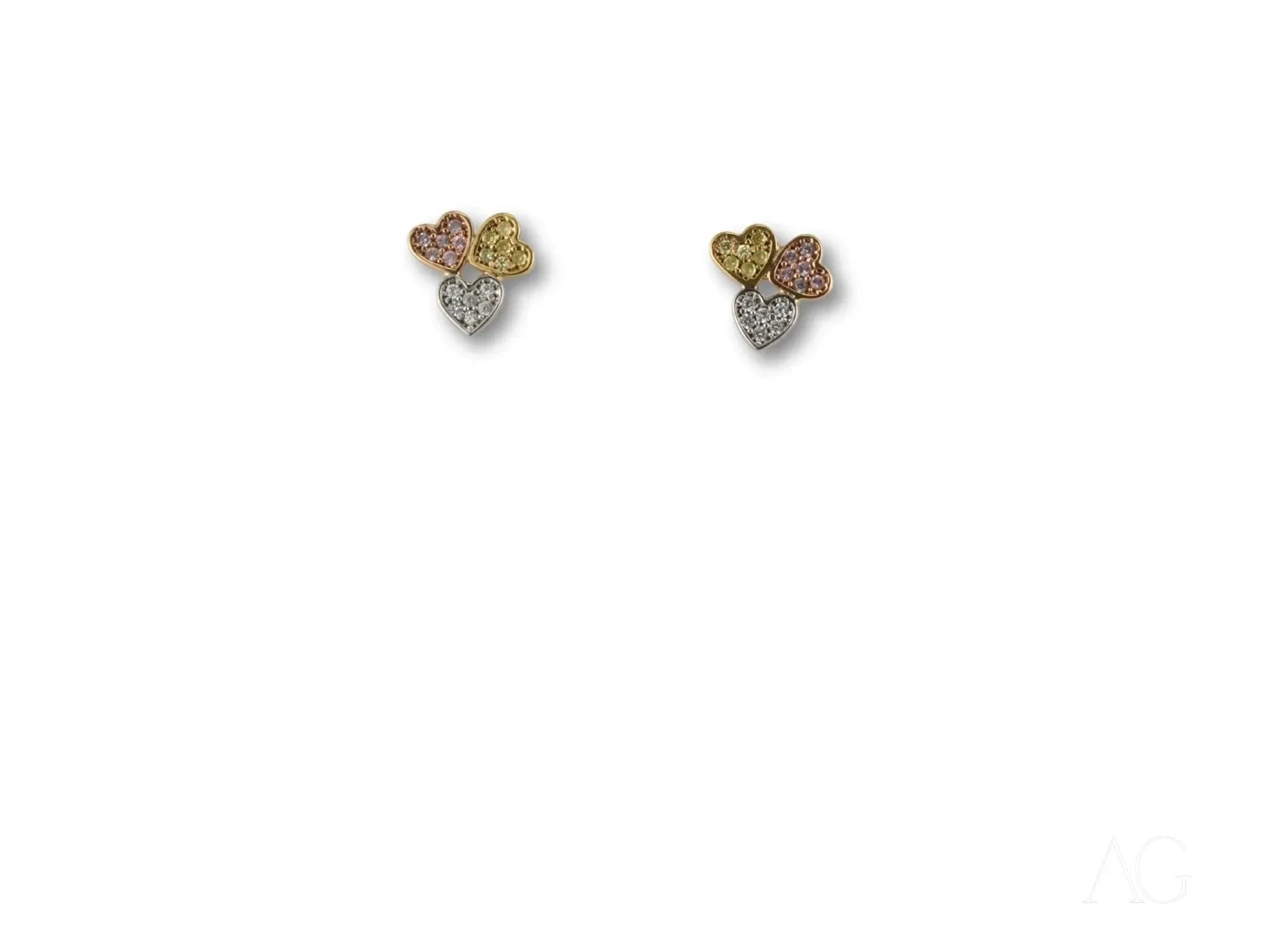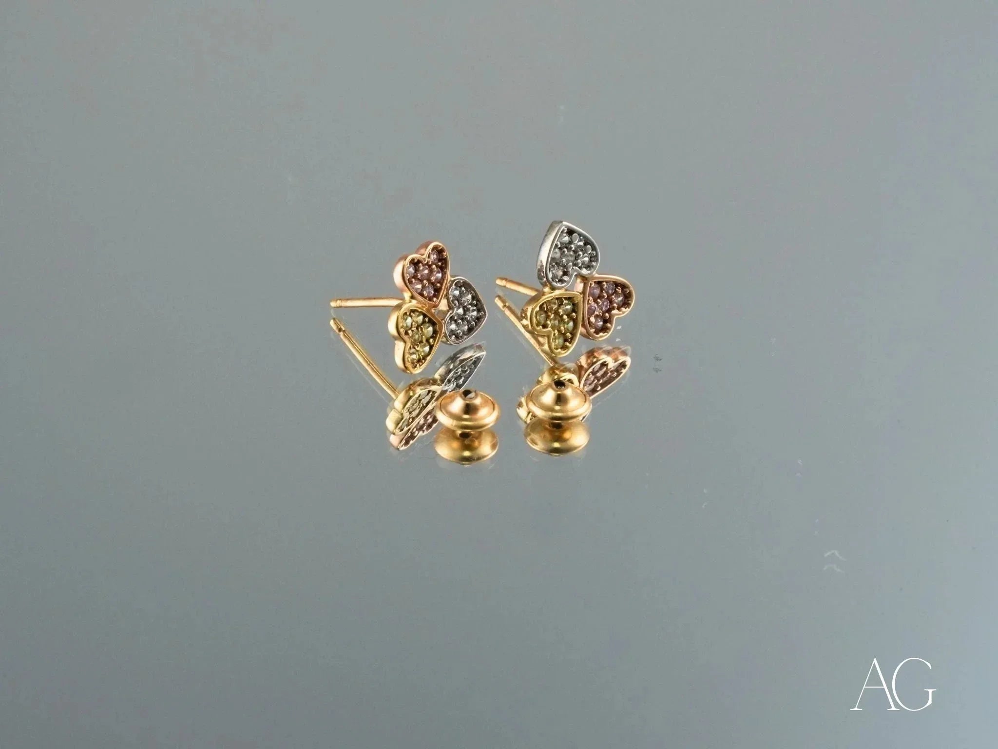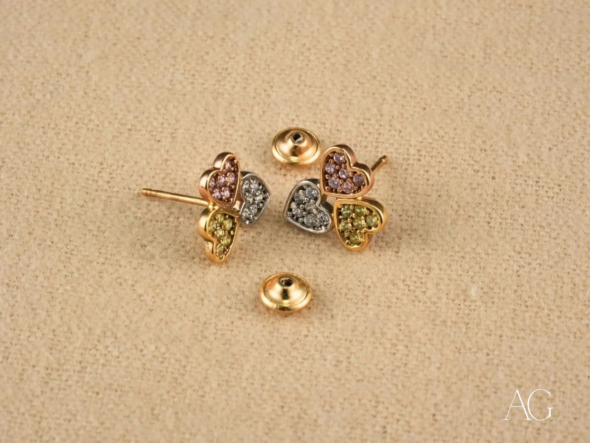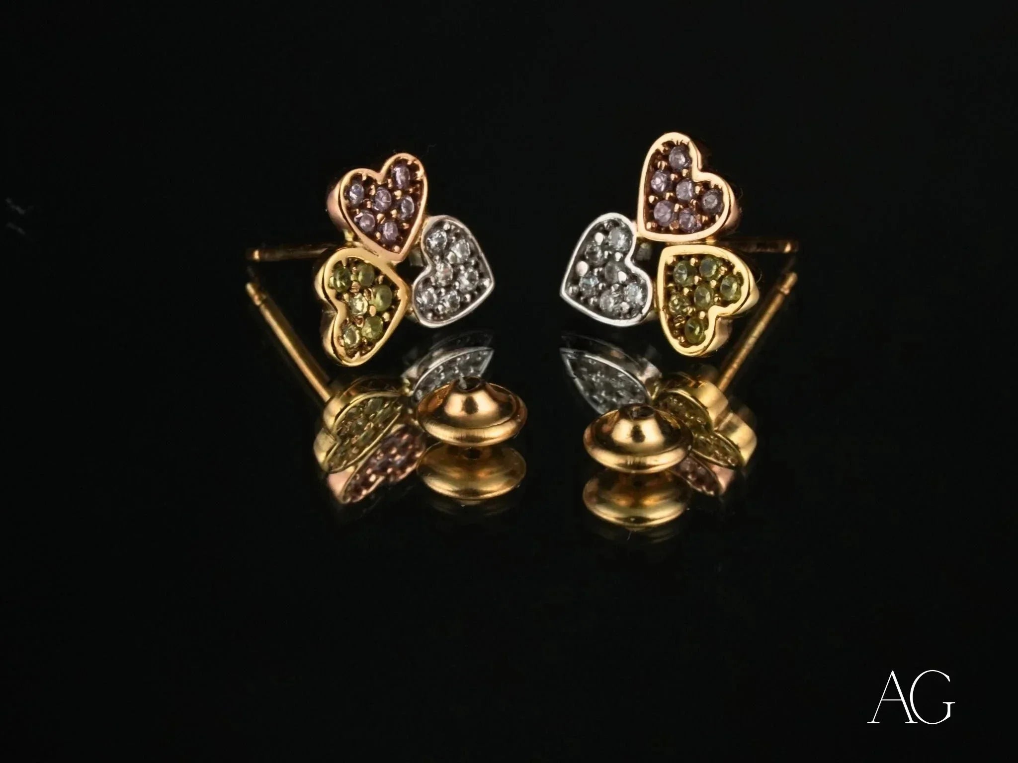 • Three-Heart Design: The charming triple-heart motif, crafted in the three golds, symbolizes love, unity, and enduring elegance. This subtle detail adds a touch of romance to these exquisite earrings.