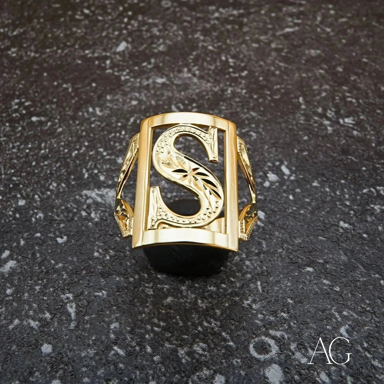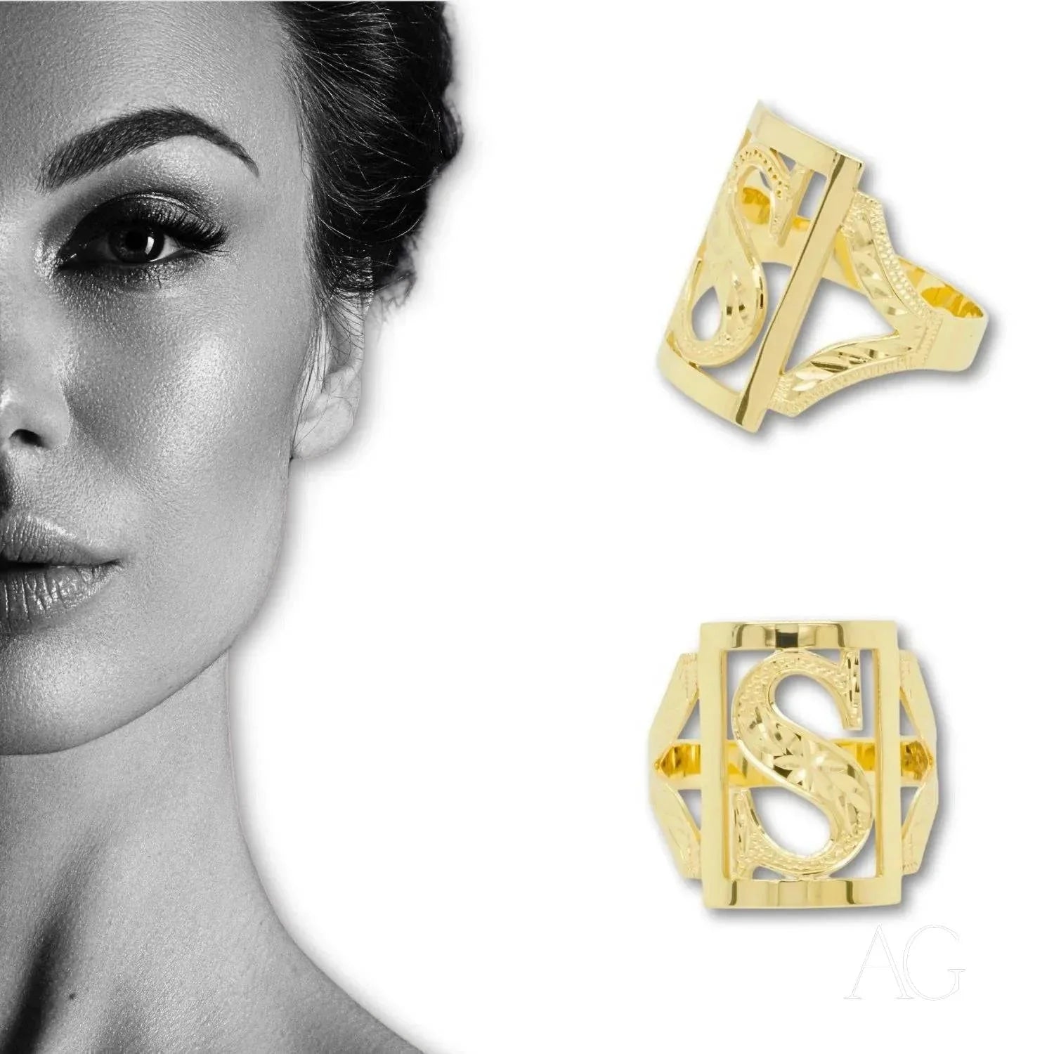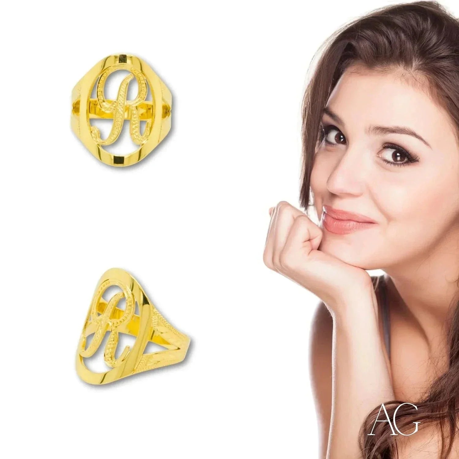 Masterful Craftsmanship: Each Initial Letter Ring is more than a piece of jewelry; it's a miniature sculpture, meticulously handcrafted by skilled artisans who pour their passion into every curve and detail. Witness the difference between mass-produced and truly bespoke.Premium Quality Across Materials: From the cool shimmer of Sterling Silver to the sun-kissed glow of 10k or 14k Gold, and the rich, captivating depth of our Art Gold Signature, your chosen metal will not only stand the test of time but become even more precious with each passing year.
