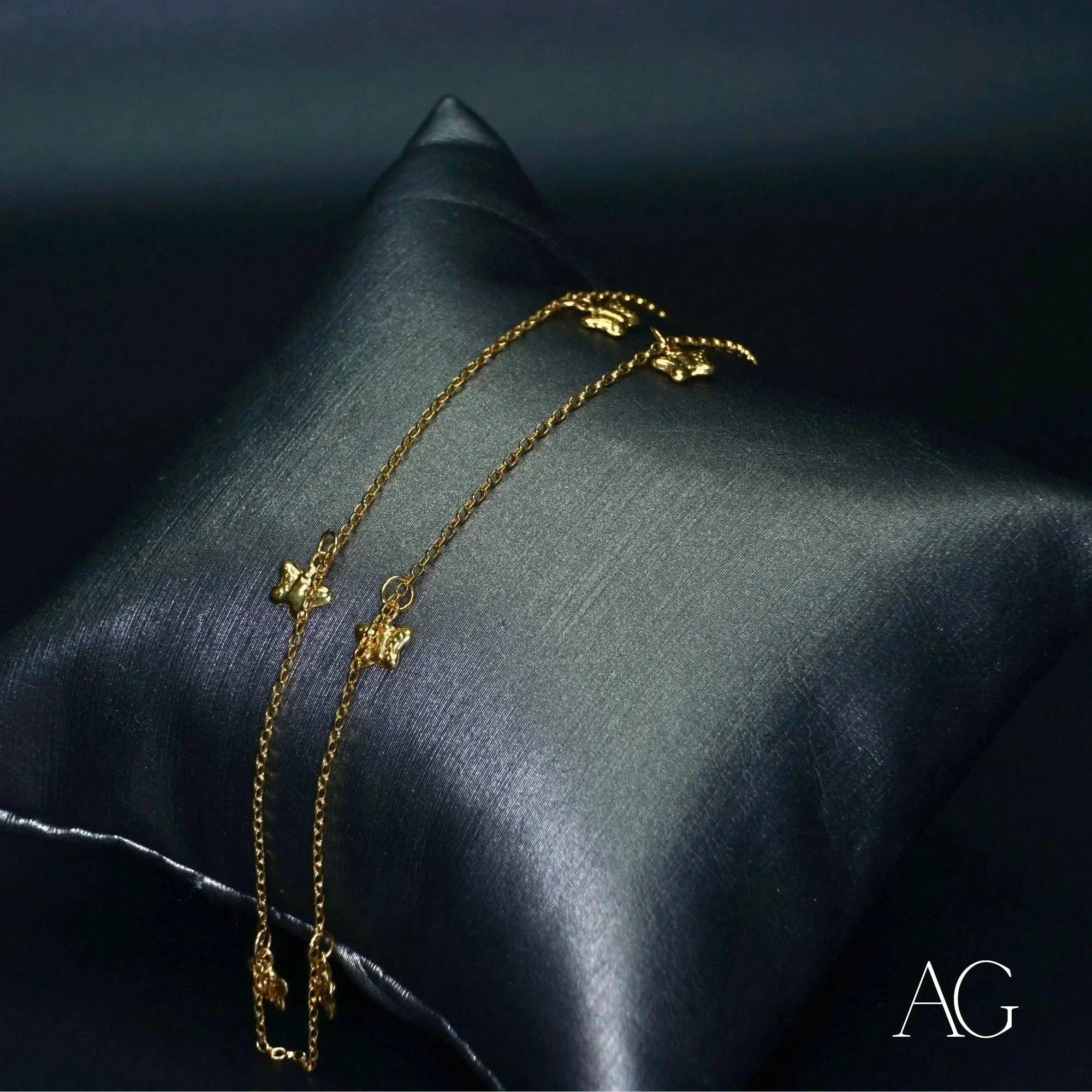 Is this anklet suitable for everyday wear? Absolutely! Its durable 18k gold construction and secure clasp make it perfect for daily wear. Let its playful charm brighten even the most ordinary days.How do I care for this gold anklet with butterfly charms? Preserve its radiant shine by gently cleaning it with a soft cloth. Avoid contact with harsh chemicals or perfumes to maintain the integrity of the 18k gold and the delicate butterfly charms. What makes the butterfly charms special? Butterflies are timeless symbols of transformation, beauty, and freedom. These charming butterfly pendants add a layer of meaning to your jewelry, making this more than just an anklet – it's a personal statement.