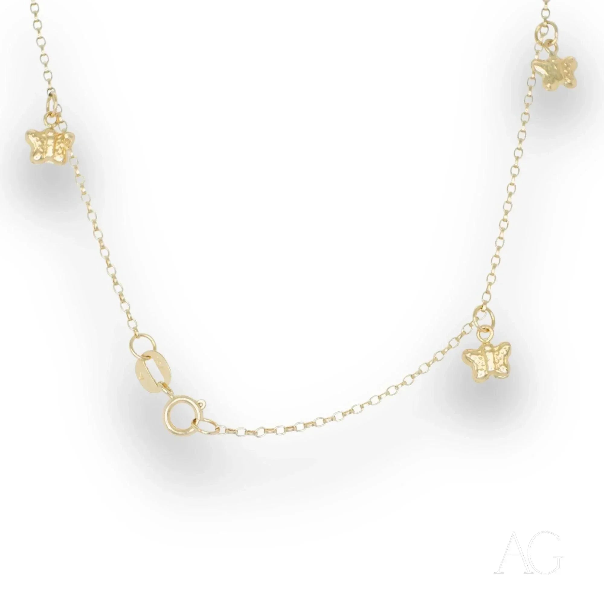 Unleash your inner radiance with the ethereal beauty of our 18k Gold Anklet, adorned with enchanting butterfly charms. This exquisite piece, measuring 9 inches and weighing a delicate 1.3 grams, isn't just jewelry; it's a whisper of magic against your skin. The luxurious warmth of 18k gold intertwines with the playful elegance of the charming butterfly pendants, creating an anklet that effortlessly elevates any outfit, from casual chic to elegant soirées. Imagine sunlight catching the delicate wings of the butterflies as you move, a subtle shimmer that speaks volumes about your impeccable taste.
