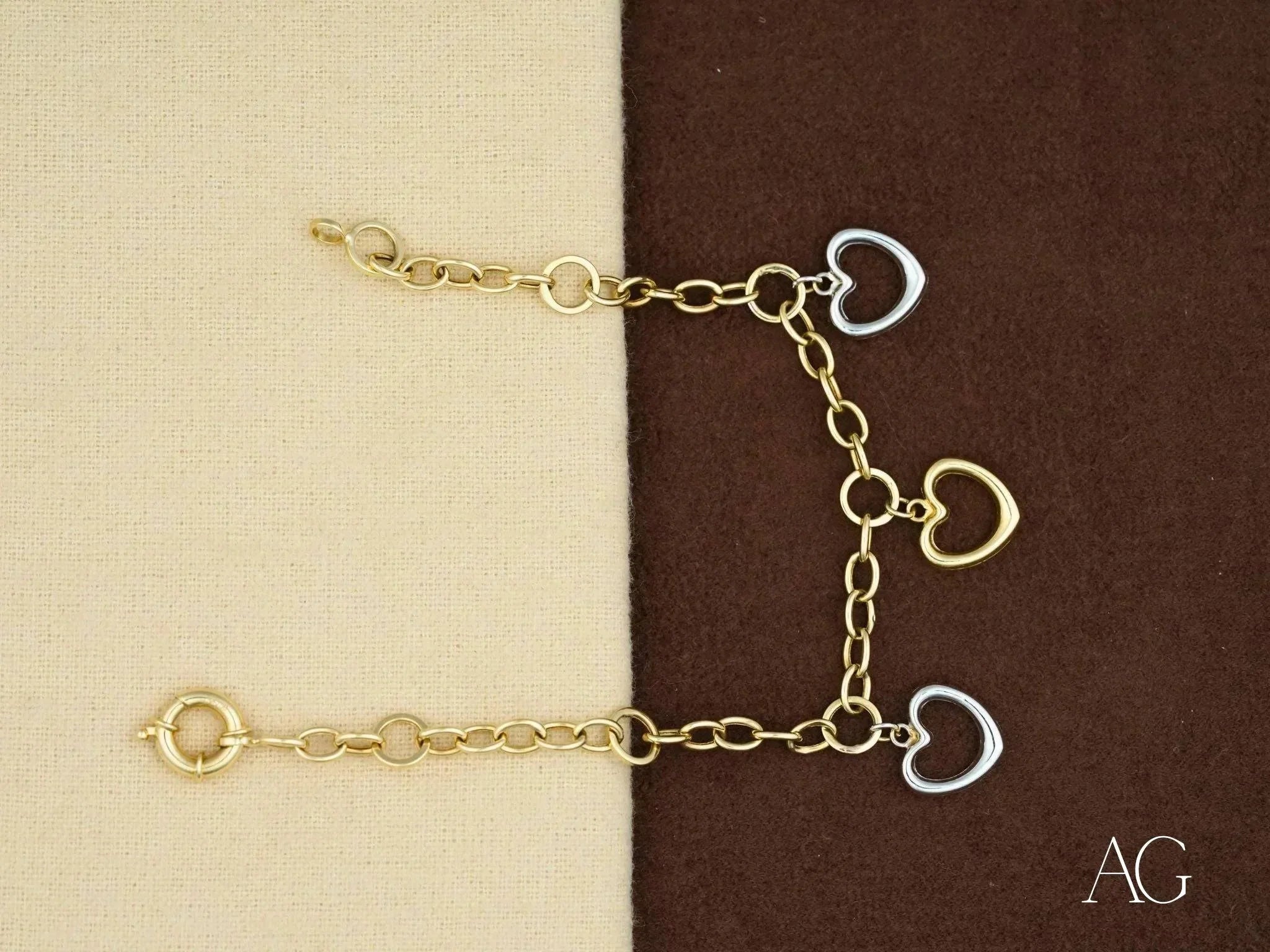 Material: 18k Yellow and White GoldLength: 8 inches (20.32 cm) – a universally flattering length that graces the wrist beautifully.Weight: 6.1 grams – the perfect balance of presence and comfort for everyday wear.Design: Features three heart motifs, alternating between yellow and white gold, symbolizing enduring love and affection.Clasp: Secure spring ring clasp for peace of mind and effortless wear.