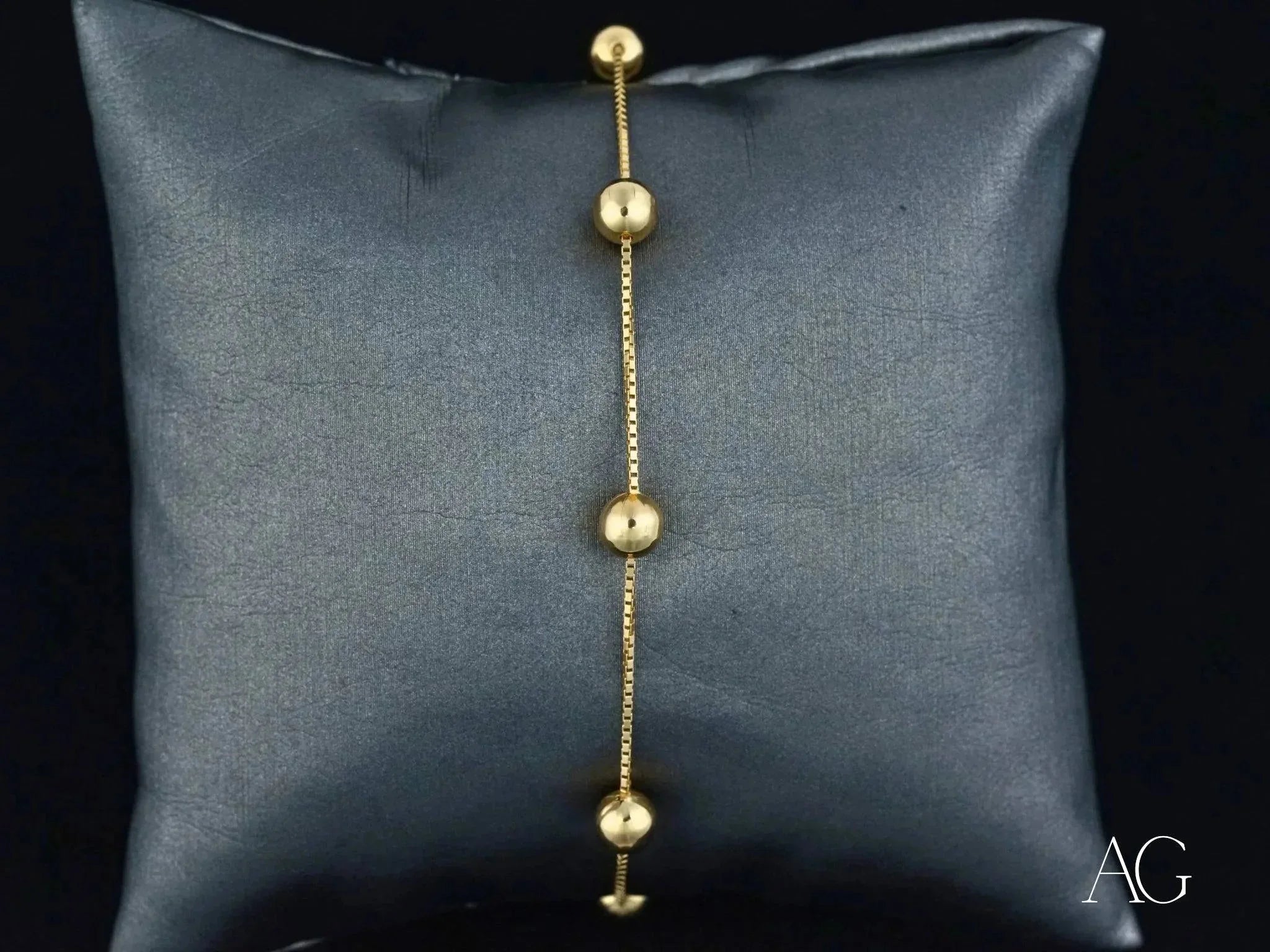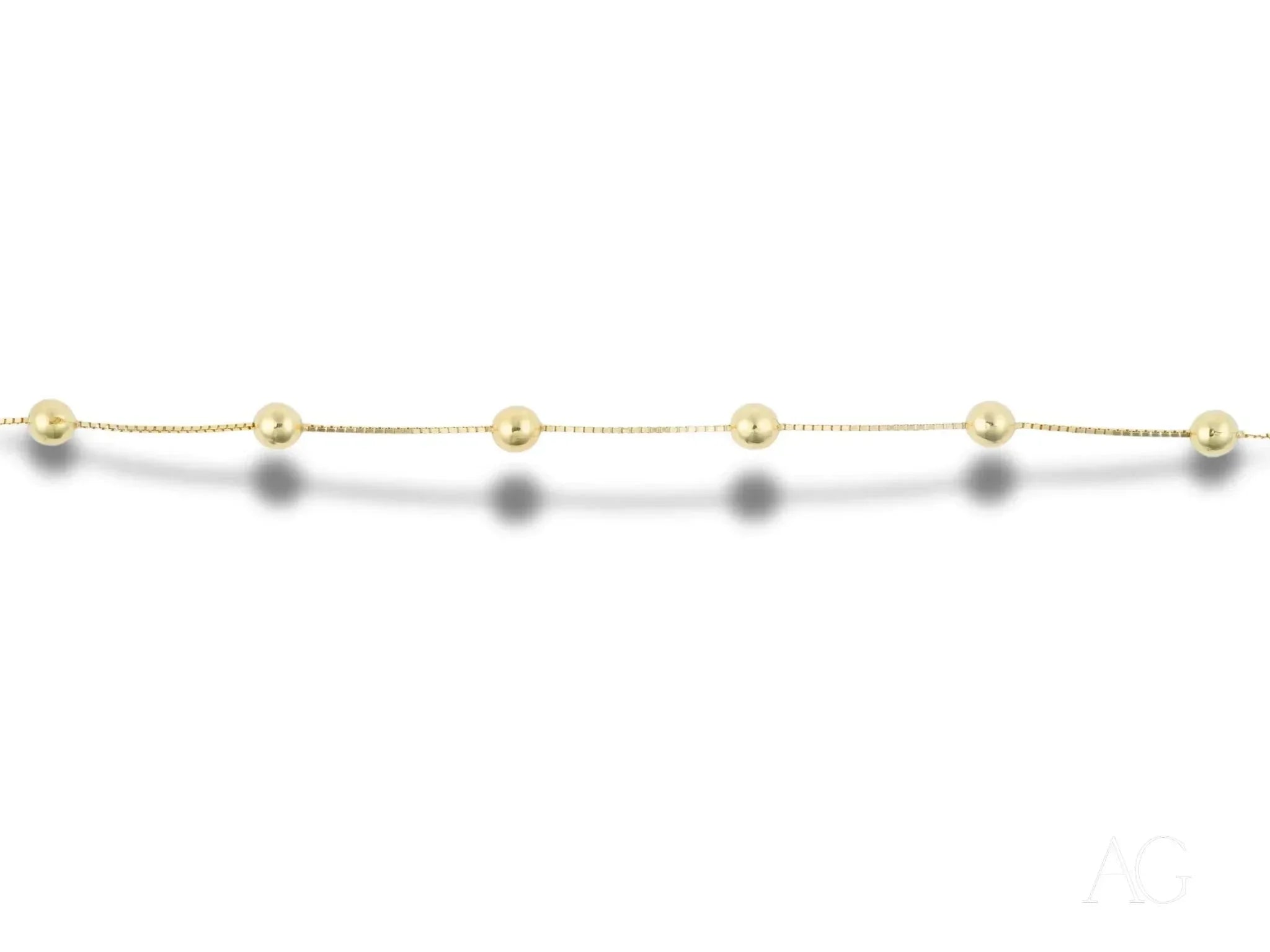• A Legacy of Refinement: The Delicate 18k Solid Gold Bracelet with polished gold spheres transcends mere adornment; it’s a tangible expression of your discerning style. Whether enhancing a casual ensemble or adding a touch of understated glamour to formal attire, this art gold jewelry piece elevates any look with its delicate charm and impeccable craftsmanship. It's a piece that speaks volumes without uttering a word.