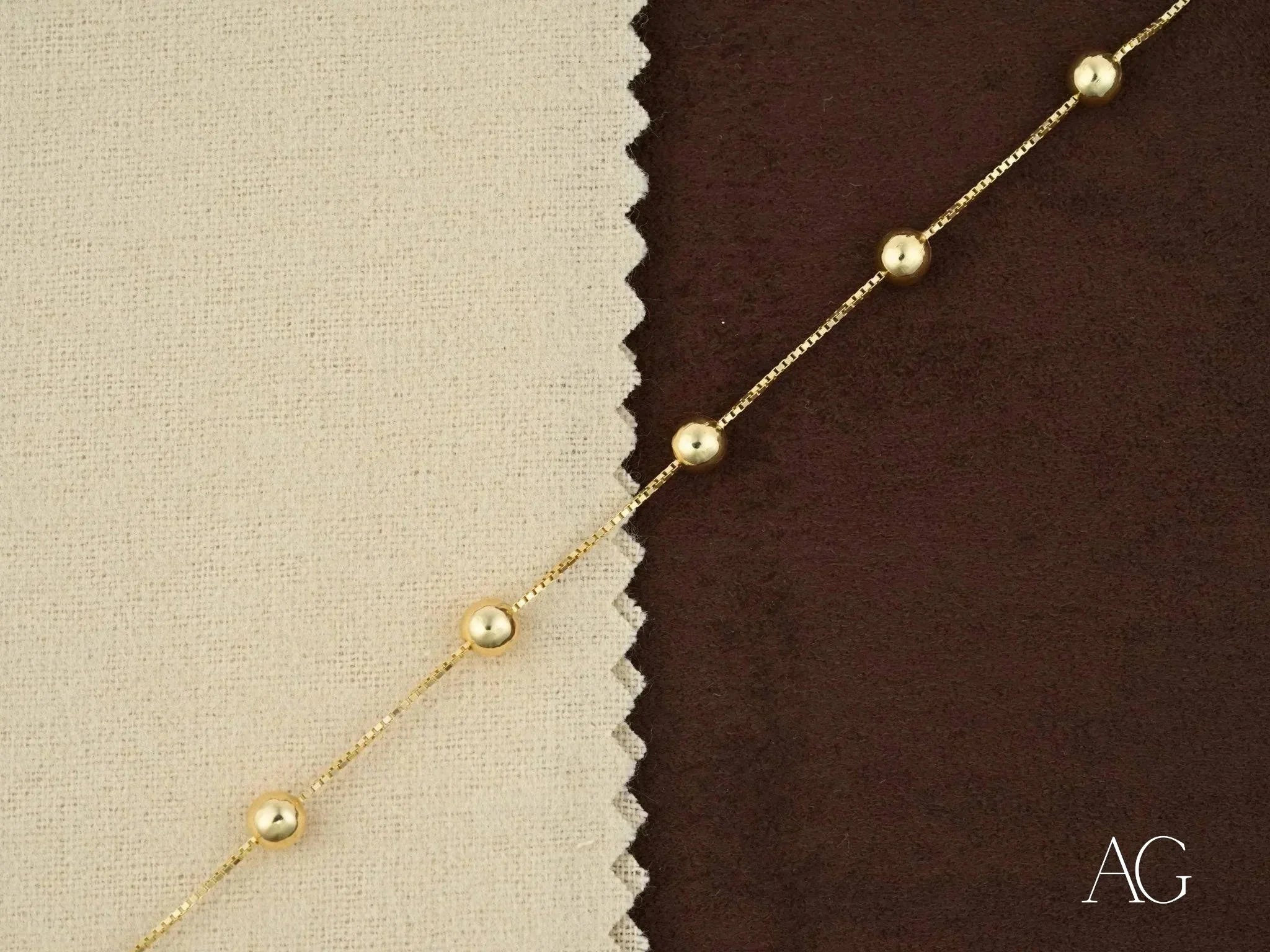 • Design: A delicate chain, kissed with shimmering polished gold spheres, secured with a whisper-quiet spring ring clasp