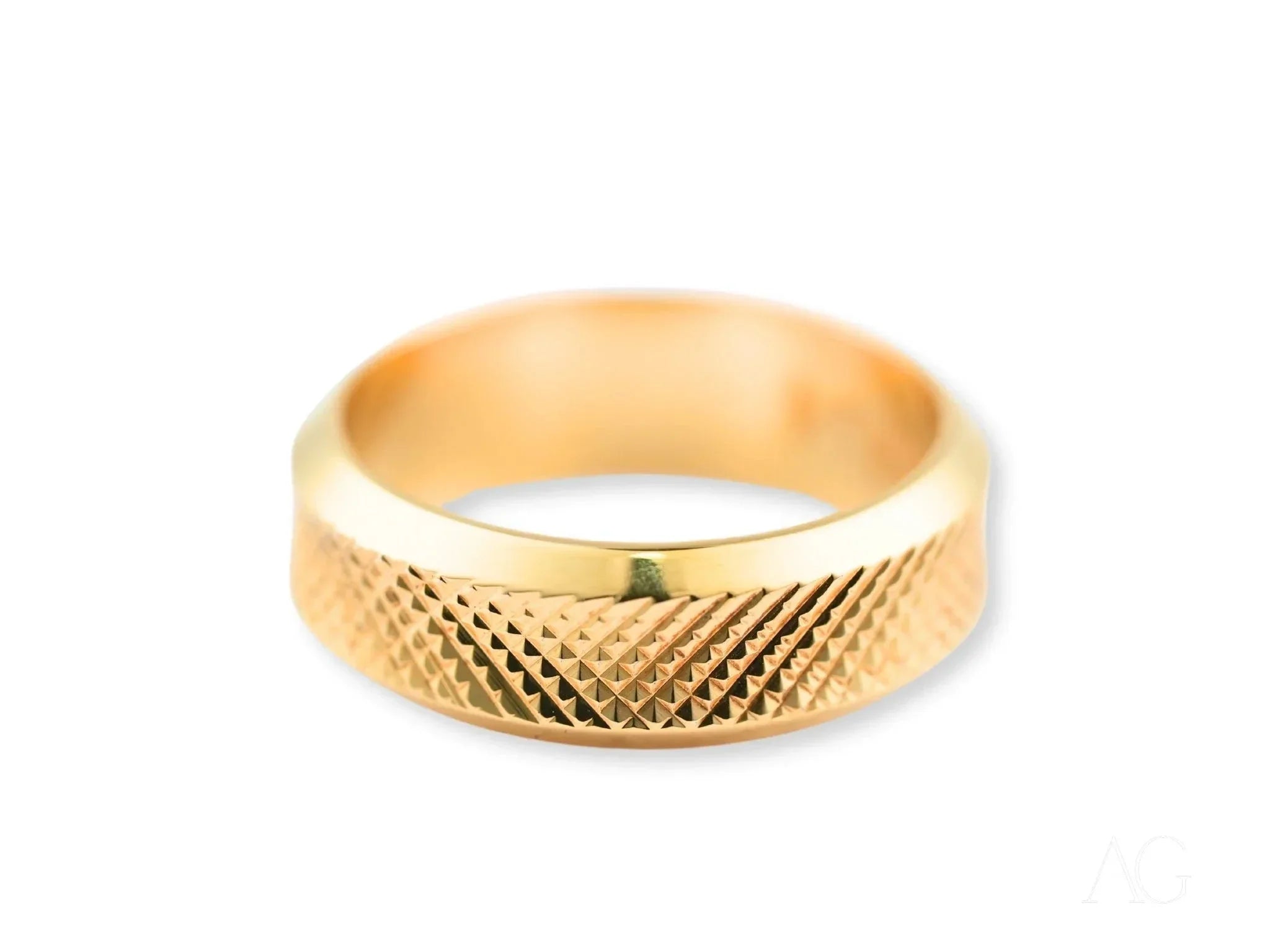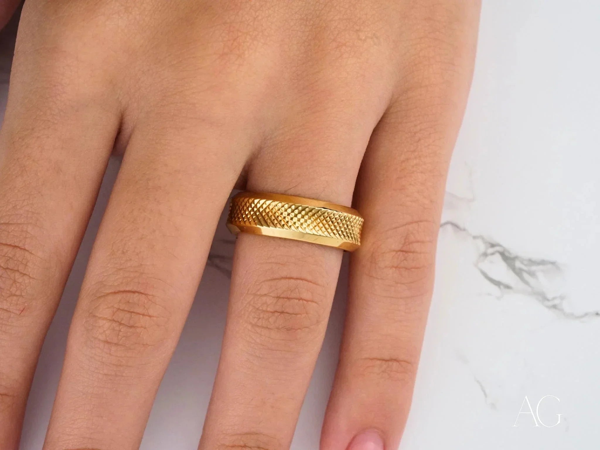 Intricate Diamond-Like Pattern: This finely detailed design, reminiscent of a shimmering tapestry, dances with light, creating a sophisticated and captivating sparkle. The intricate pattern symbolizes the complex and beautiful journey of love, reflecting its multifaceted nature.7mm Wide Band: Make a statement with the bold 7mm width, commanding attention without sacrificing timeless elegance. This substantial band offers a luxurious feel and provides the perfect canvas for the intricate diamond-like pattern to truly shine.Available in 14k or 18k Gold: Indulge in the luxurious richness of 18k gold, known for its deep, warm hue, or opt for the enhanced durability of 14k gold, perfect for those with an active lifestyle. Both options offer the enduring quality and prestige of gold, ensuring your Diamond Tapestry remains a treasured heirloom.Classic Fit: Experience unparalleled comfort with the classic fit design. This ensures the ring rests snugly and securely on your finger, allowing for effortless everyday wear. The smooth interior band maximizes comfort, making it a joy to wear day and night.Timeless Craftsmanship: Meticulously crafted with premium materials, the Diamond Tapestry is designed to withstand the test of time, mirroring the unwavering strength and enduring beauty of your commitment. This Art Gold Jewelry creation is a testament to exceptional craftsmanship and attention to detail.