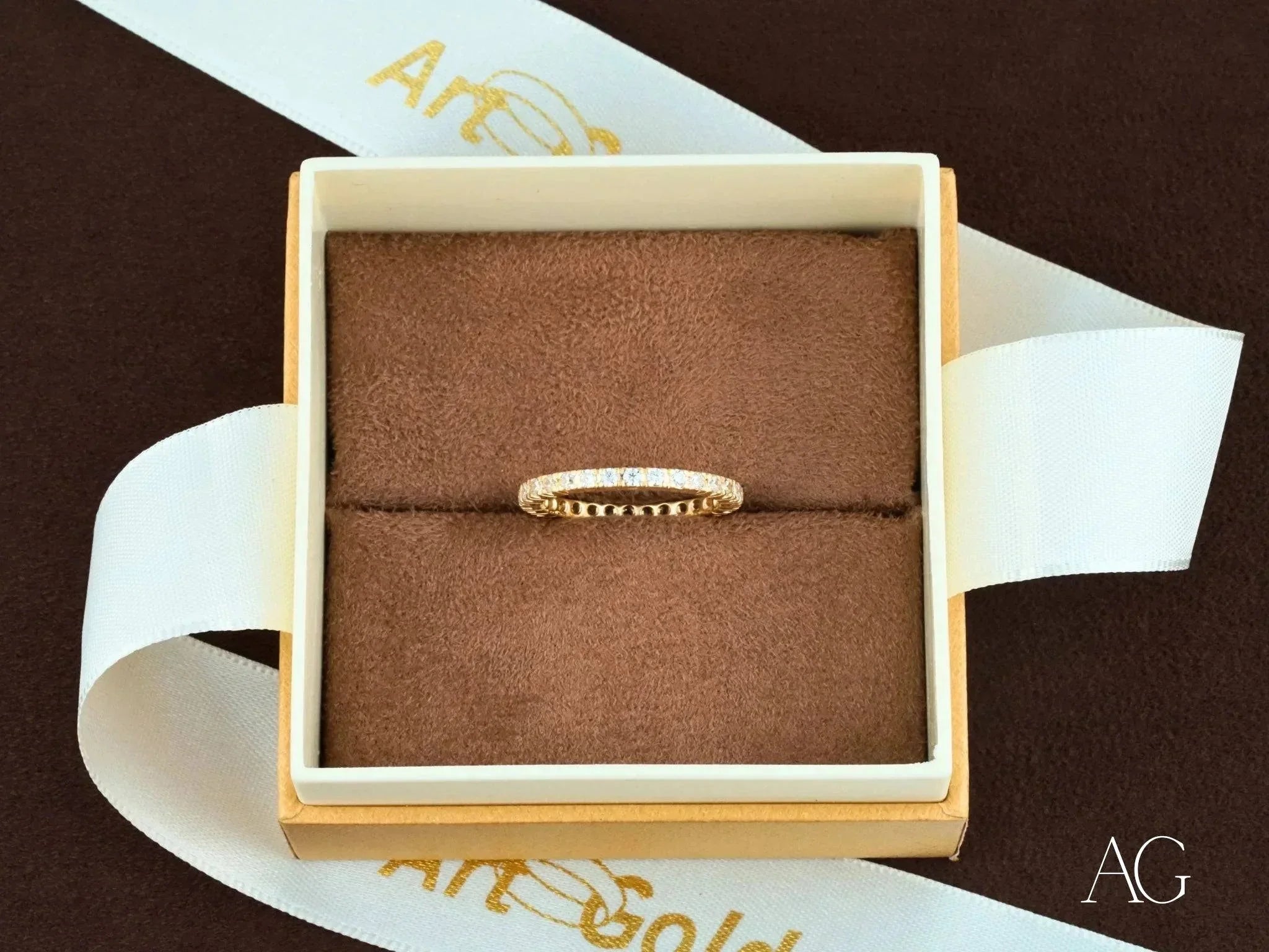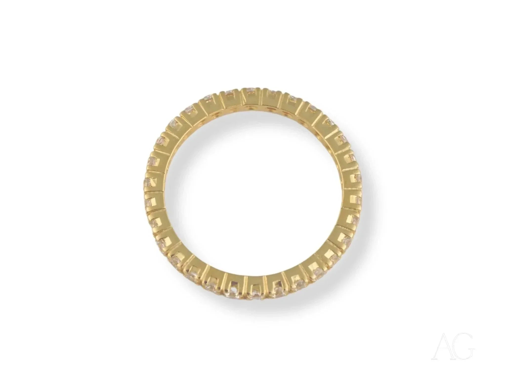 Material: Solid 18k Yellow Gold, ensuring lasting value and enduring brilliance.Stones: Hand-selected, high-quality cubic zirconia (CZ) stones, expertly arranged to maximize their fire and brilliance, surrounding the band in a mesmerizing halo.Design: An elegant and timeless design, crafted to flatter any hand and transcend fleeting trends, making it the perfect choice for all ages and styles.Weight: A substantial 2.5 grams, reflecting the quality and craftsmanship of this exceptional piece.Available Sizes: Sizes 4 to 9 ensure a perfect fit for every wearer.Occasion: Ideal for marking significant milestones like engagements and anniversaries, or for adding a touch of refined sophistication to your everyday look. Gift it to someone special and watch their face light up.Packaging: Presented in a luxurious Art Gold Box, adding an extra touch of elegance and making it an exceptional gift.Certificate: Includes a Certificate of Authenticity, guaranteeing the purity of the elegant 18k gold and the quality of the sparkling cubic zirconia.