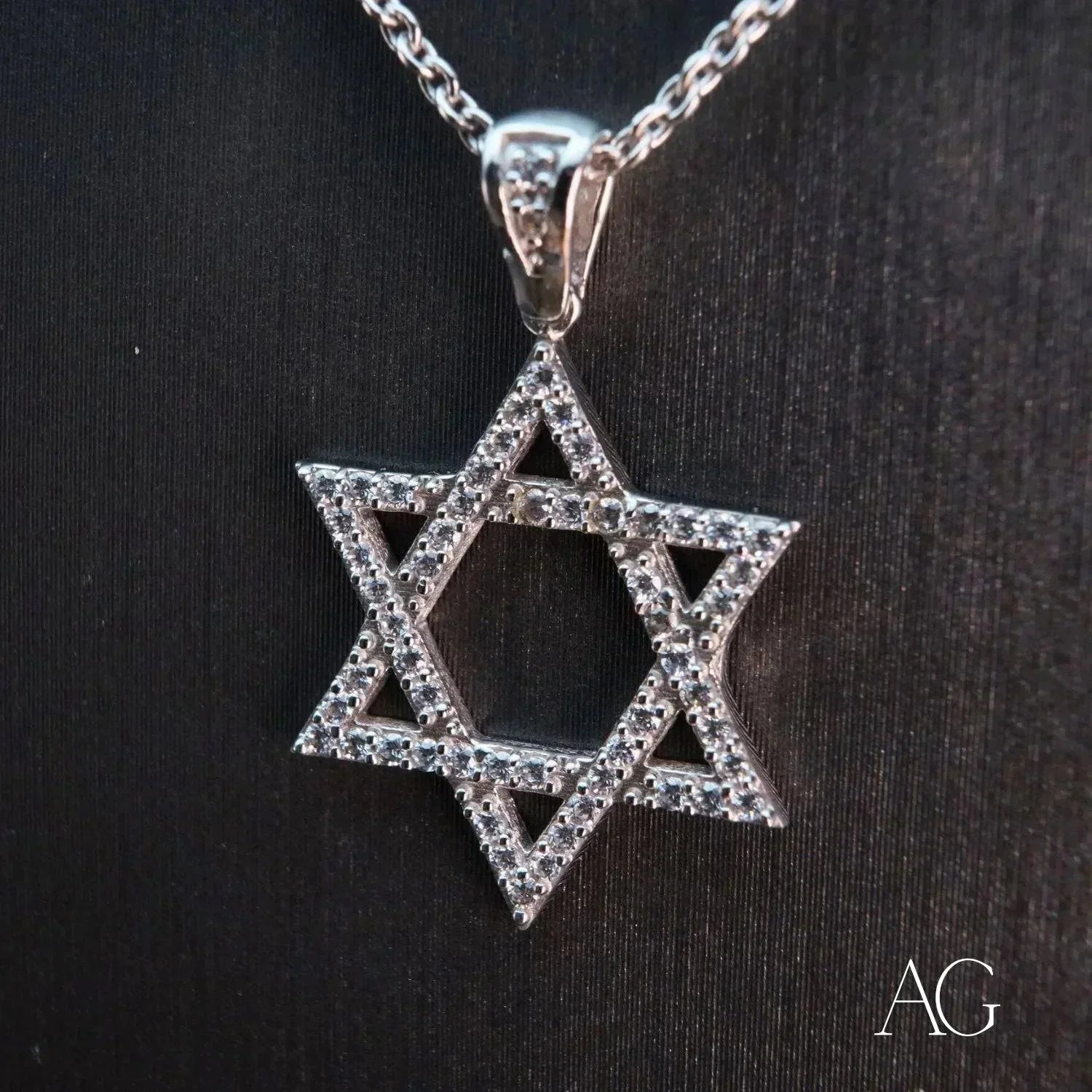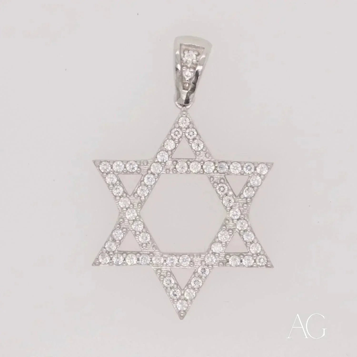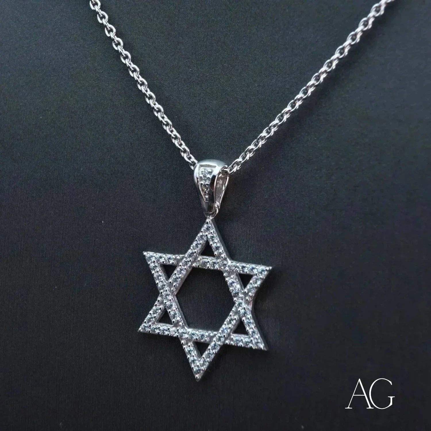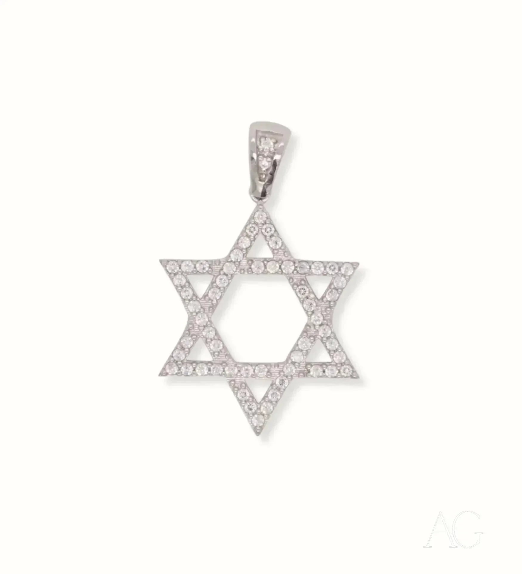 Our Star of David pendant captivates with its celestial brilliance. Hand-set Cubic Zirconia stones, mirroring the stars in the night sky, capture and reflect light with breathtaking intensity. The luxurious 18k white gold setting not only enhances the pendant's symbolic beauty but also ensures lasting durability and enduring value. This exquisite fusion of 18k solid gold and vibrant CZ creates a stunning display of faith and sophistication, a testament to both tradition and modern craftsmanship from Art Gold Jewelry. This piece is the perfect choice for those seeking to express their faith with refined elegance and make a statement of enduring style.