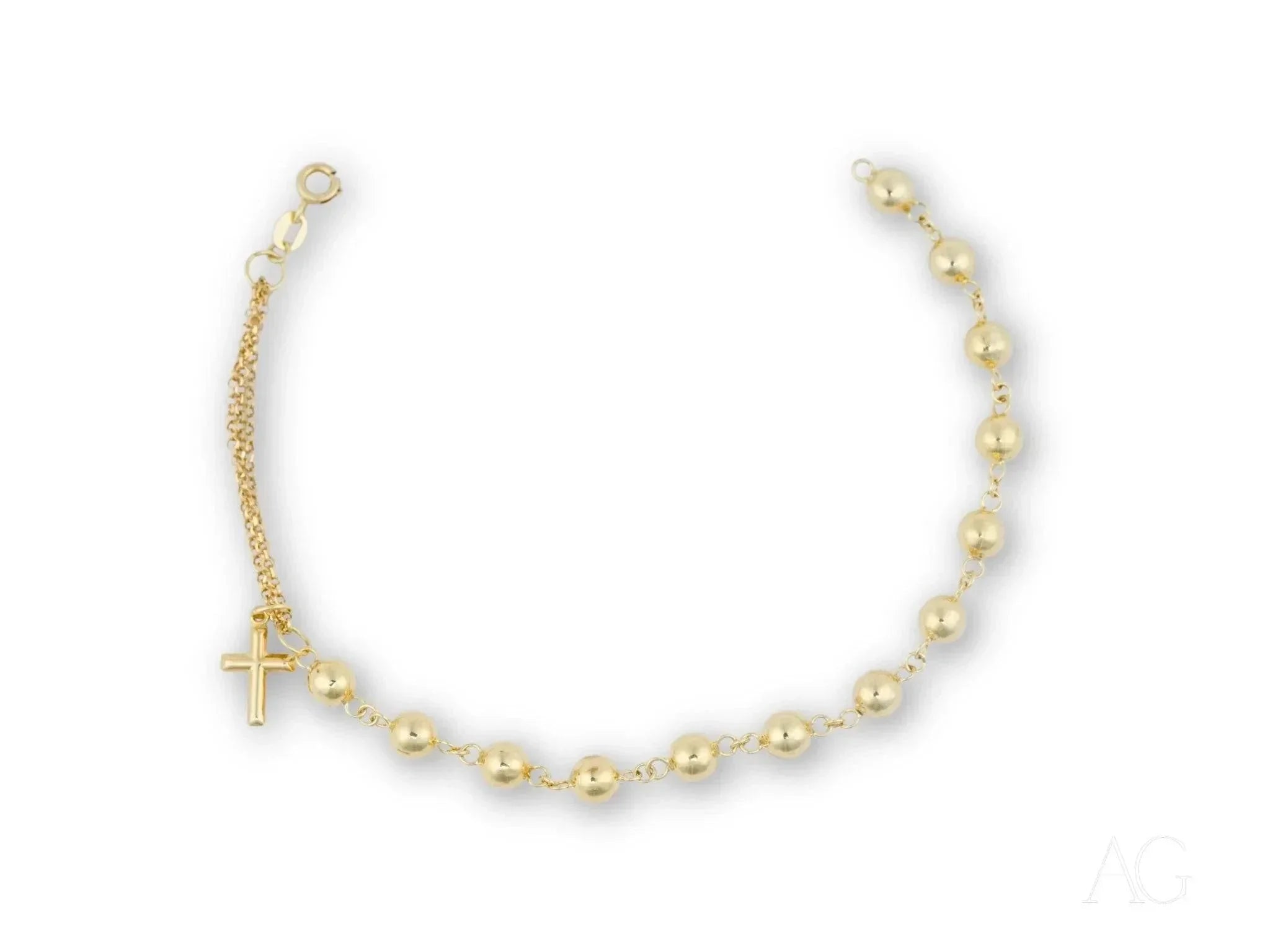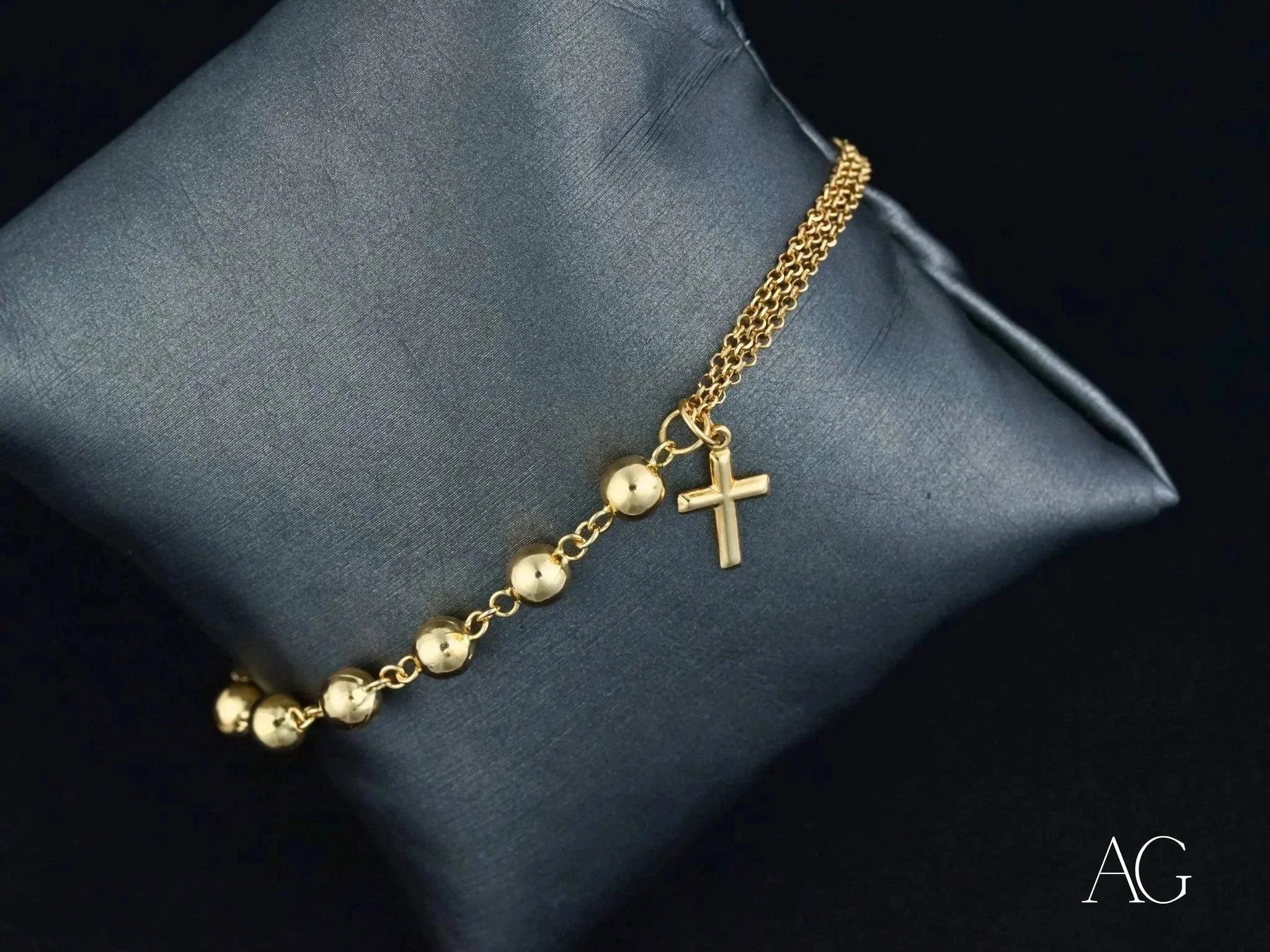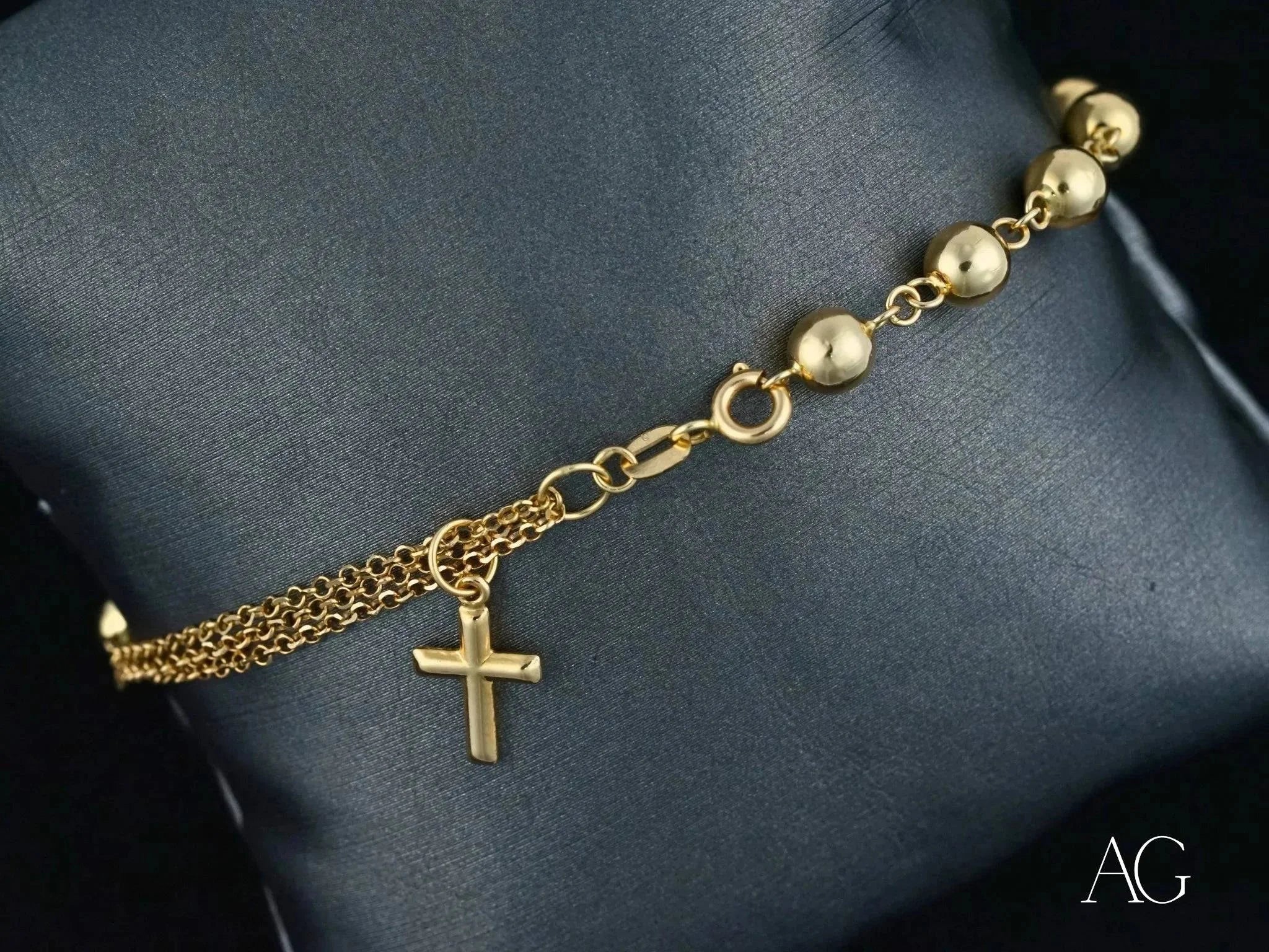 Elegant women's 18k gold bracelet with cross motif and polished gold beads