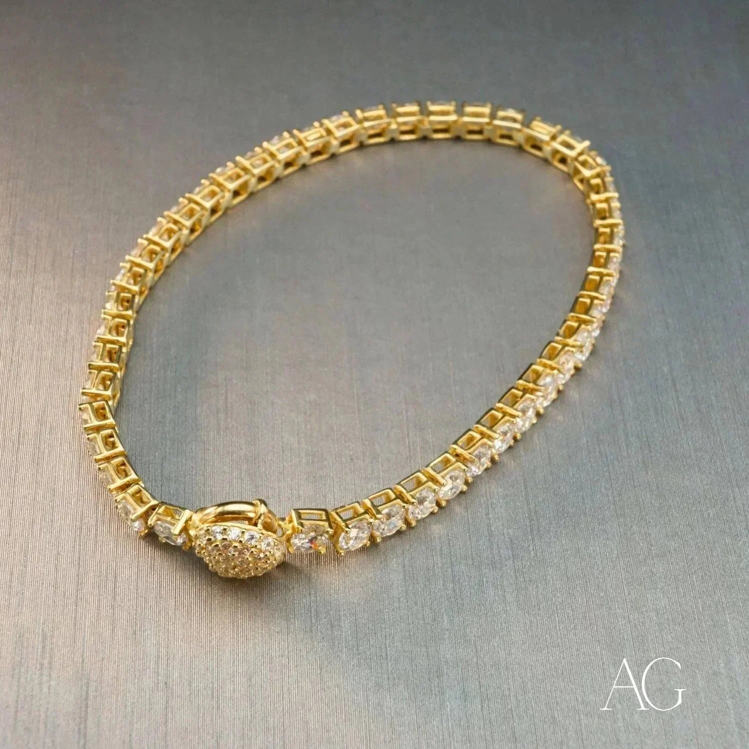 The Radiance of Zirconia Set in 18k Gold Our 18k Tennis Bracelet showcases a seamless river of hand-selected zirconia, each stone radiating unparalleled clarity and brilliance. The rich warmth of 18k gold enhances the fire of these exquisite stones, creating a mesmerizing display of light and luxury. The enduring quality of 18k gold ensures both a luxurious feel against your skin and a timeless appeal that transcends fleeting trends. This Art Gold Jewelry tennis bracelet is an investment in enduring elegance, destined to become a cherished heirloom in any jewelry collection.