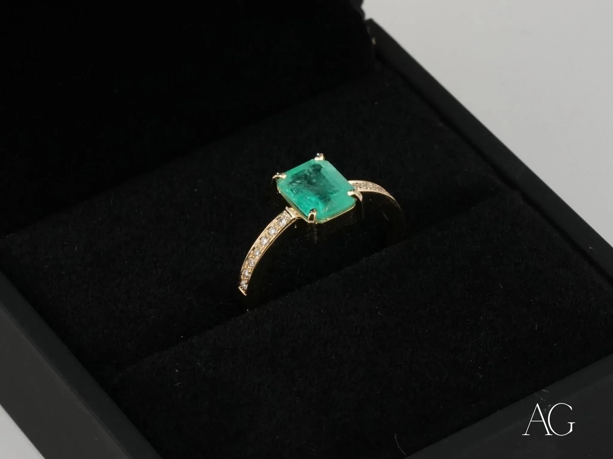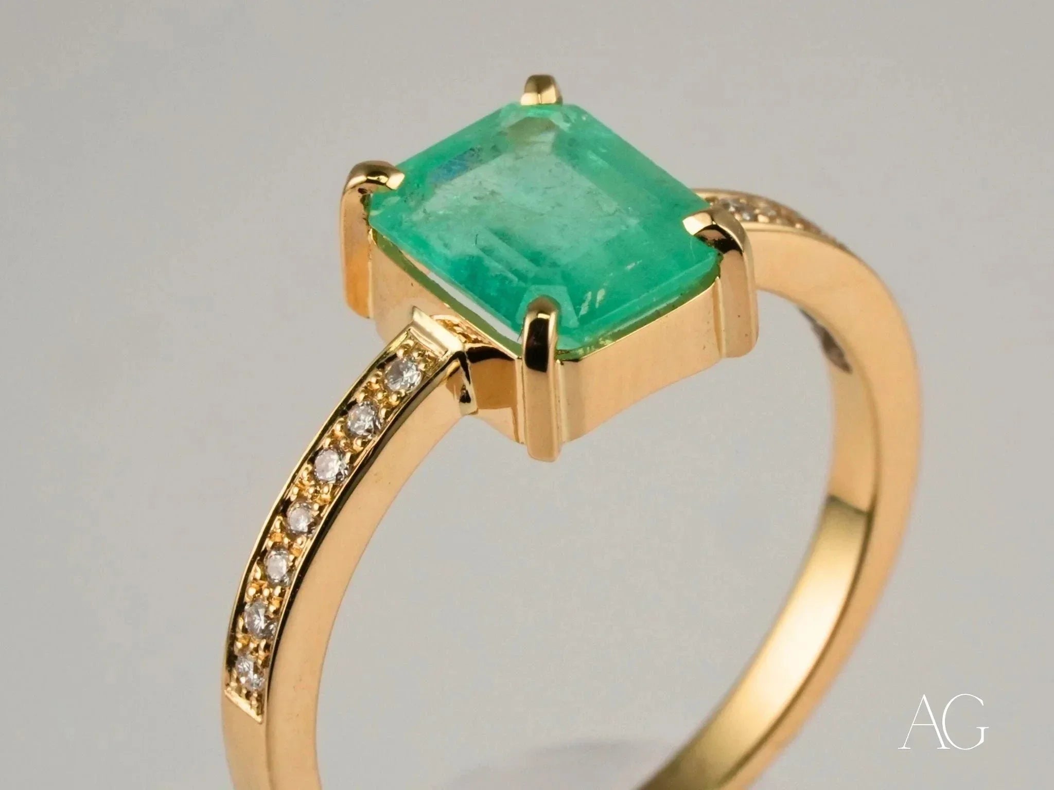 The classic prong setting securely cradles the carat radiant-cut emerald, allowing its natural brilliance to shine through. The diamond-studded band adds a touch of regal splendor, creating a design that transcends fleeting trends.