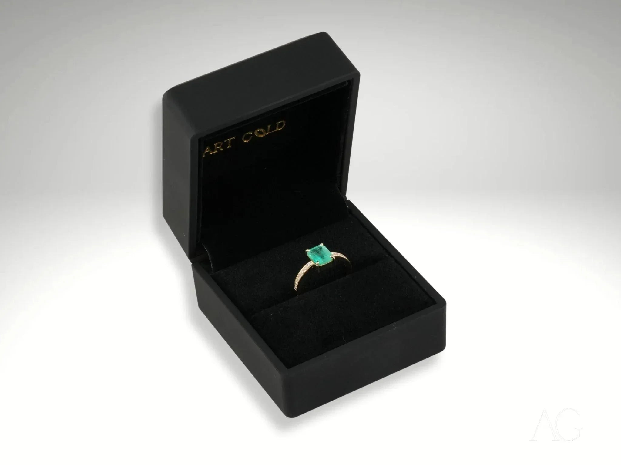 The emerald's beauty is further amplified by the dazzling sparkle of 0.007 carat total weight of diamonds meticulously set along the band, creating a breathtaking interplay of light and color.
