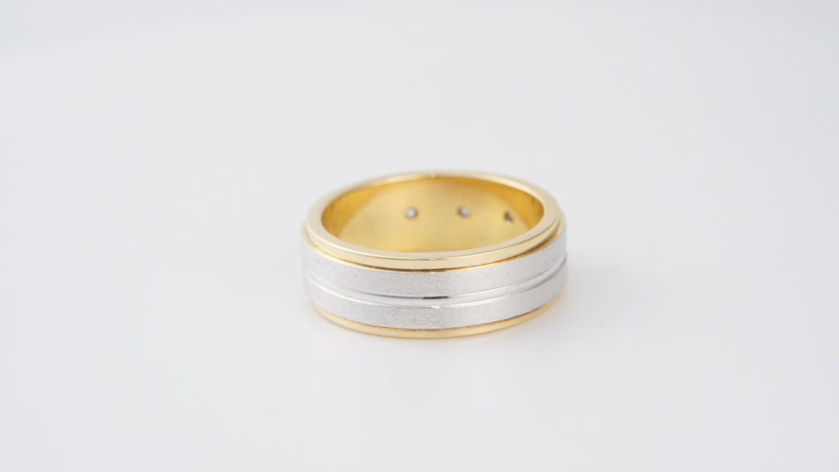 Dual-Tone Design: The seamless fusion of 18k or 14k yellow and white gold creates a captivating contrast, symbolizing the unity of two distinct individuals becoming one. This modern yet timeless aesthetic sets the Eternal Duo apart, making it a true reflection of your unique love story.Three Brilliant Diamonds: Representing love, trust, and commitment, these carefully selected diamonds elevate the Eternal Duo from a beautiful band to a powerful symbol of your enduring bond. Their radiant sparkle adds a touch of glamour to your everyday life.7.35mm Wide Band: This substantial width provides a confident and sophisticated presence on the finger, while remaining comfortable for everyday wear. The Eternal Duo makes a statement without sacrificing comfort.Available in 18k or 14k Gold: Art Gold Jewelry offers the choice of luxurious 18k gold or the enduring durability of 14k gold, allowing you to select the perfect metal to match your lifestyle and preference.Timeless Elegance: The Eternal Duo from Art Gold Jewelry transcends fleeting trends. Its classic elegance ensures it will remain a cherished symbol of your love for years to come.