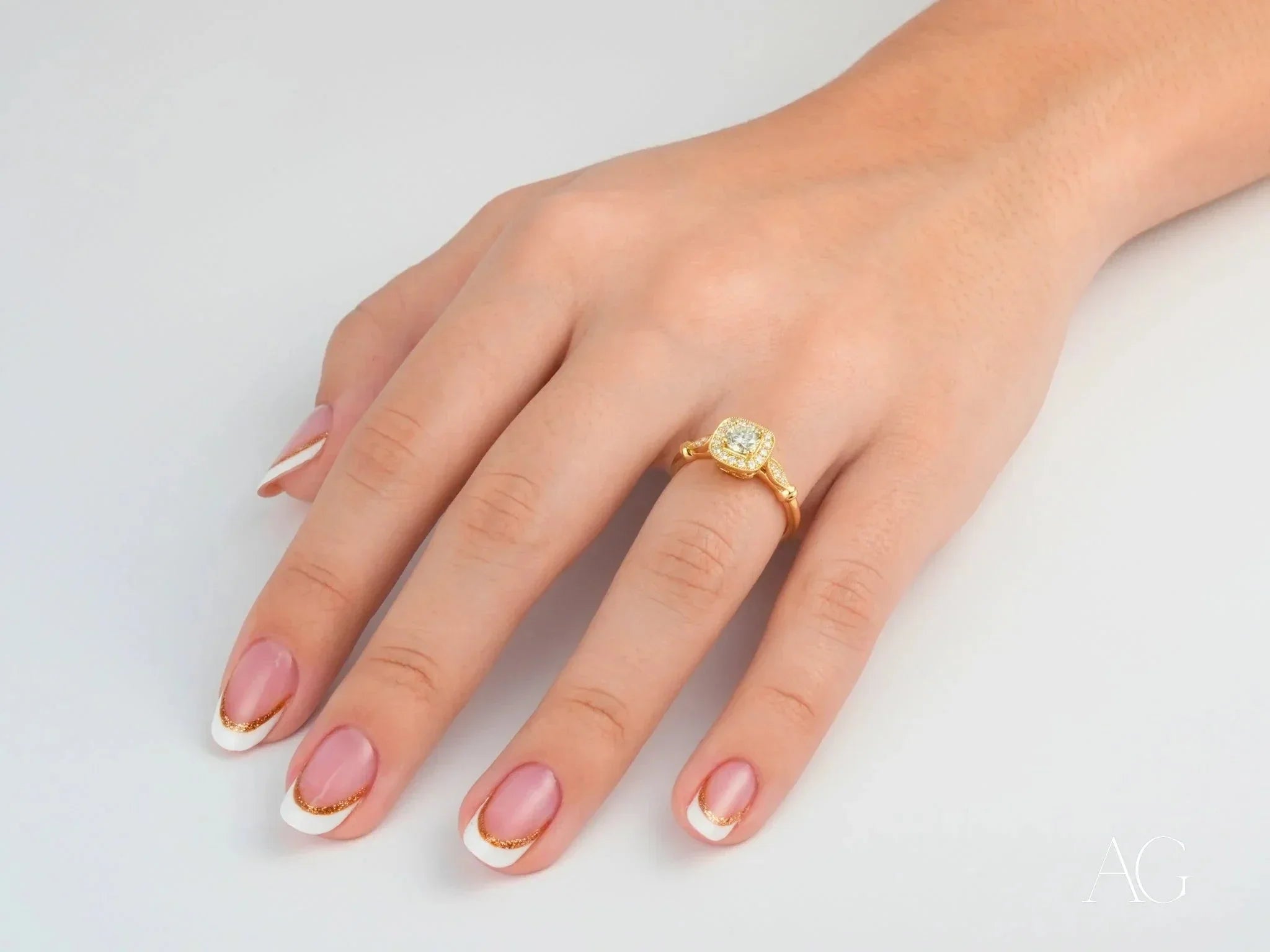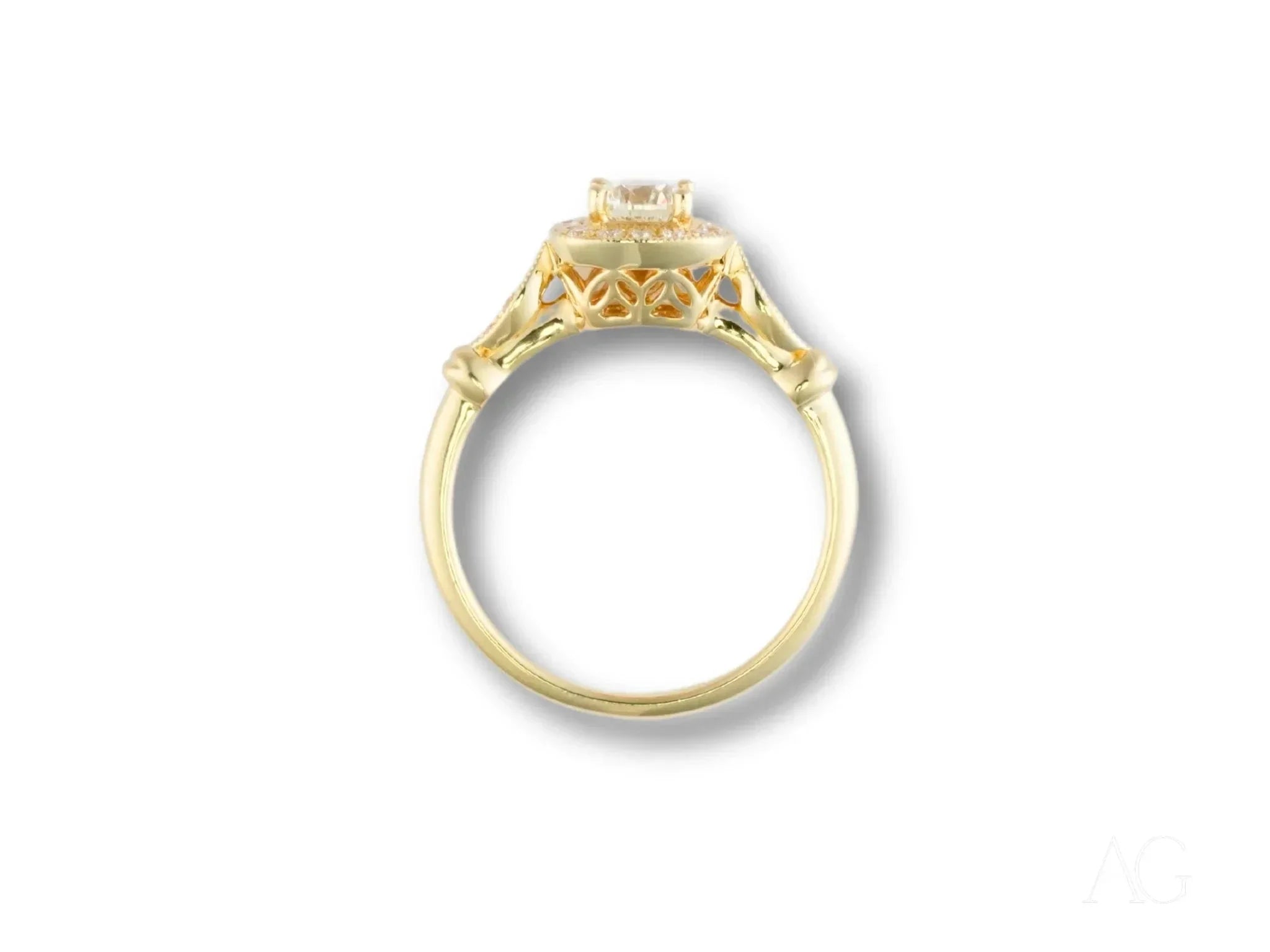 The Eternal Embrace: 18k Yellow Gold Engagement Ring with 0.46 Ct Center Diamond is more than just a ring; it's a symbol of eternal love, meticulously crafted by Art Gold Jewelry. With its captivating halo design, luxurious 18k yellow gold setting, and brilliant diamonds, this eternal love diamond is the perfect embodiment of your commitment. Begin your forever with a ring as timeless and enduring as your love story.