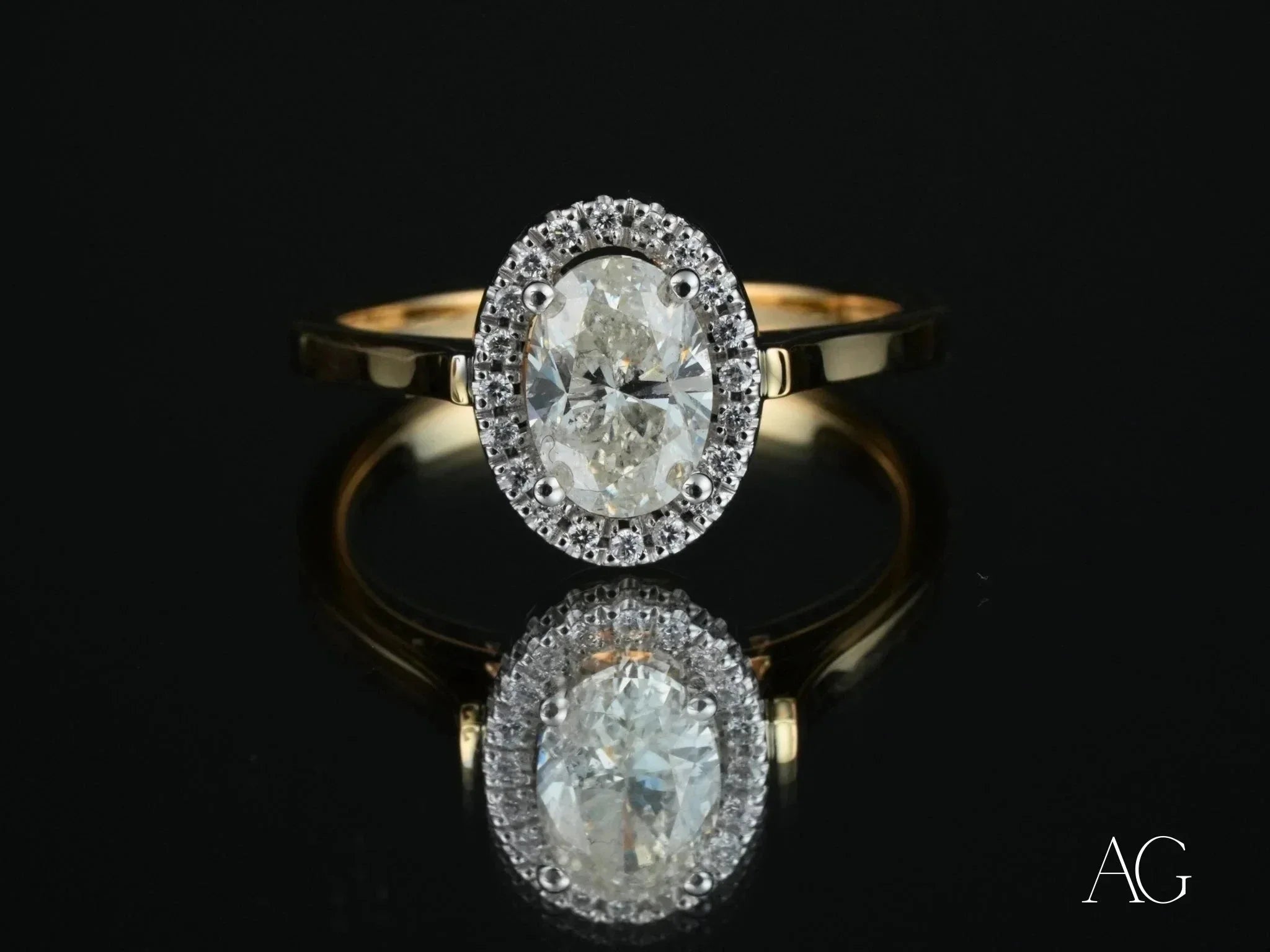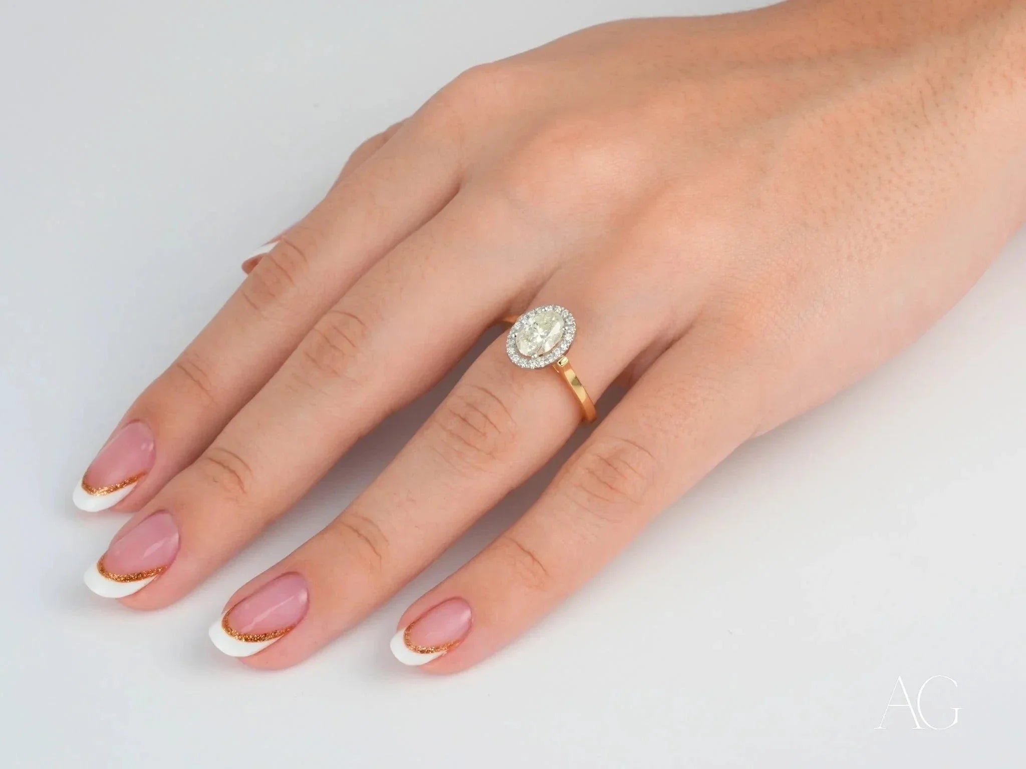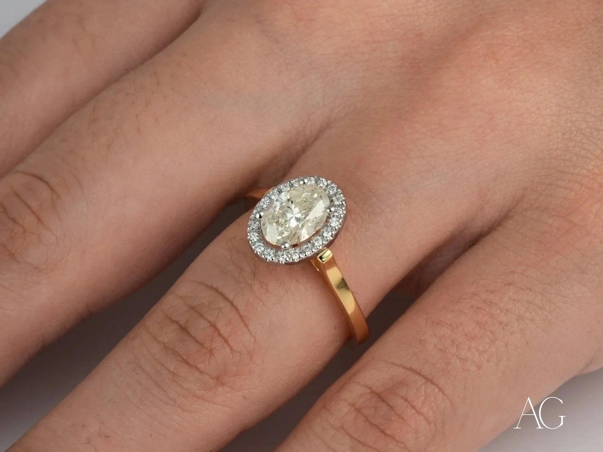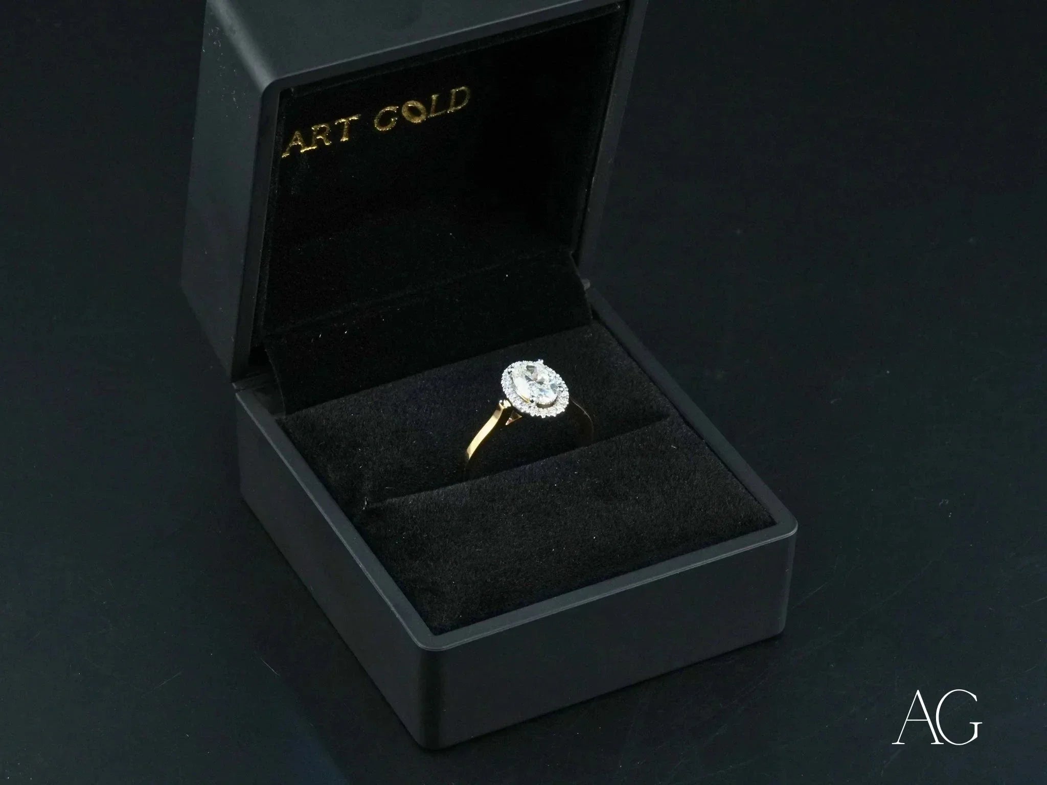 The Eternal Halo: 18k Gold Engagement Ring with 1.22 Ct Oval Diamond and Halo is more than just a ring; it's a promise, a symbol of a love destined to last a lifetime. The radiant oval diamond, enhanced by the delicate halo and set in luxurious 18k gold, embodies the enduring strength and beauty of your commitment. Choose the Eternal Halo and begin your forever with a piece as timeless and brilliant as your love story. Presented in an elegant Art Gold Jewelry ring box with a Certificate of Authenticity, the Eternal Halo is the perfect embodiment of your eternal love.