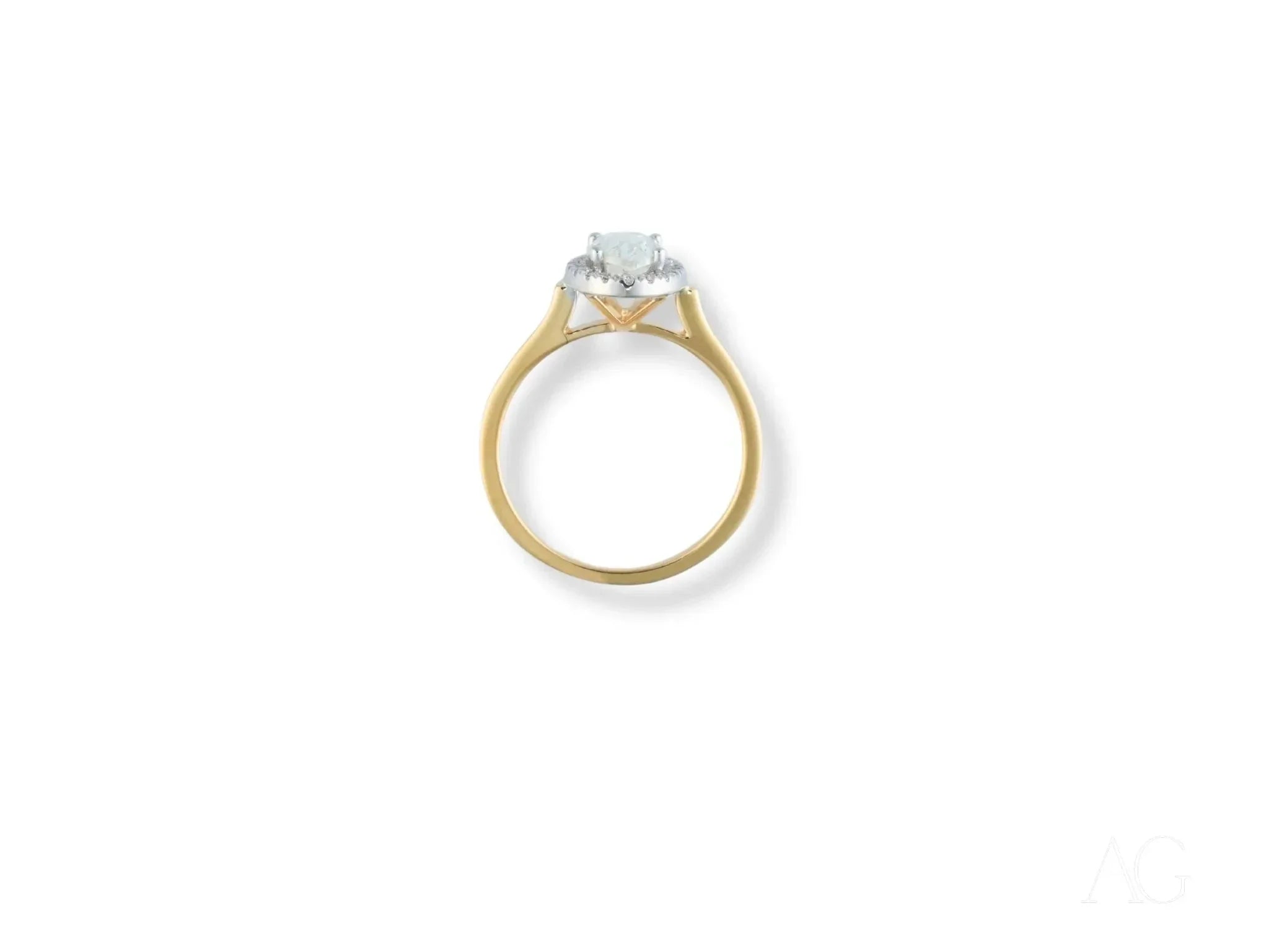 The delicate halo surrounding the oval diamond represents a love that radiates outward, a symbol of an unbreakable bond that shines brightly in every aspect of your lives. It's a visual representation of the enduring strength and beauty of your commitment.
