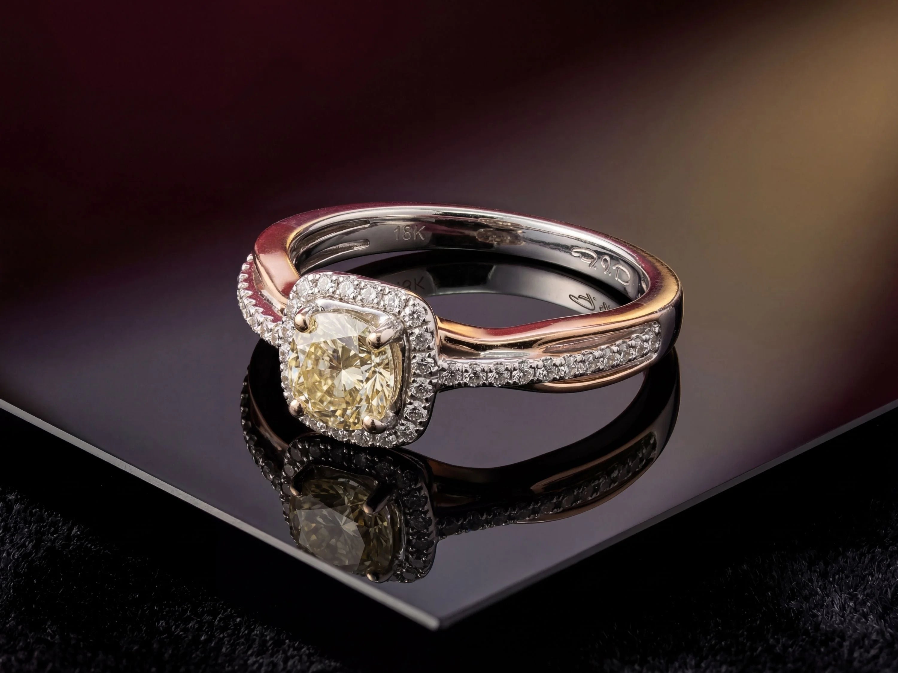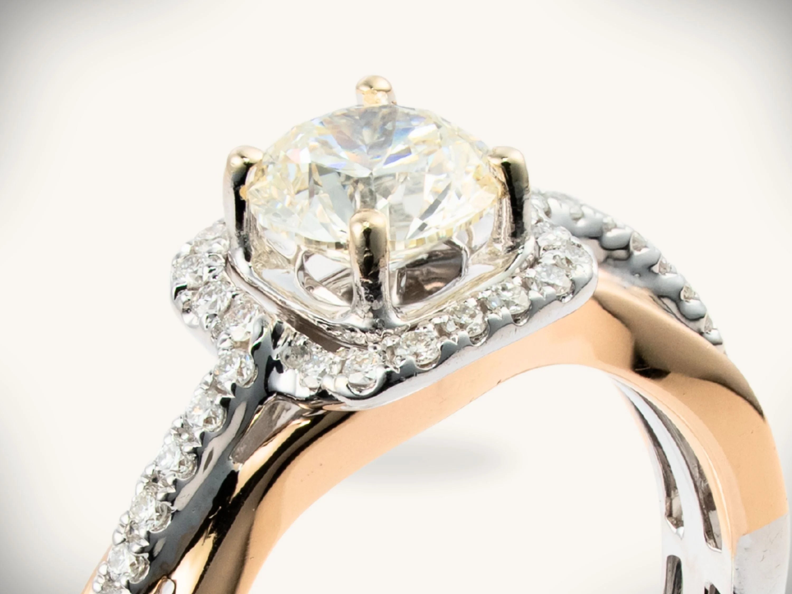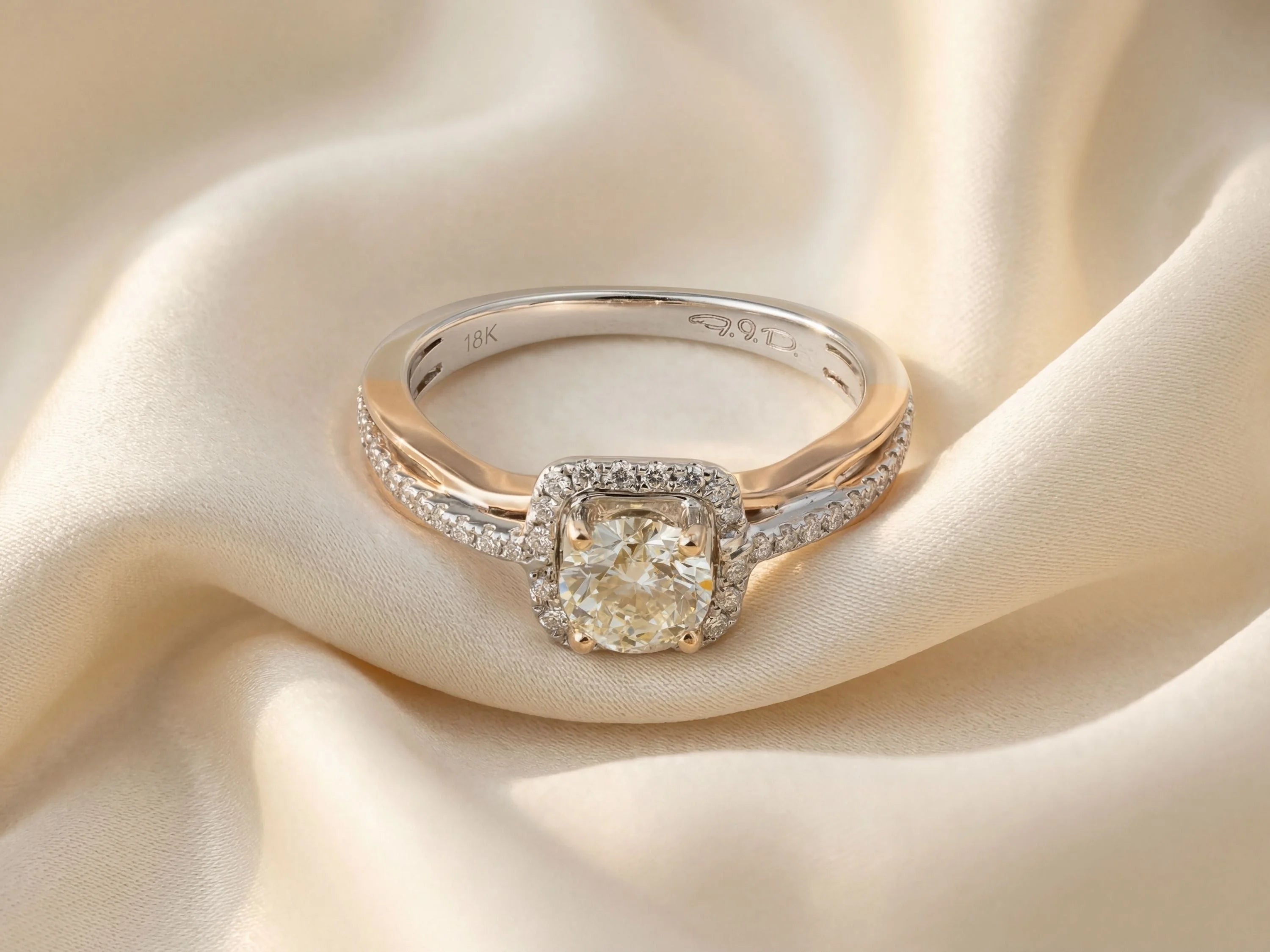 A: The combination of 18k white and rose gold creates visual depth and warmth. The rose gold band complements all skin tones beautifully, while the white gold setting ensures maximum diamond brilliance.