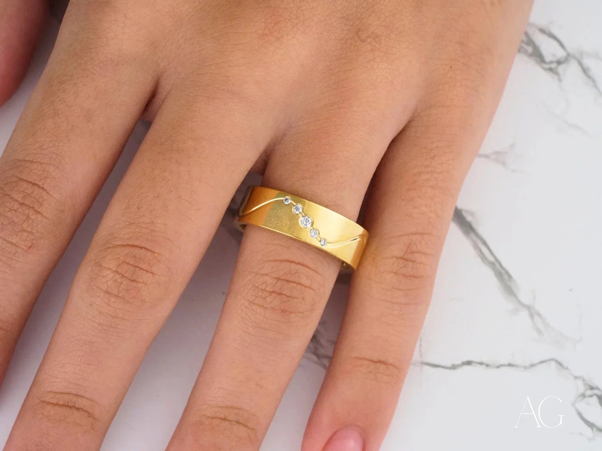 Capture the timeless elegance of your love story with the Eternal Wave: Timeless 18k/14k Gold Wedding Band with Diamonds. This exquisite band, featuring five dazzling half-point diamonds dancing along its sleek wave design, embodies the enduring strength and beauty of your commitment. Available in both luxurious 18k and durable 14k yellow gold, the Eternal Wave offers unparalleled comfort and a radiant sparkle that will last a lifetime.