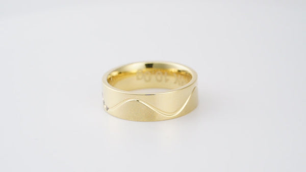 Five Half-Point Diamonds: These meticulously set diamonds, nestled within the elegant wave lines, add a touch of brilliance and luxury, catching the light with every movement and symbolizing the precious moments you share.Iconic Wave Design with Diamond Accent: The flowing wave design of this Eternal Wave wedding band artfully represents the continuous journey of love, its ebb and flow, while the diamonds illuminate the beauty of each crest and trough, signifying the precious milestones along the way.Unparalleled Comfort Fit: Crafted with a smooth inner curve, the Eternal Wave ensures a comfortable, barely-there feel, making it perfect for everyday wear, a constant reminder of your enduring bond.Choice of 18k or 14k Yellow Gold: Select the opulent richness of 18k gold for a truly luxurious feel, or opt for the enduring strength of 14k gold, ideal for those with an active lifestyle. Both options offer the timeless beauty of yellow gold, a symbol of enduring love.Timeless Unisex Design: The Eternal Wave's classic elegance transcends gender, making it the perfect choice for both partners. Its understated sophistication complements any style and symbolizes the unity of your love.Durable and Elegant Craftsmanship: Meticulously crafted to withstand the test of time, the Eternal Wave maintains its polished finish and diamond brilliance, ensuring that its beauty endures as long as your love.