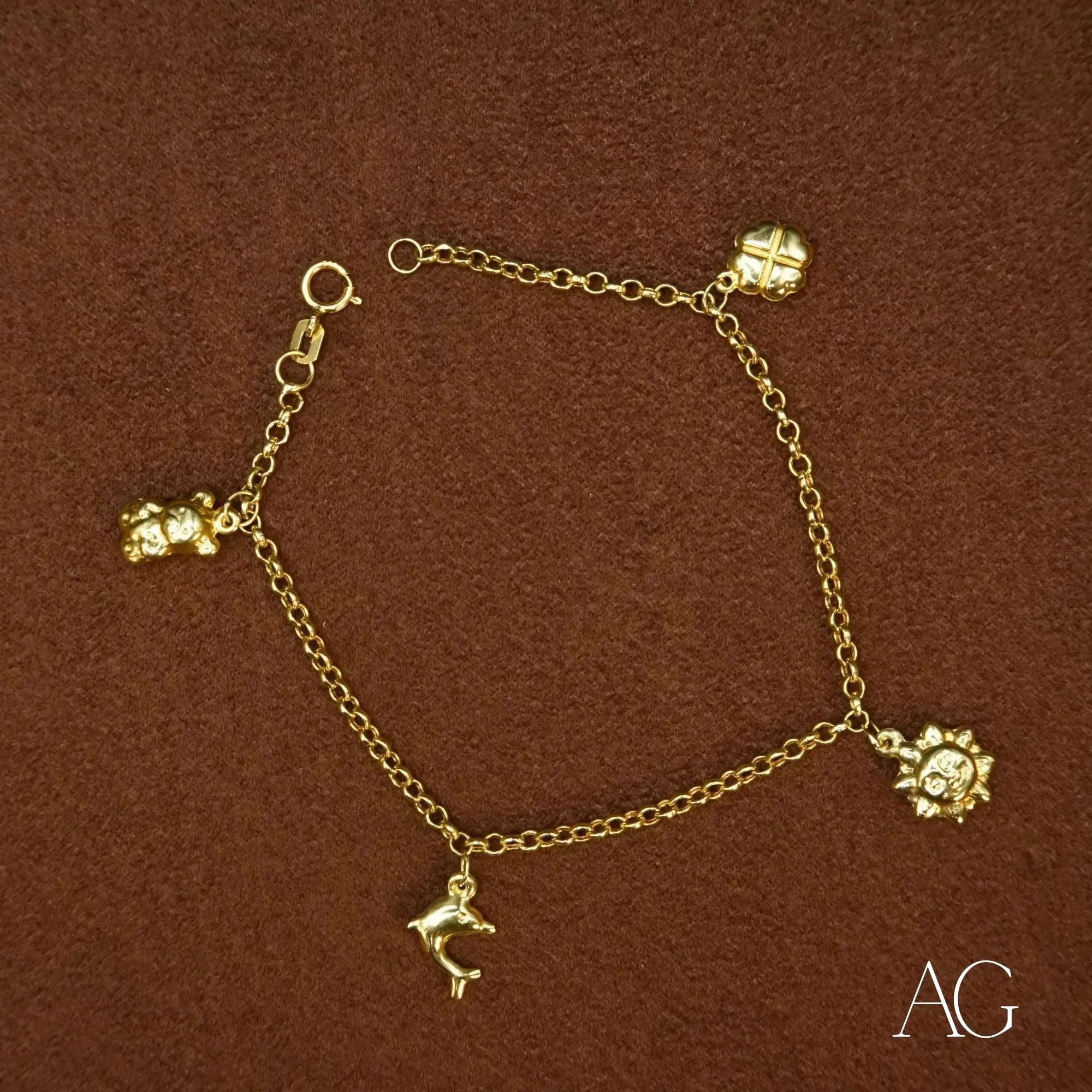 Whimsical 18k Gold Charms: Each charm, a miniature work of art gold, is lovingly crafted from radiant 18k gold. These playful yet precious details transform this bracelet from a simple accessory into a treasured keepsake filled with wonder. Imagine tiny stars, playful animals, or delicate hearts, each whispering a story of childhood dreams.Designed for Playful Adventures: Crafted with the boundless energy of children in mind, this 18k gold charm bracelet is lightweight and comfortable for all-day wear. Its durable construction ensures it can withstand the rigors of playtime, from playground adventures to tea parties with teddy bears.A Gift that Grows with Love: Featuring a secure clasp and adjustable length, this bracelet is designed to grow with your child, becoming a cherished part of their journey. This timeless piece of art gold jewelry is an investment in lasting memories, a symbol of love that can be passed down through generations.