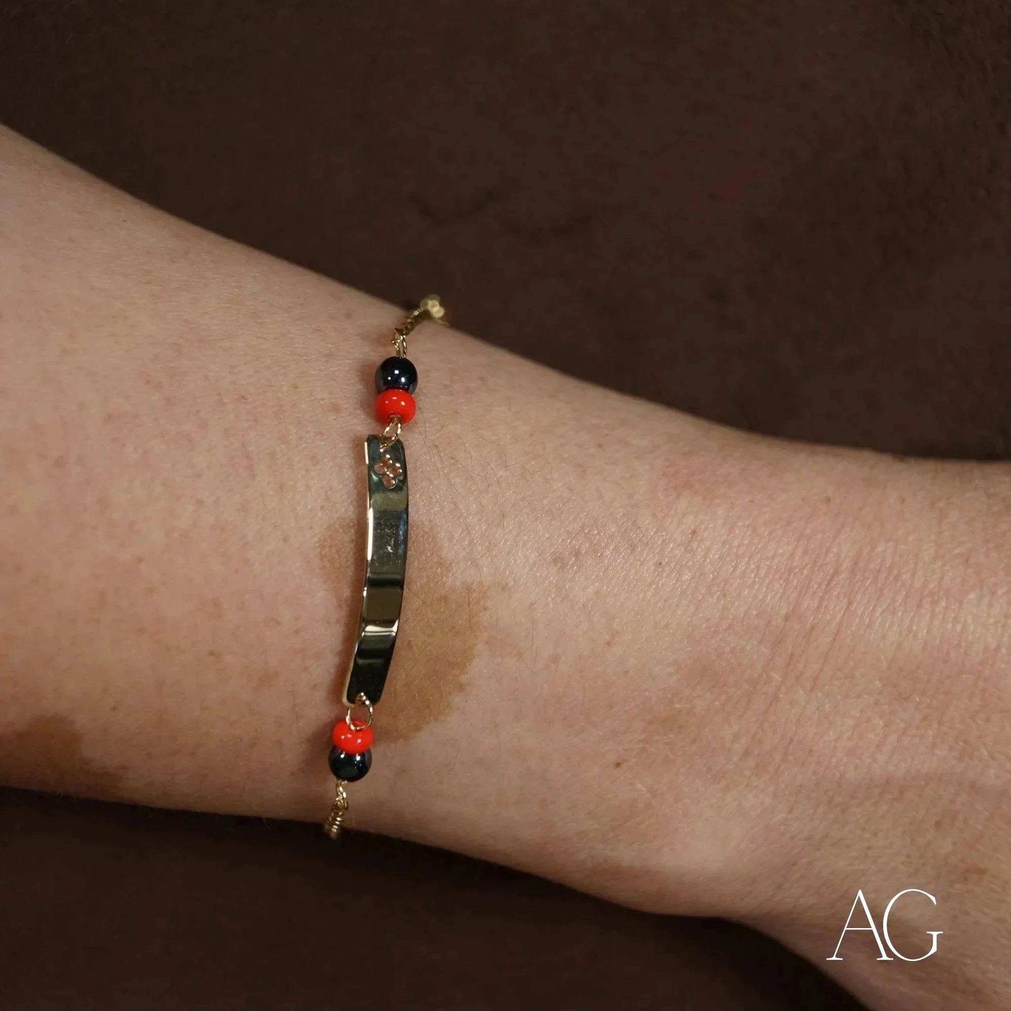 Unique Black Coral Adornment: Revered for its protective qualities across cultures, the deep, lustrous black coral adds a touch of mystique and elegance. Ethically sourced to ensure sustainability, each piece of coral is unique, adding to the bracelet's bespoke nature. This art gold piece is more than an accessory; it’s a wearable talisman.Customizable Luck Symbol: Transform this 18k gold personalized bracelet into a one-of-a-kind heirloom. Choose a symbol that resonates deeply – a traditional charm, a cherished cultural emblem, a family crest, or even a miniature initial. This personal touch elevates the bracelet to a powerful symbol of connection and belonging.Lightweight and Comfortable: Crafted for carefree wear, the lightweight design ensures comfort throughout the day. Children can play, learn, and explore unhindered, while the durable 18k gold construction promises this cherished piece will withstand the test of time.