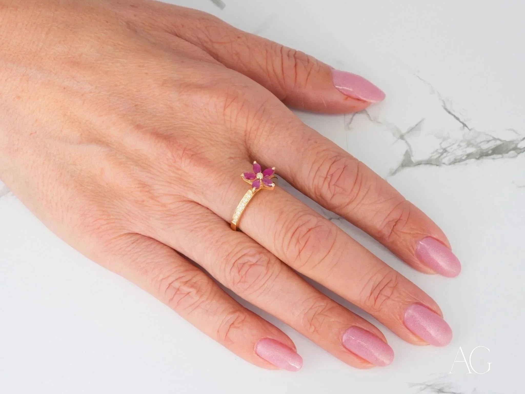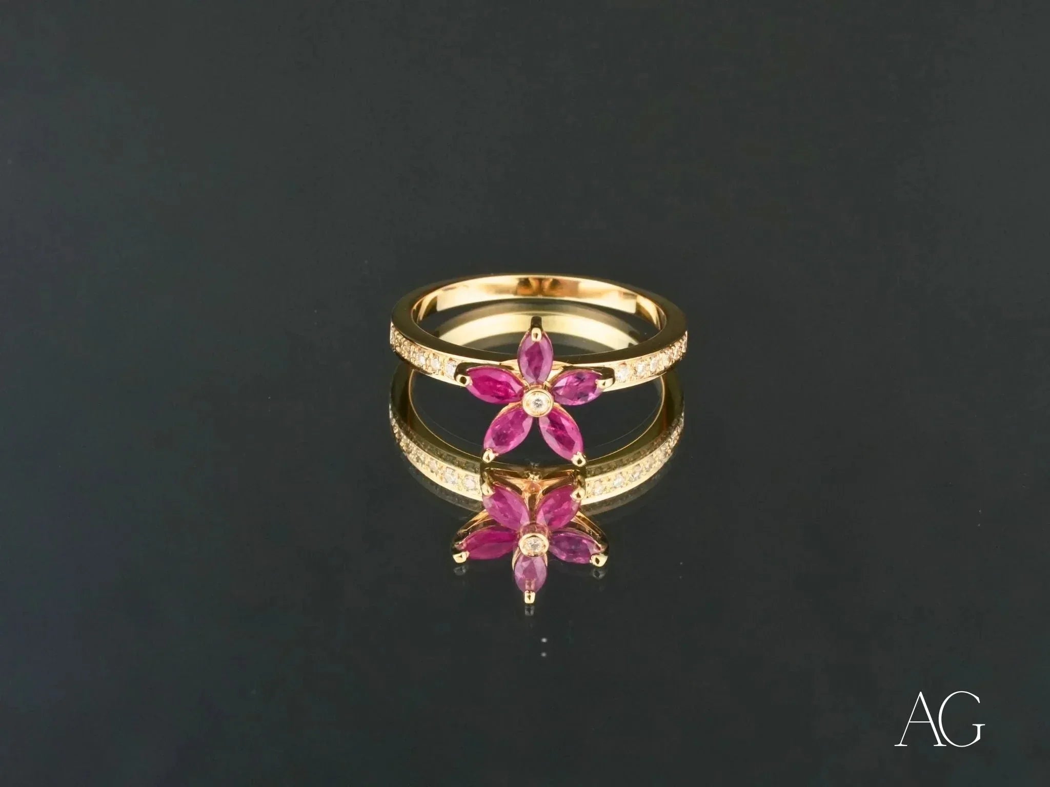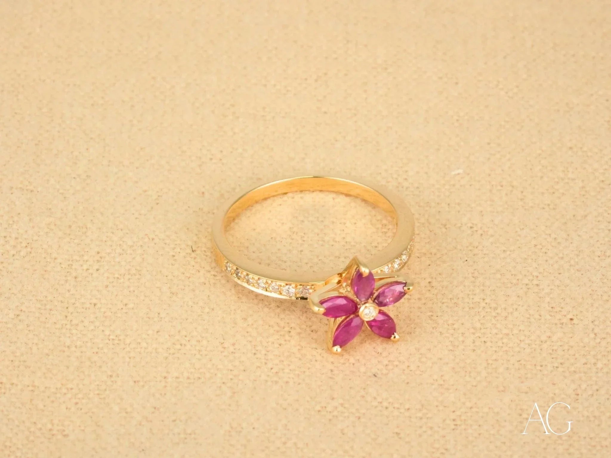 • Genuine Ruby Flower Design: Five vibrant marquise-cut rubies, meticulously selected for their rich color and clarity, form a captivating floral motif, symbolizing passion and enduring love. This gold ruby flower design is truly unique.