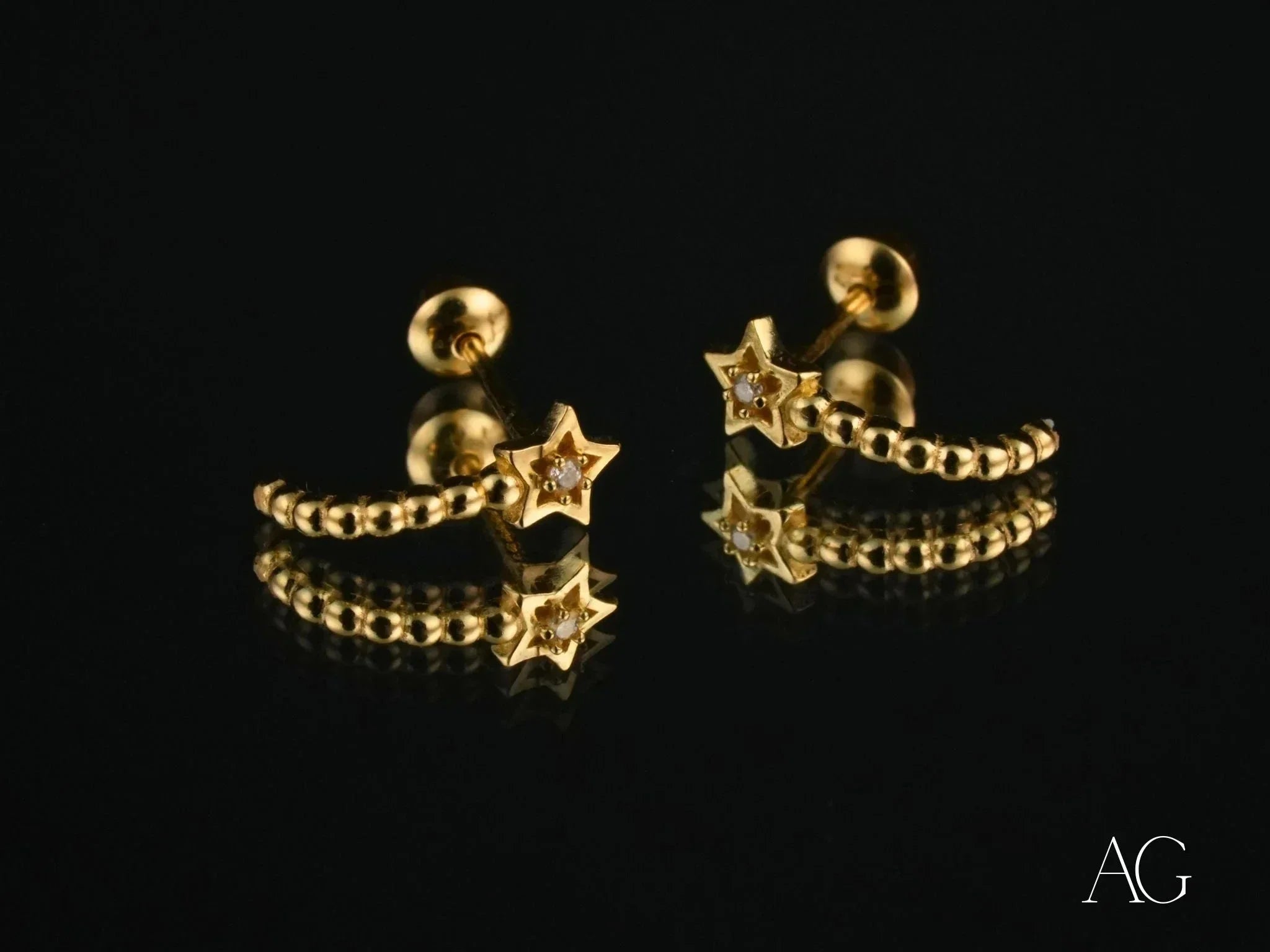 Unleash your inner radiance and shine like the cosmos with the Celestial Glow: 18k Gold Star Earrings. These exquisite earrings, featuring a delicately beaded crescent embracing a radiant star, are meticulously crafted from high-quality 18k gold. Their featherlight 0.6-gram weight ensures effortless all-day wear, adding a celestial touch of elegance to any ensemble. Perfect for elevating your everyday style or adding a touch of magic to special occasions, these gold star earrings are more than just jewelry – they're a statement of your unique brilliance.