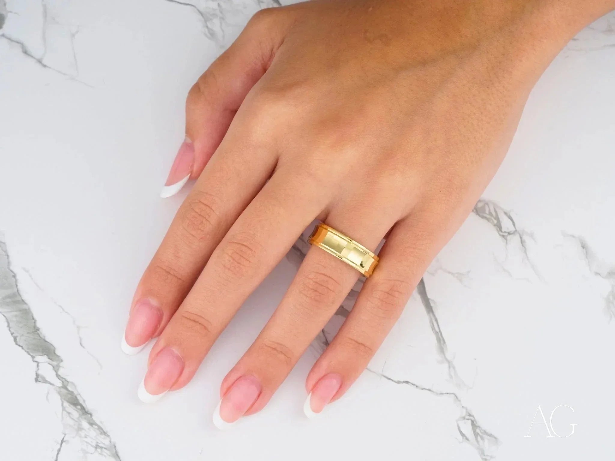 Cascading Faceted Design: This isn't just texture; it's artistry. The multi-faceted surface creates a dynamic interplay of light and shadow, ensuring your ring sparkles with every gesture, captivating all who behold it. This signature Golden Cascade design is a testament to Art Gold Jewelry's commitment to exquisite craftsmanship.7.1mm Wide Band: Make a statement of enduring love with the bold yet refined 7.1mm width. This substantial band commands attention without overwhelming the hand, offering a perfect balance of presence and grace.Available in 18k or 14k Gold: Indulge in the rich, warm glow of 18k gold, renowned for its luxurious purity, or opt for the enduring strength and resilience of 14k gold – a perfect choice for those with active lifestyles. Both options offer the timeless allure of gold, ensuring your Golden Cascade band remains a cherished symbol for generations to come.Comfort Fit: Experience unparalleled comfort with the thoughtfully designed comfort fit. This feature ensures the ring rests seamlessly on your finger, providing all-day wearability and allowing you to cherish this symbol of love without compromise.Timeless Elegance: The Golden Cascade transcends fleeting trends. Its classic design and radiant brilliance embody enduring love and sophistication, making it a treasured heirloom that will be passed down through generations.